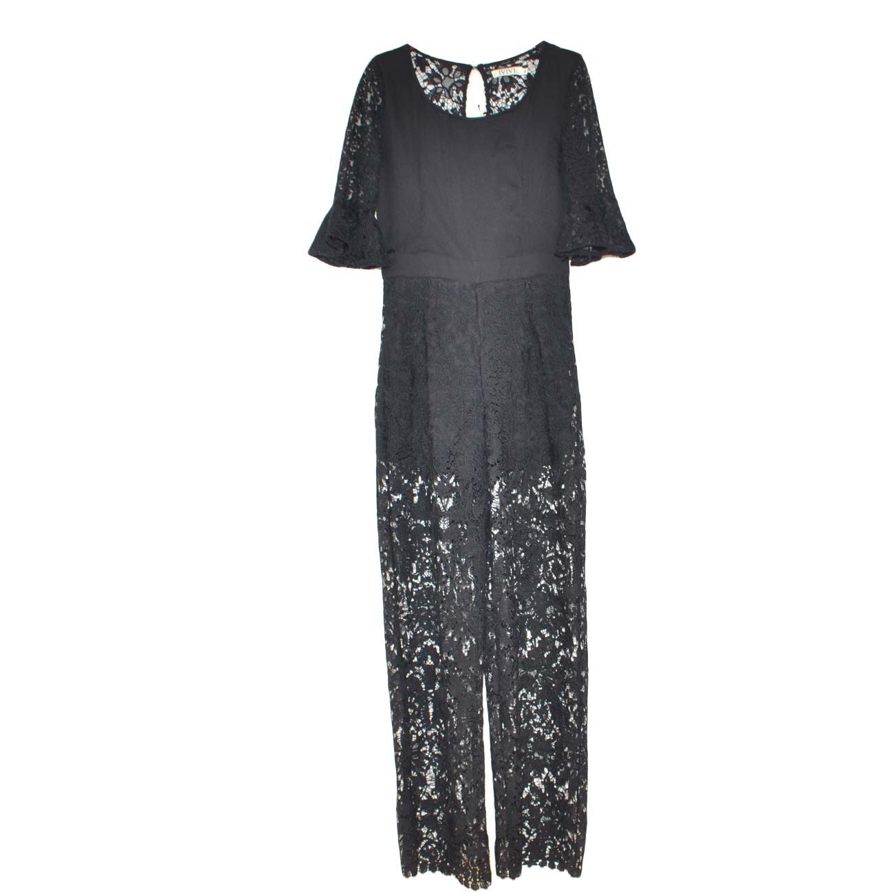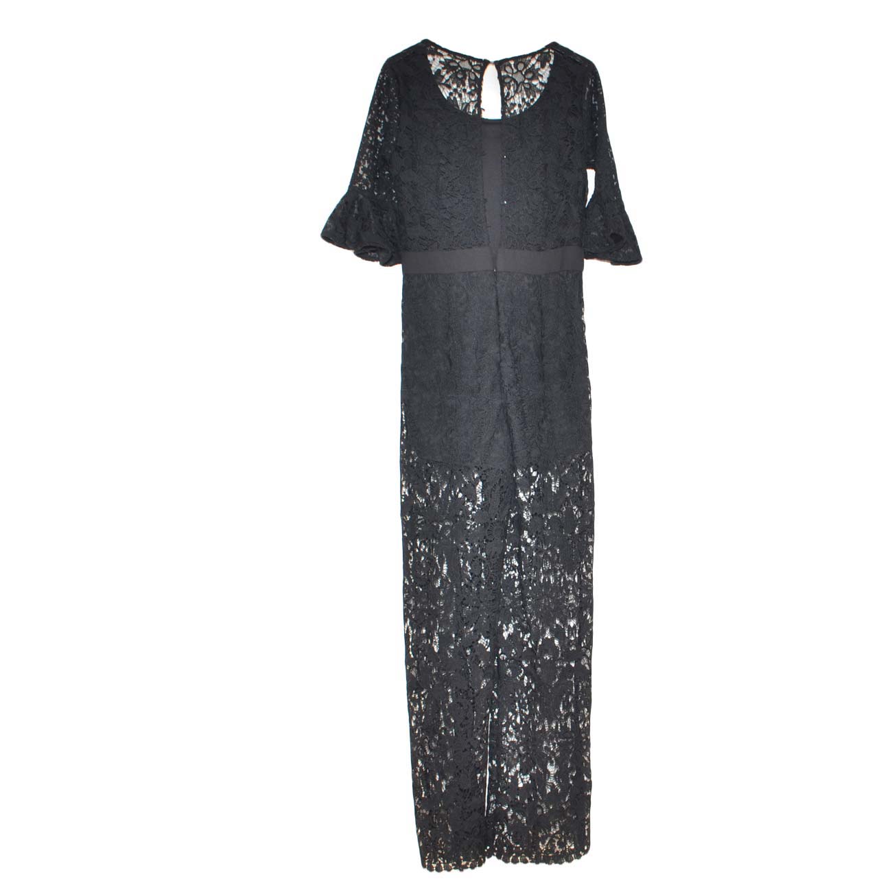 Tuta donna nera lunga in pizzo a manica corta con pantaloni palazzo trasparenti chiusura zip sim fit moda shabby