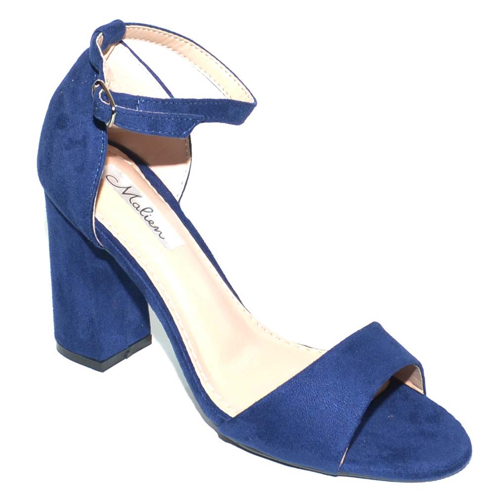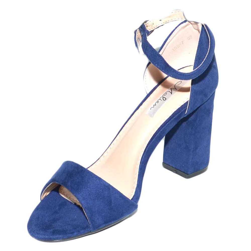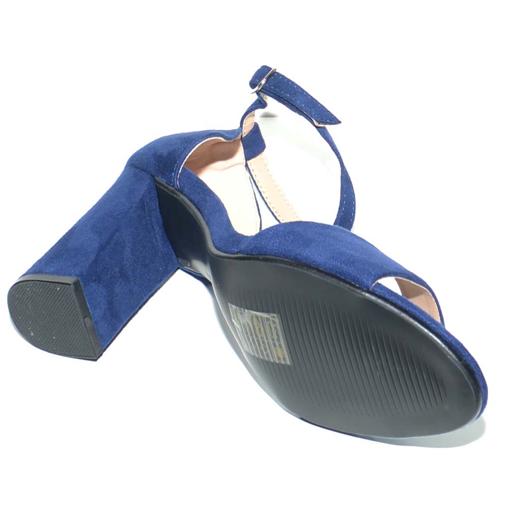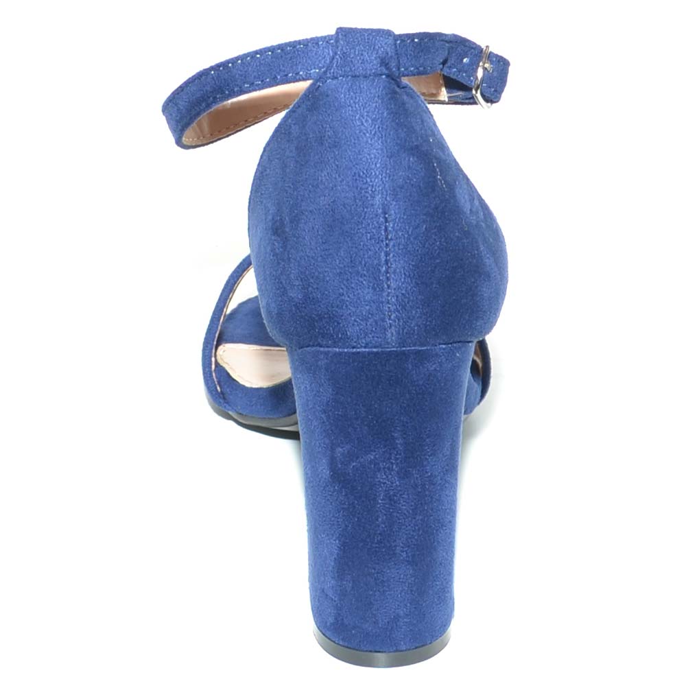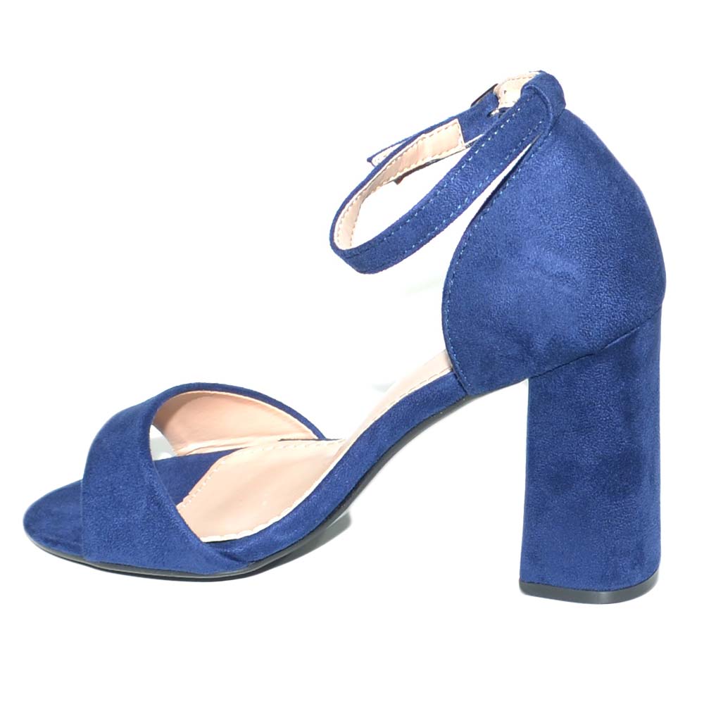 Sandalo tacco in camoscio blu con sottopiede imbottito e tacco doppio comfort. Il sandalo è un modello intramontabile estremamente femminile con tacco largo e cinturino spesso a chiusura fibbia. Una scarpa comoda grazie ai materiali di qualità dalla linea semplice e glamour . Una calzatura perfetta con abbigliamento formale, ma adatta anche alla donna glamour che non rinuncia alla propria femminilità nemmeno quando indossa outfit più pratici.