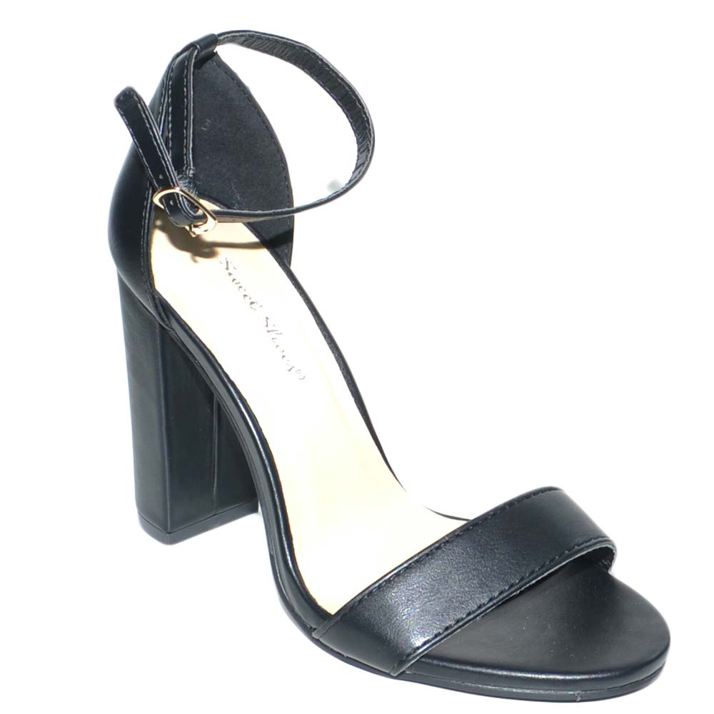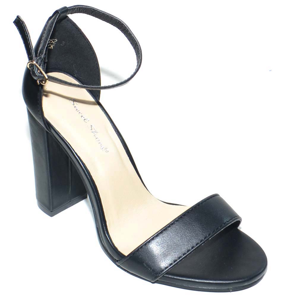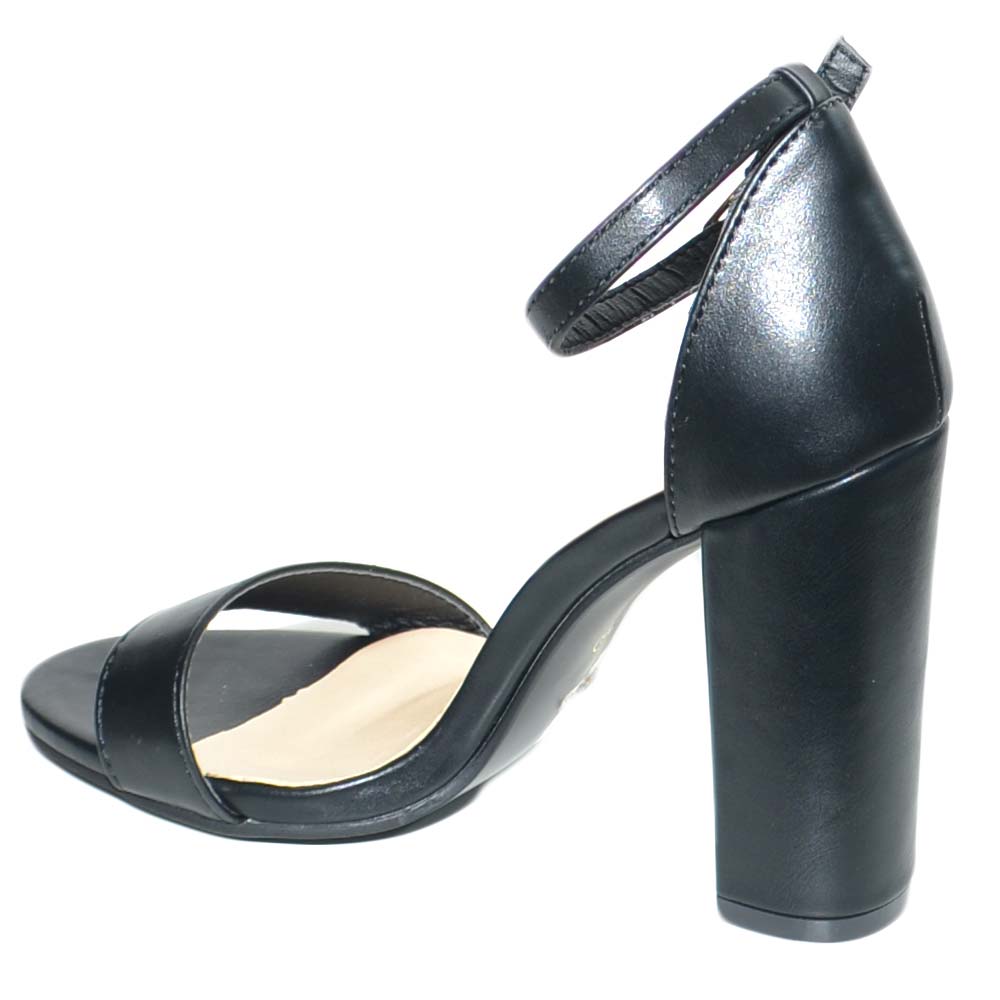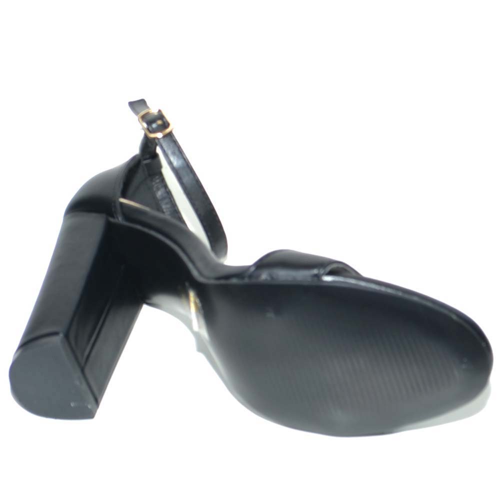 Sandalo tacco comfort aperto in pelle nera con tacco largo e cinturino alla caviglia glamour moda