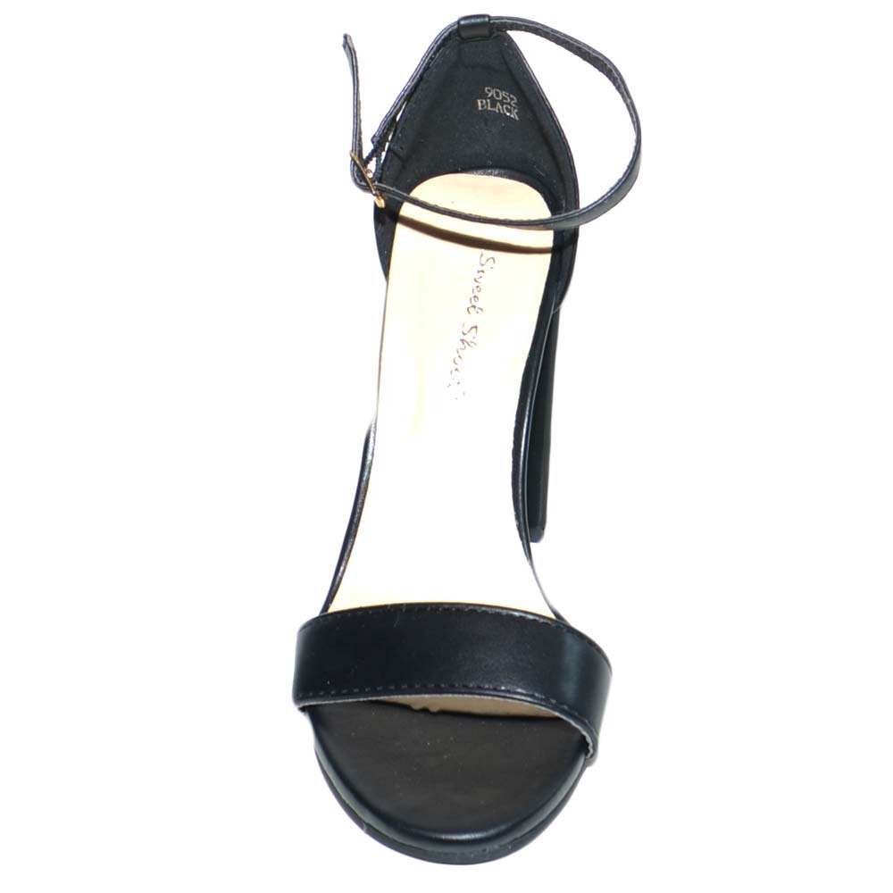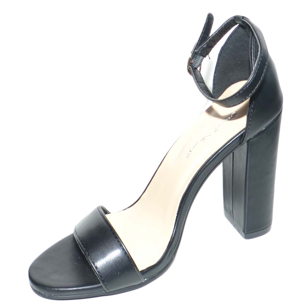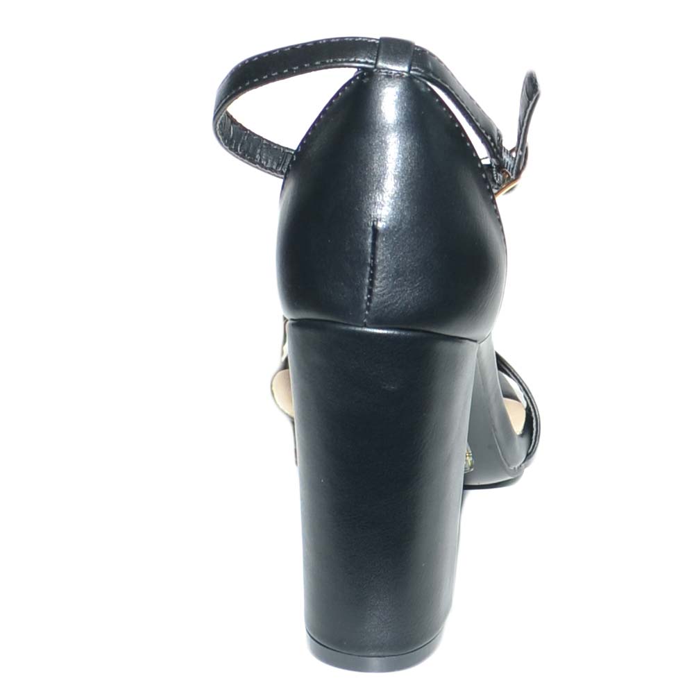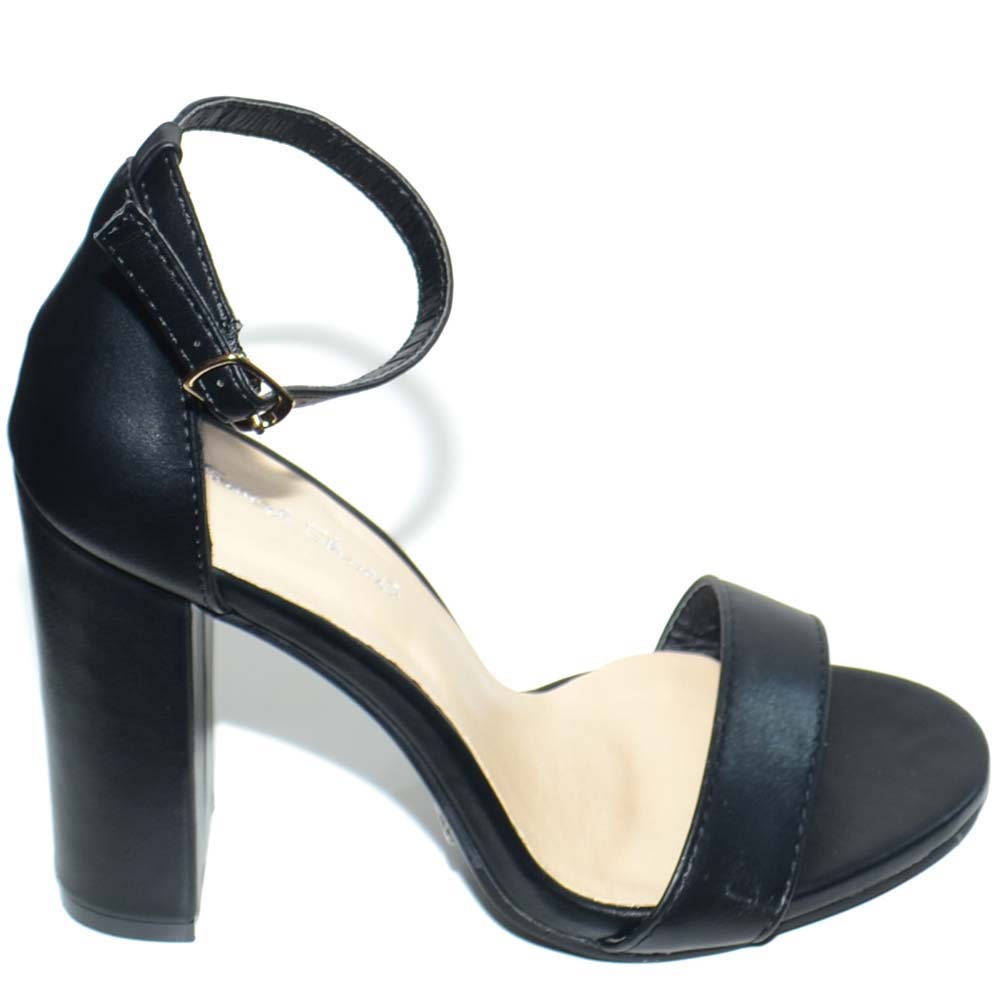 Sandalo tacco comfort aperto in pelle nera con tacco largo e cinturino alla caviglia glamour moda