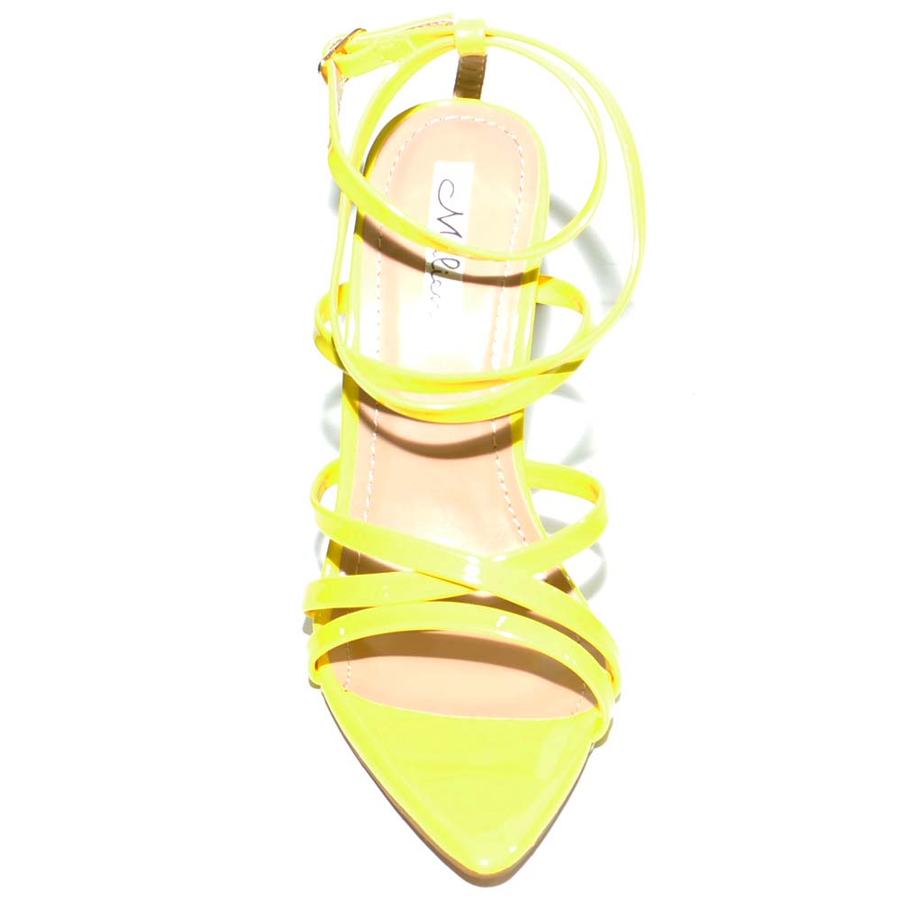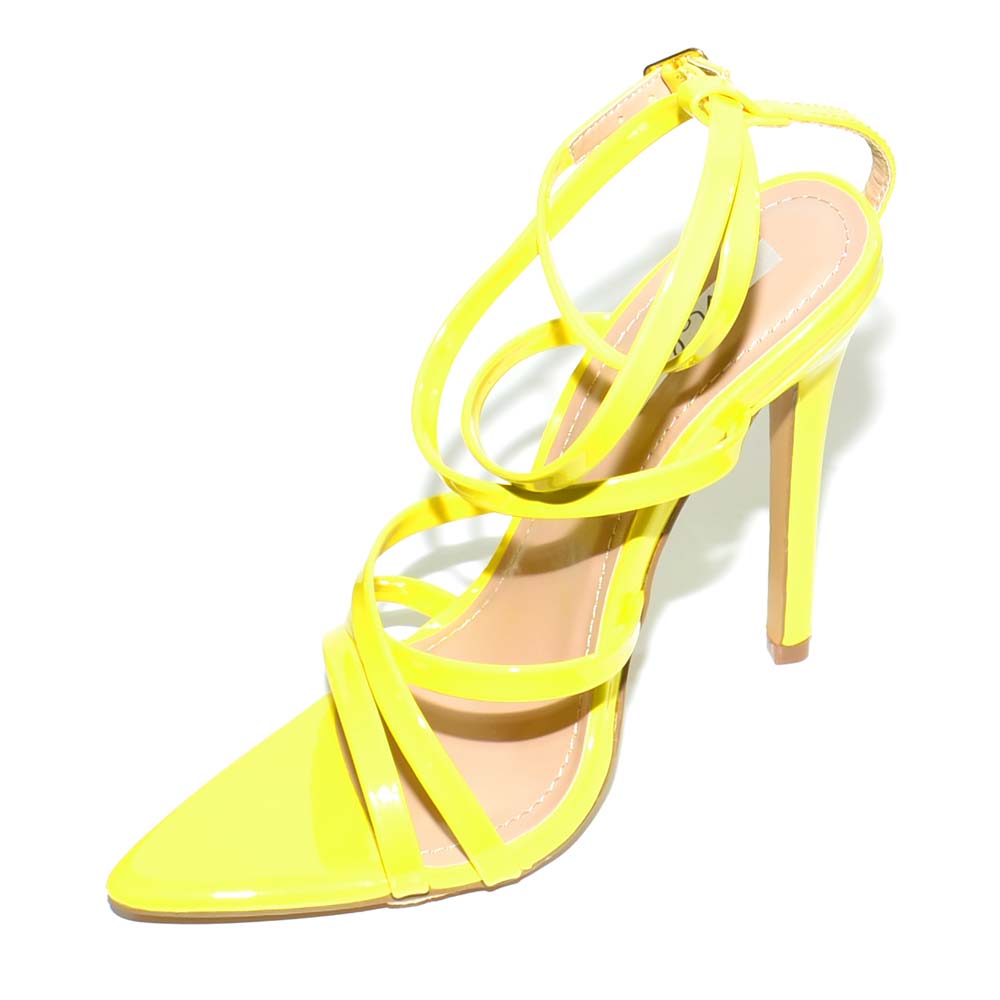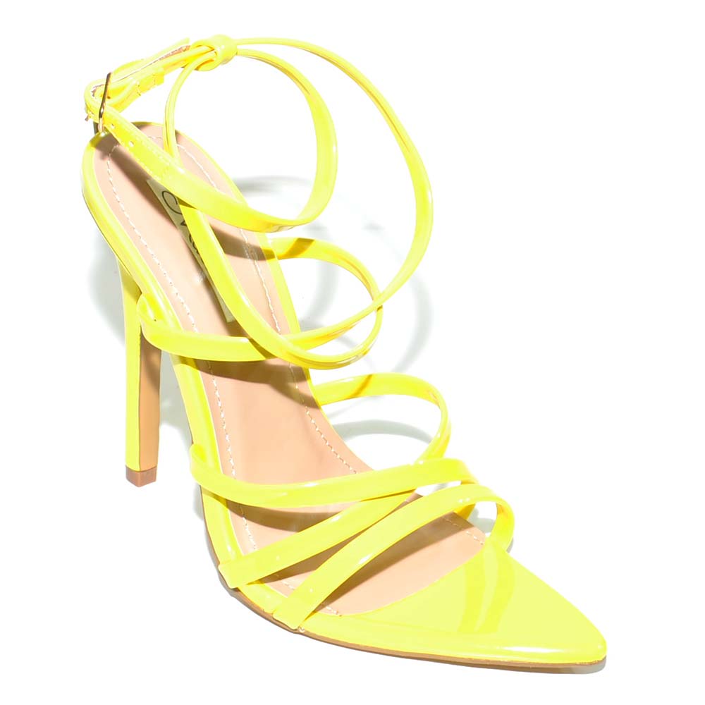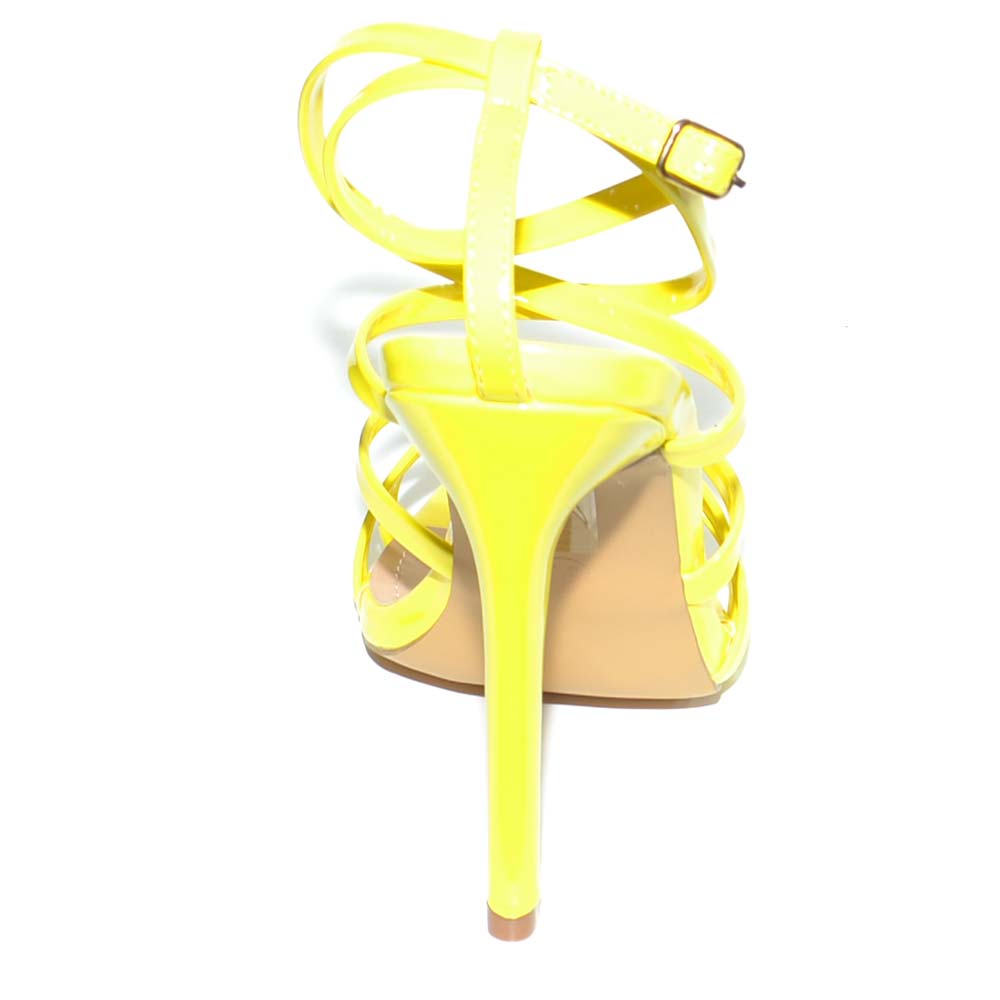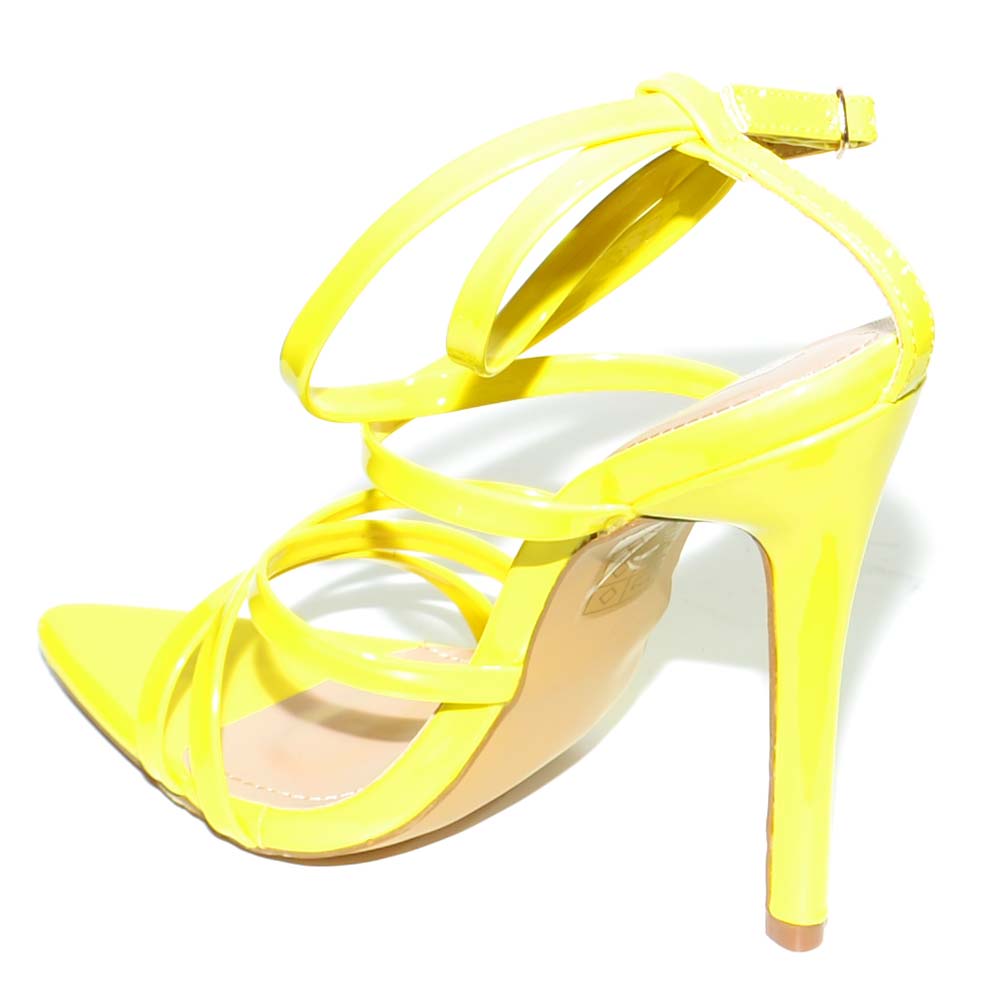 Sandalo donna giallo lucido con tacco a spillo e fascette incrociate cinturino alla caviglia moda elegante fondo a punta