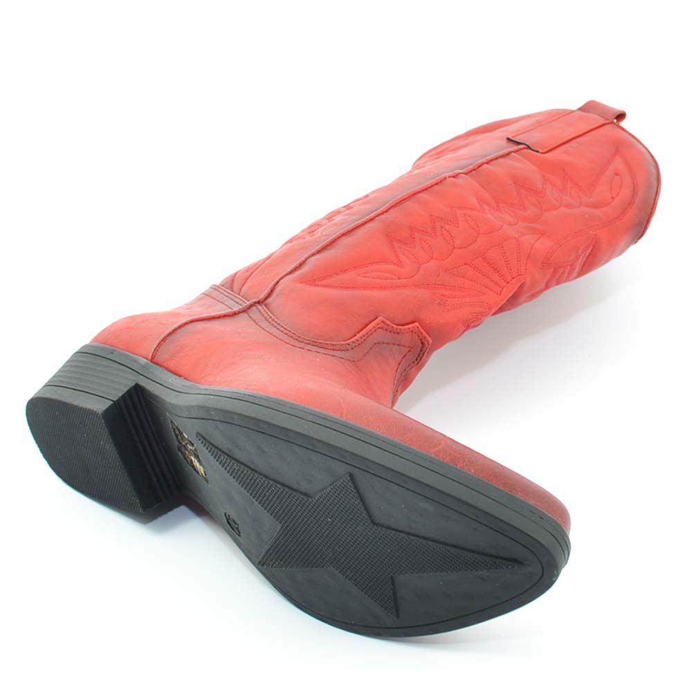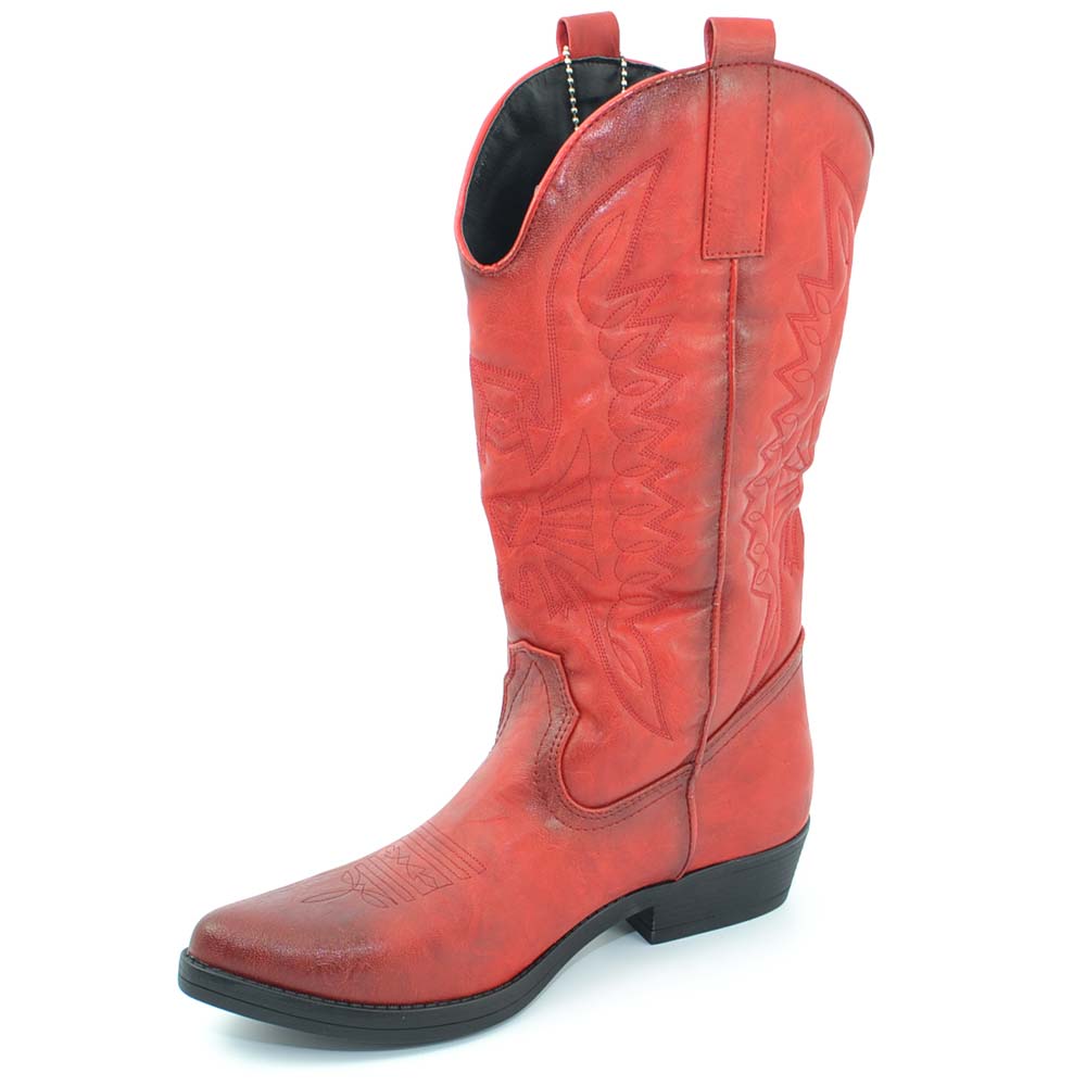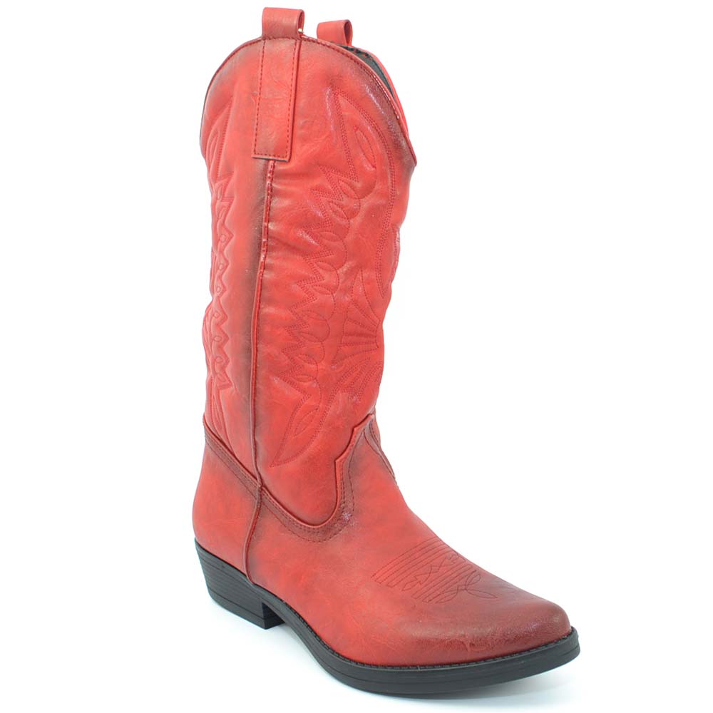 Stivali donna camperos texani stile western rossi con cucitura laser su pelle tinta unita altezza polpaccio