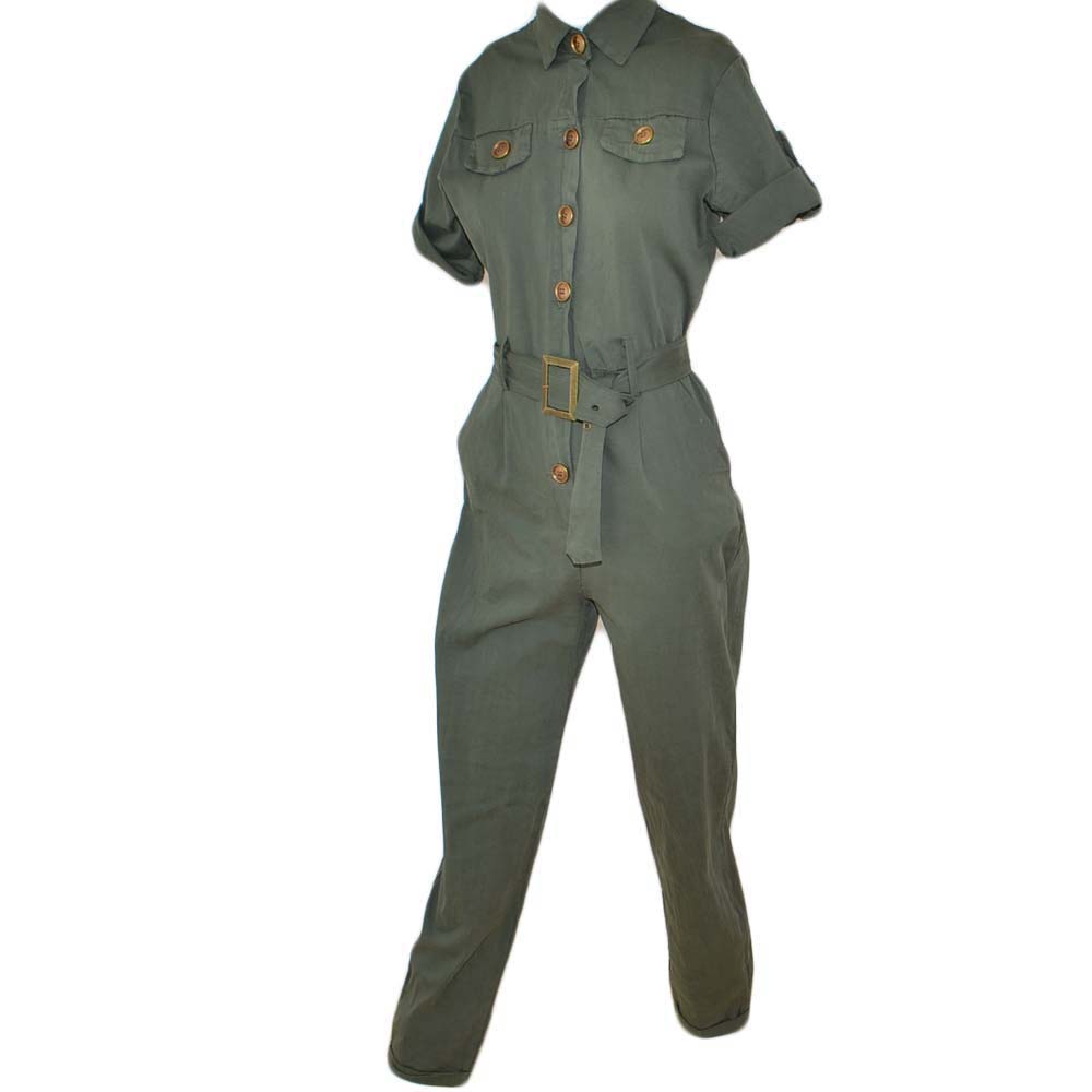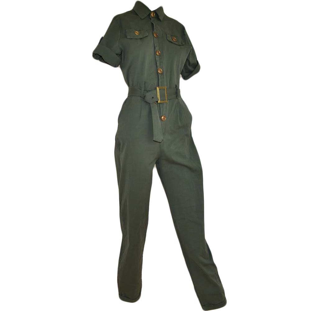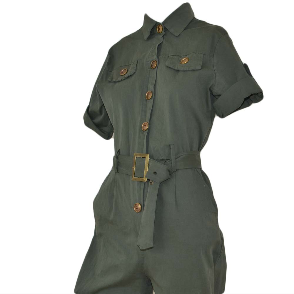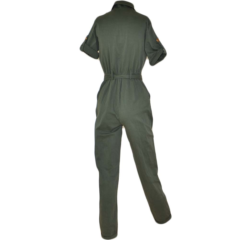 Tuta donna verde militare intera jumpsuit manica corta pantalone slim-fit bottoni sul busto cinturone in vita