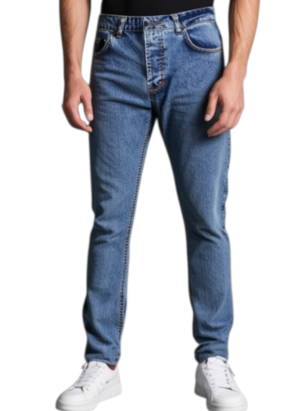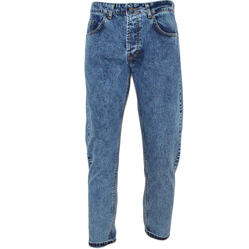Jeans uomo slim tapered con cintura regolare, tasche anteriori e posteriori, chiusura con bottoni e passanti per cintura.