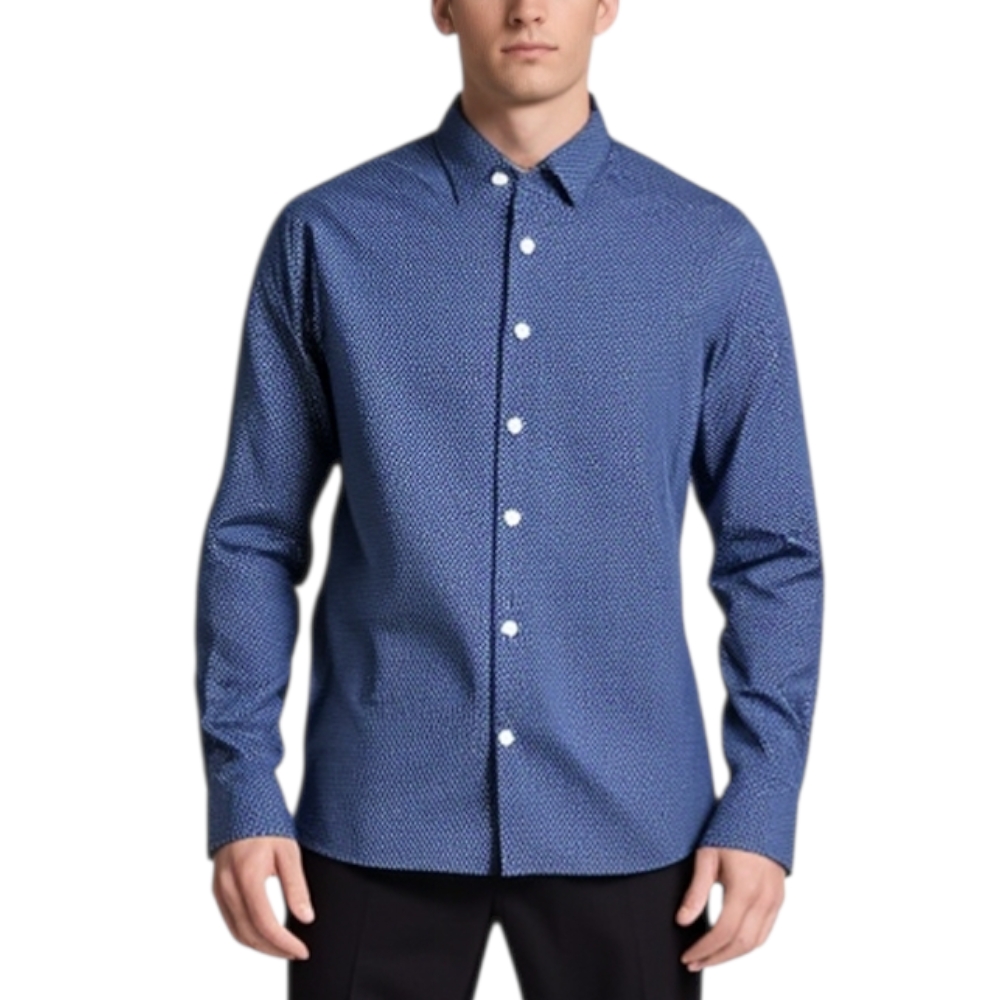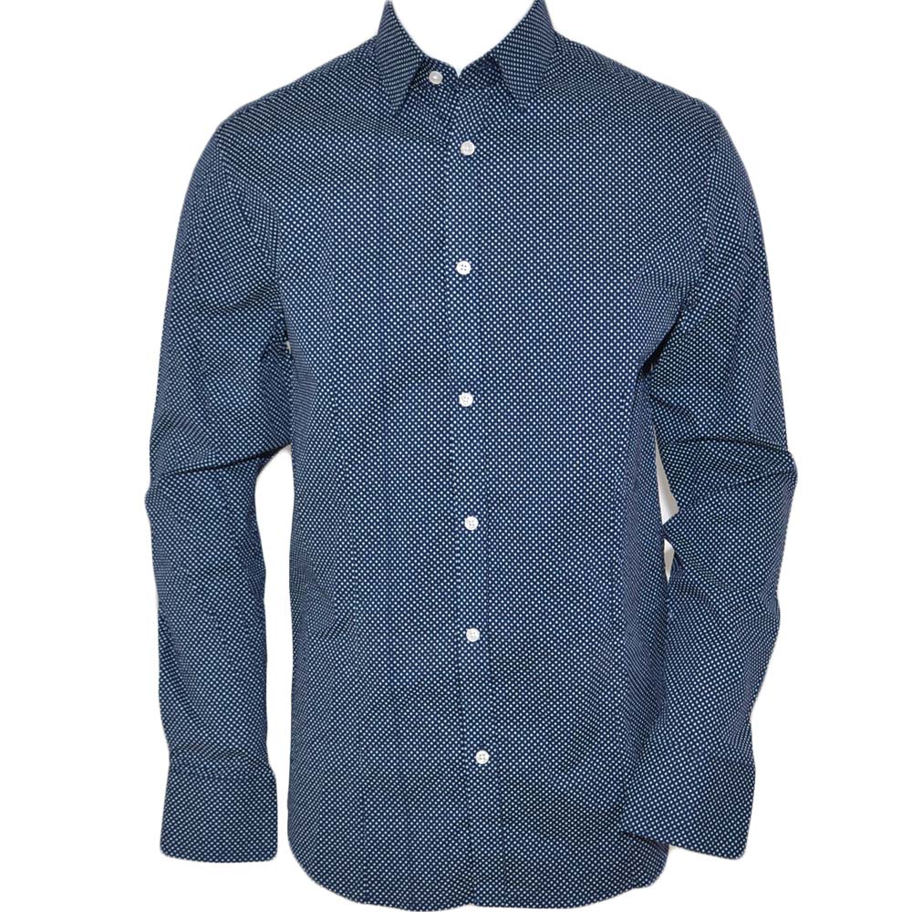 Camicia uomo cotone blu collo rigido manica lunga motivo astratto blu notte chiusura bottoni moda