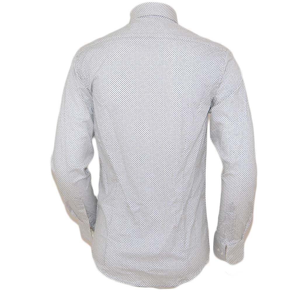 Camicia uomo cotone bianco pois collo rigido manica lunga motivo astratto blu chiusura bottoni moda