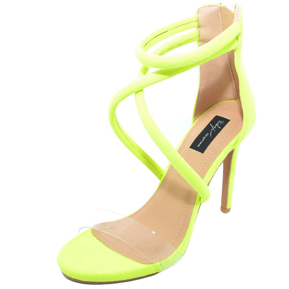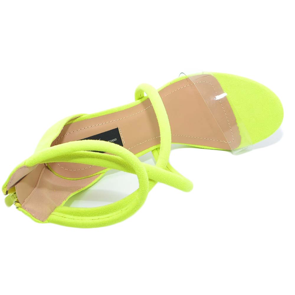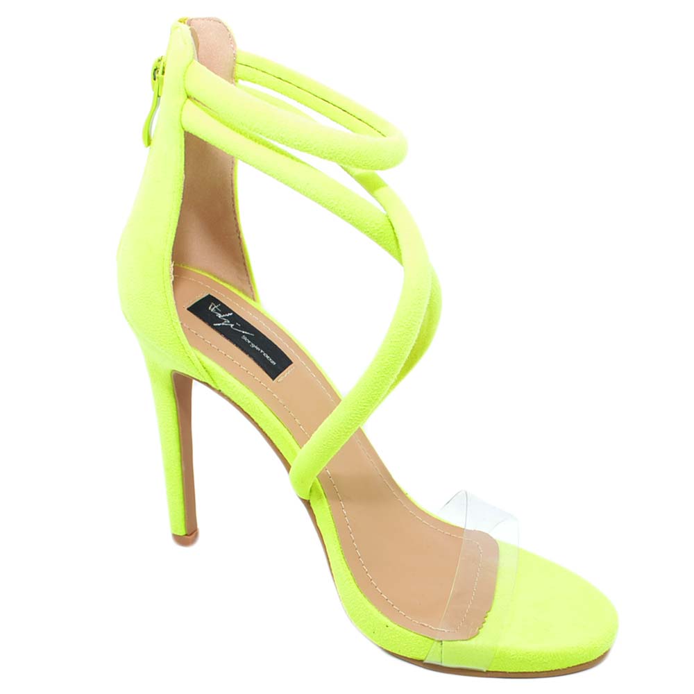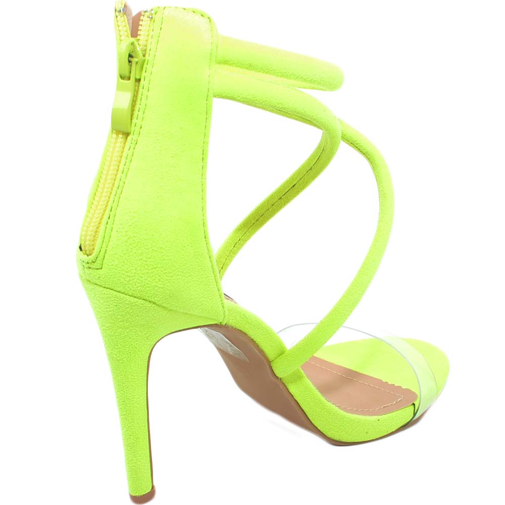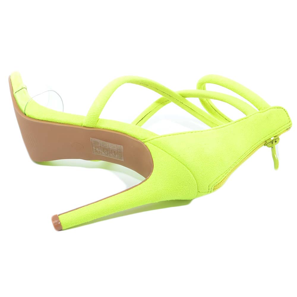 Sandalo alto giallo fluo in camoscio con tacco a spillo, suola di gomma. La fascetta è decorata con strass sulla fascetta. La chiusura è dotata di un cinturino attorno alla caviglia. E' la calzatura adatta per la stagione più calda per la donna che vuole essere elegante senza essere eccessiva. Indicato per cerimonie.