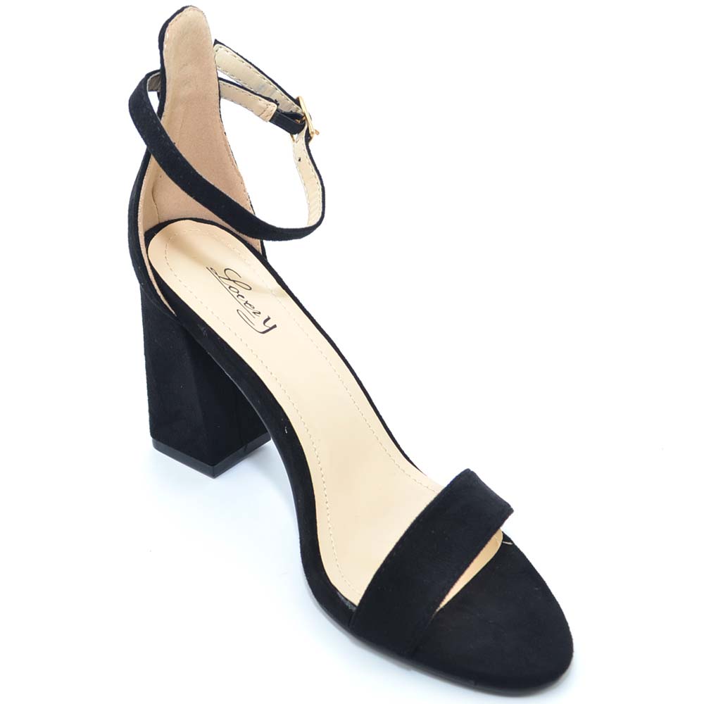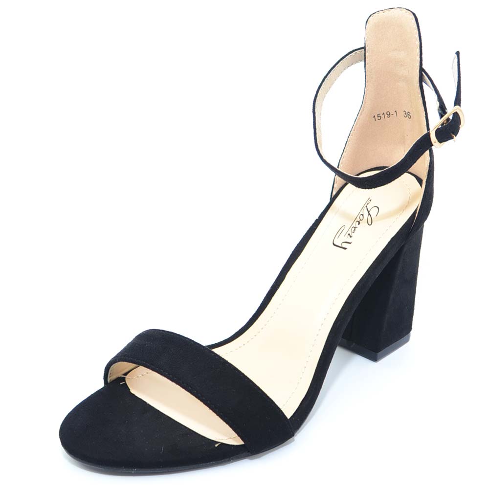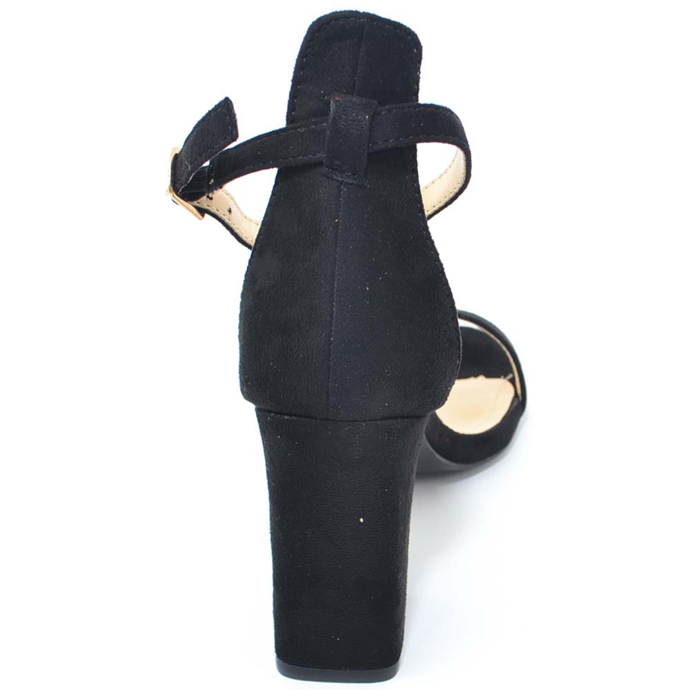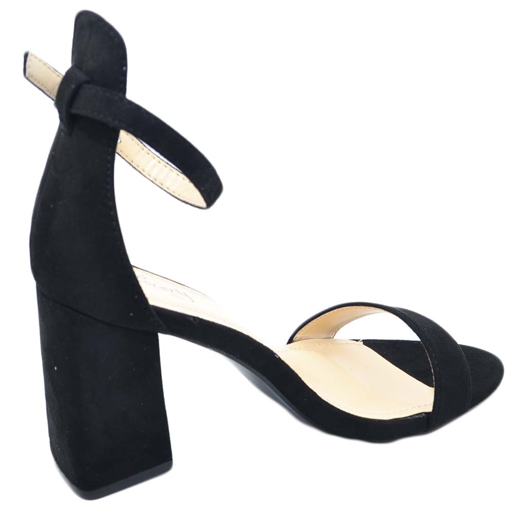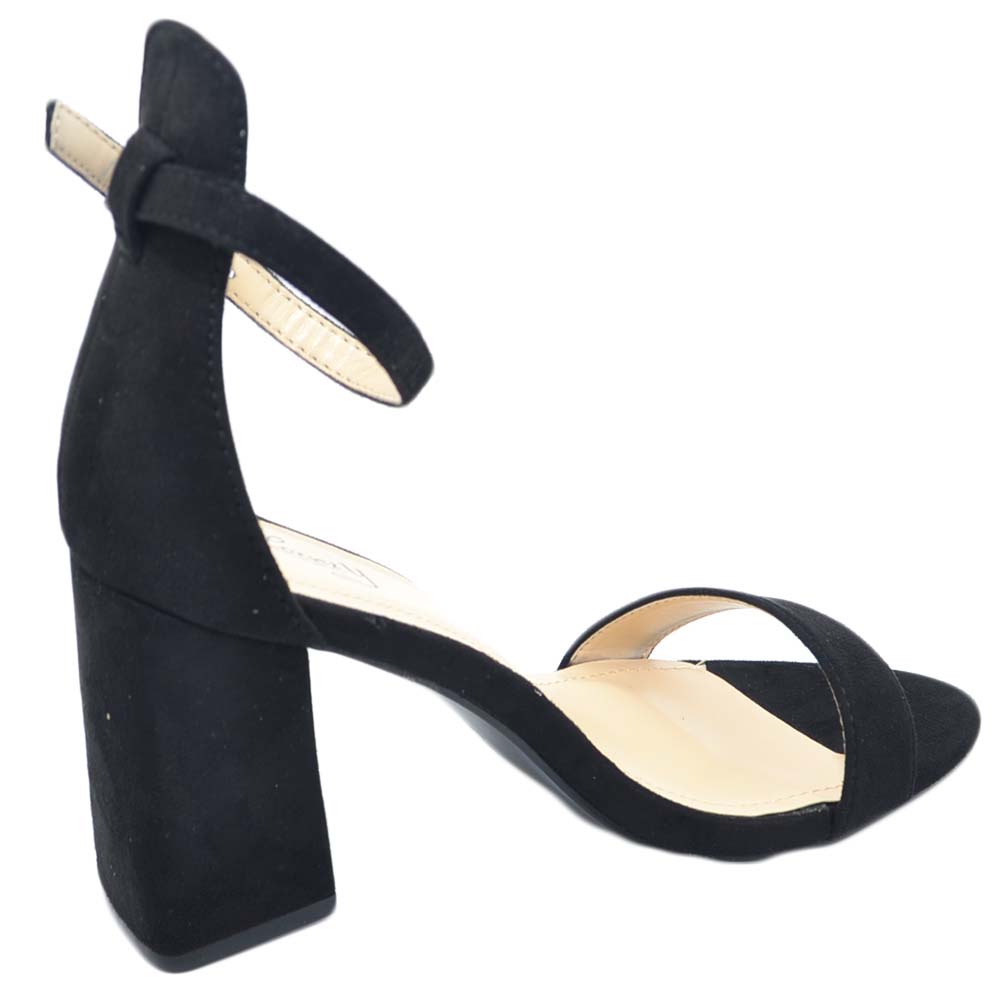 Sandalo donna nero in ecopelle scamosciato tacco largo asimmetrico alto 8 cm cinturino alla caviglia linea basic moda
