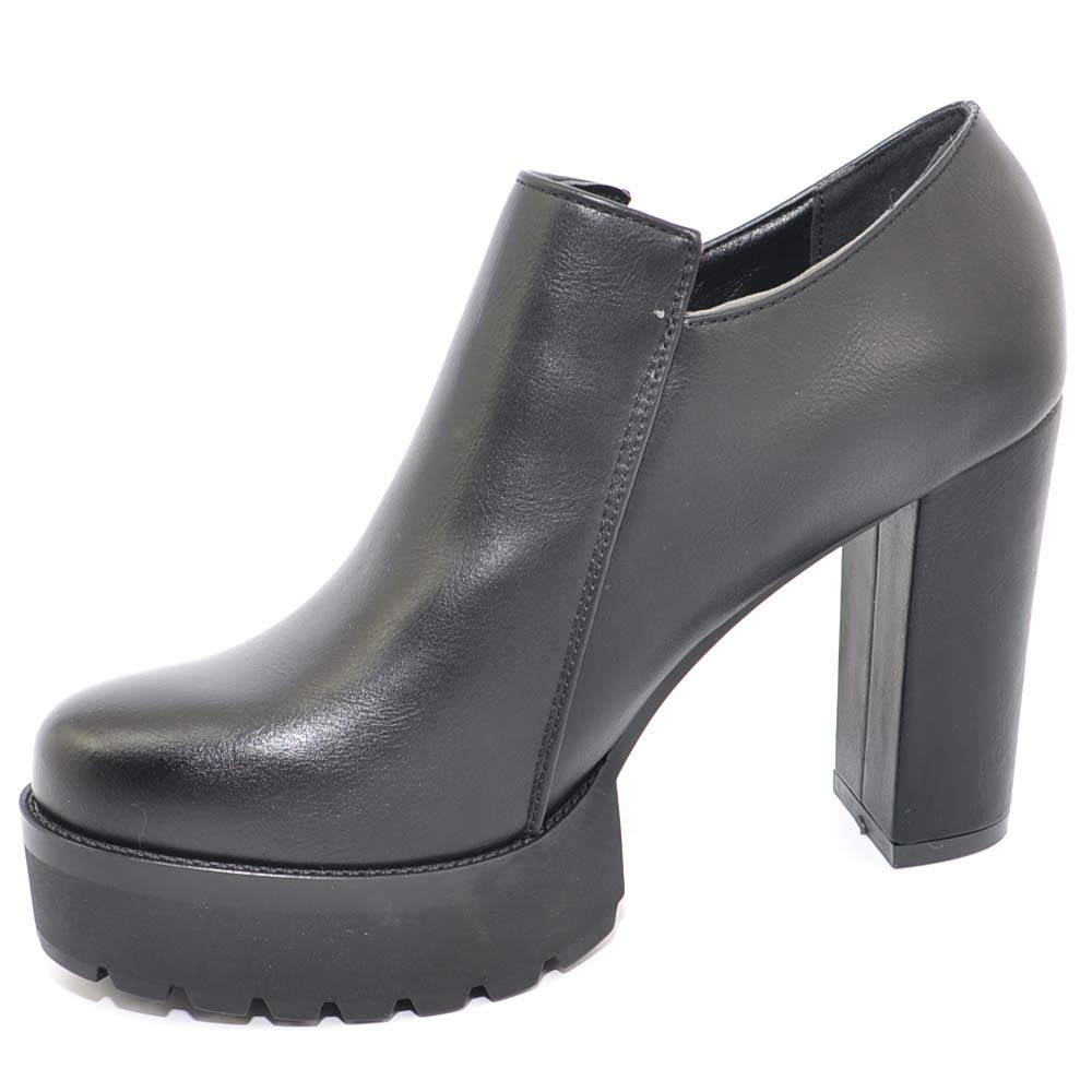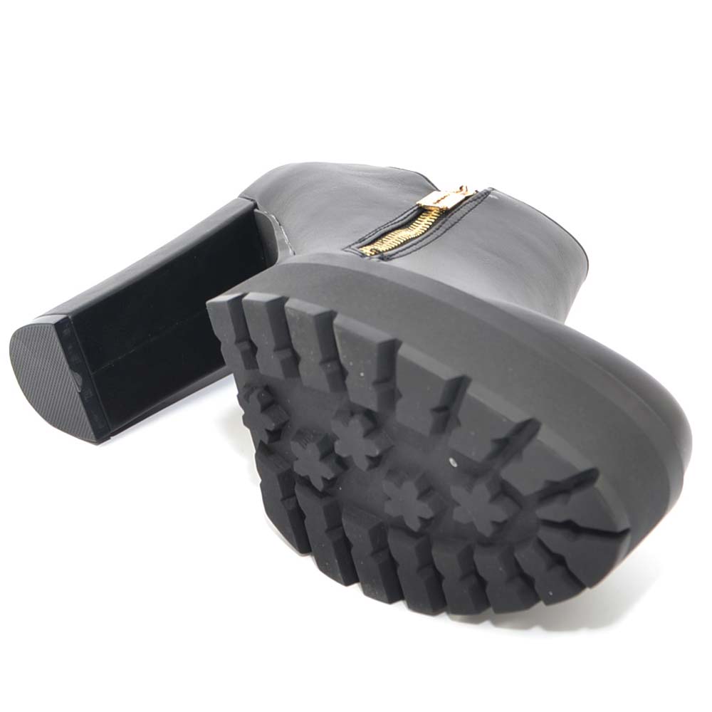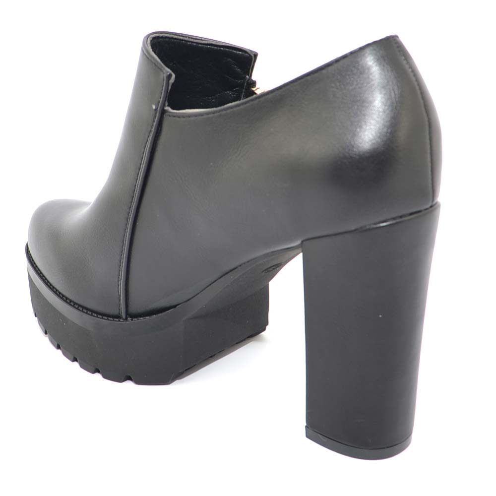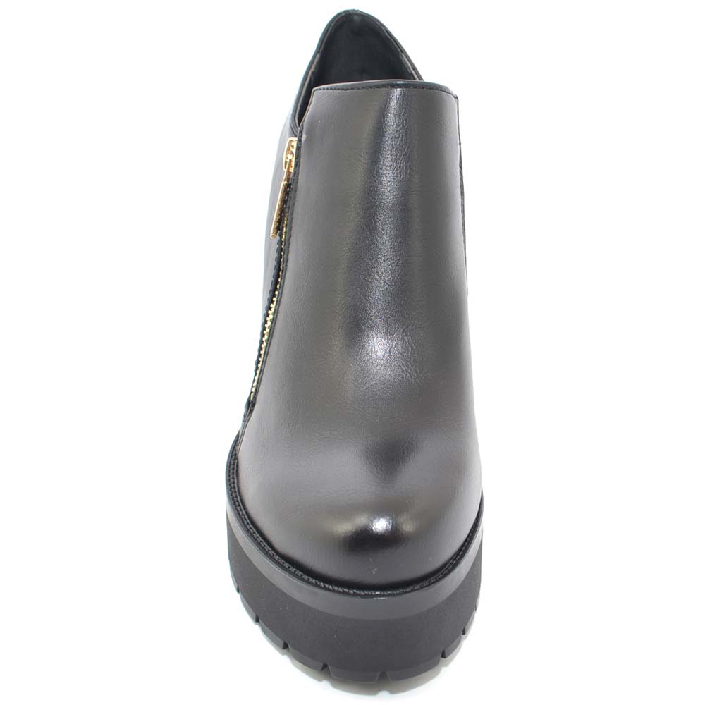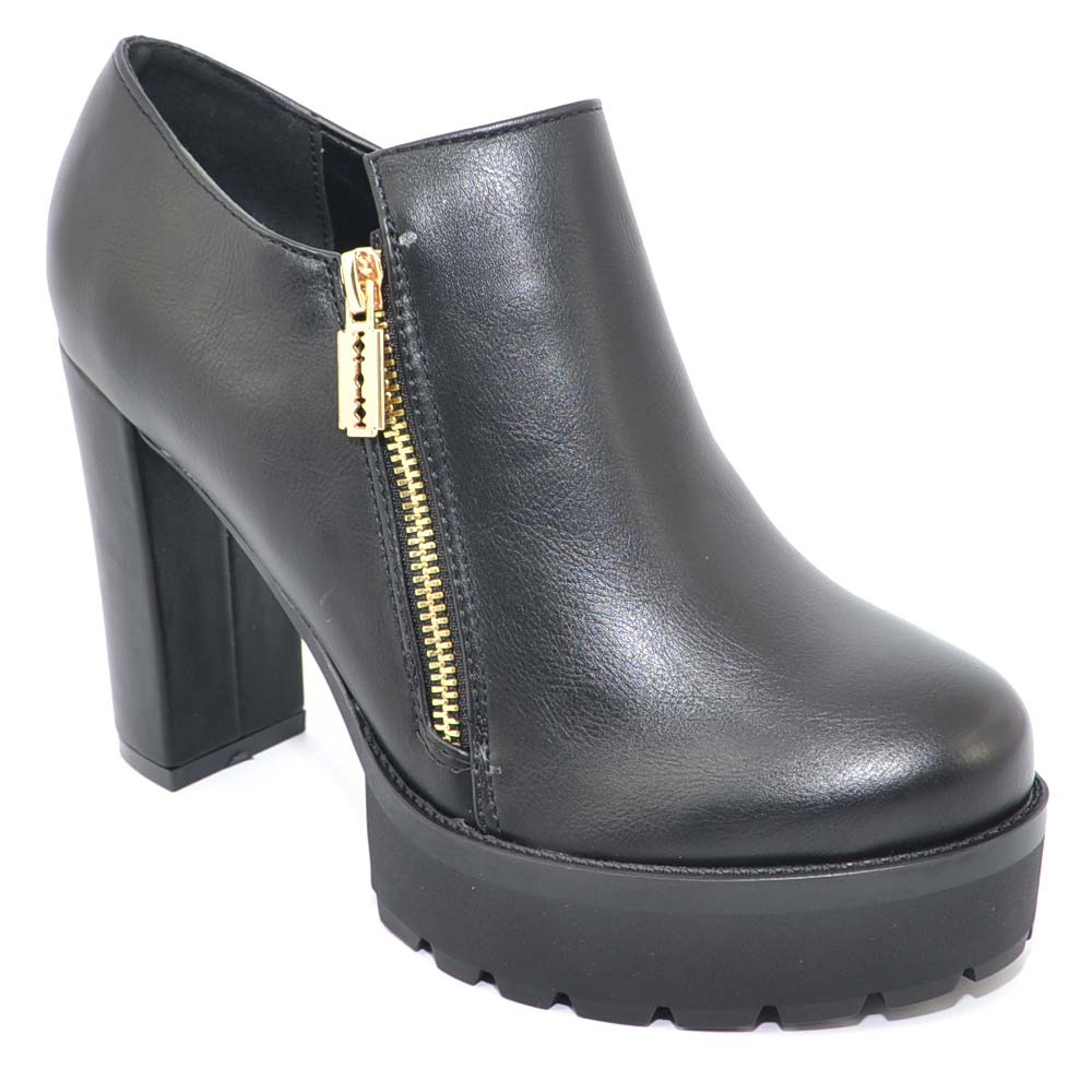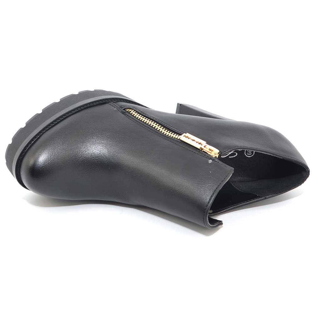 Scarpe donna tronchetto donna nero scollato alla caviglia con plateau e tacco largo zip laterale oro moda