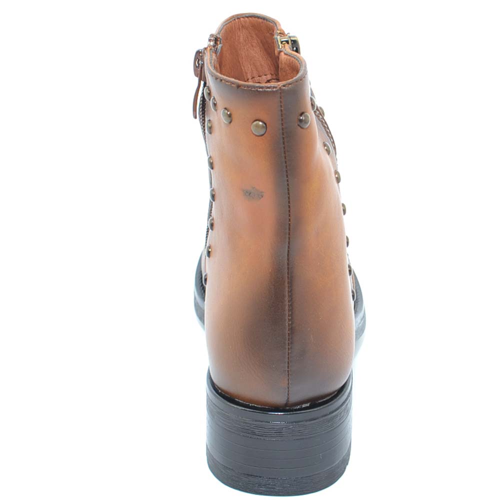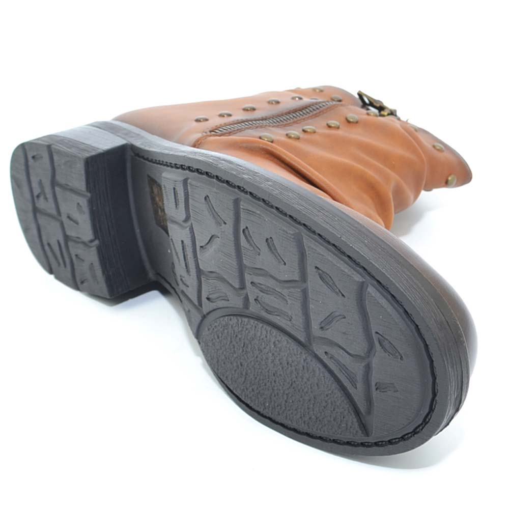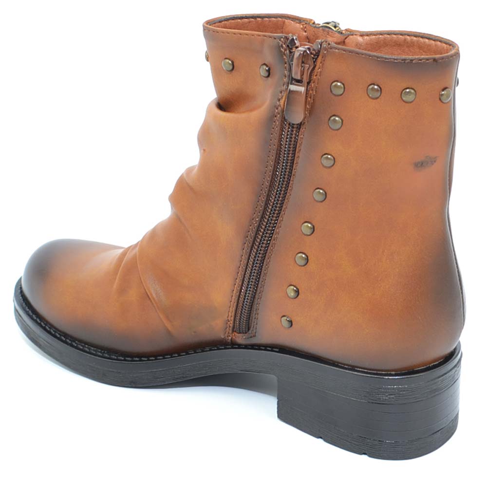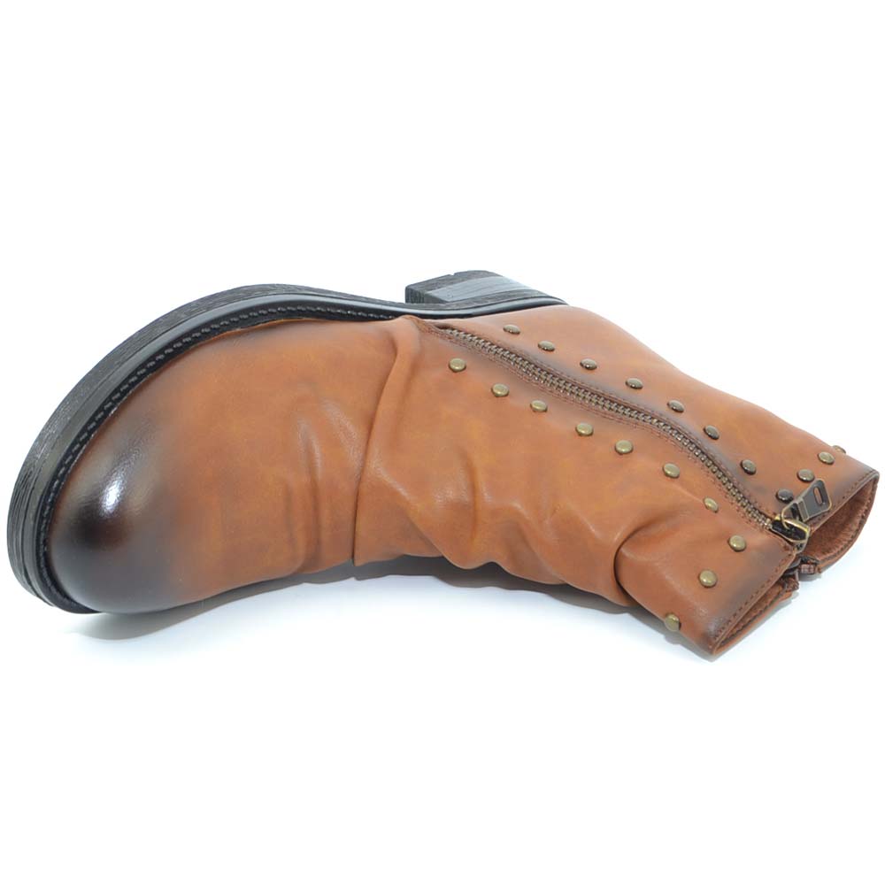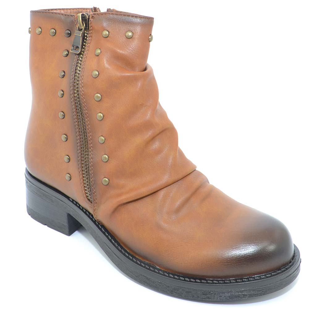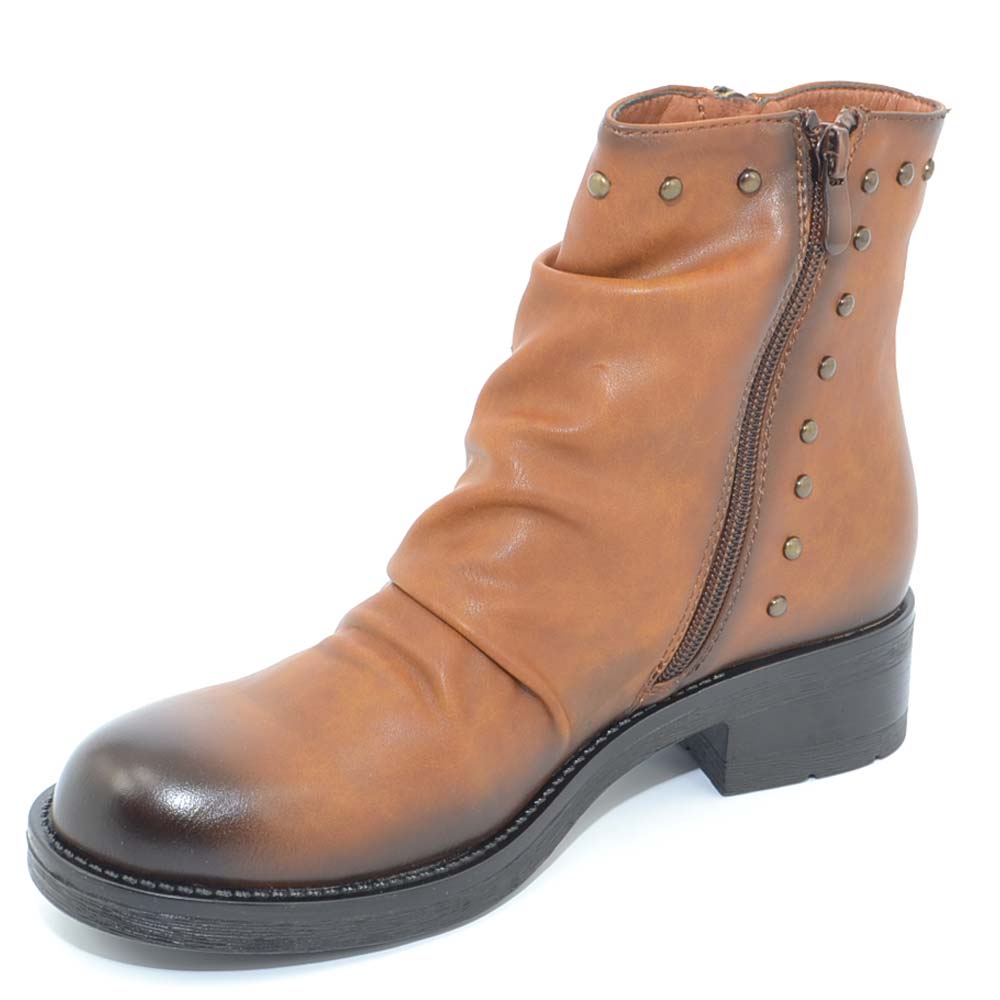 Stivaletto donna marrone cuoio sfumato arricciato con borchiette modello biker altezza caviglia con zip moda glam