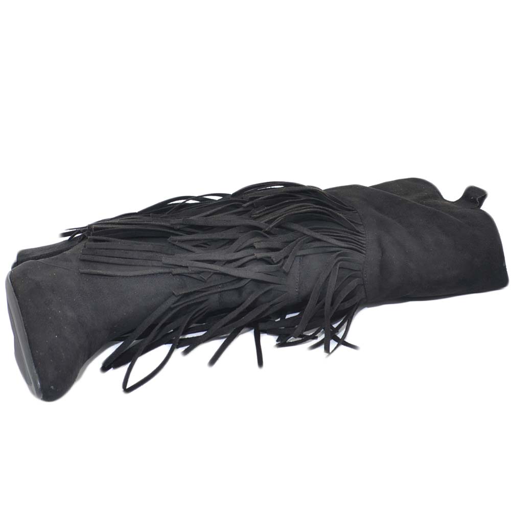 Stivali donna texani camperos in camoscio nero con frange lunghe e tacco western altezza ginocchio moda glamour luxury