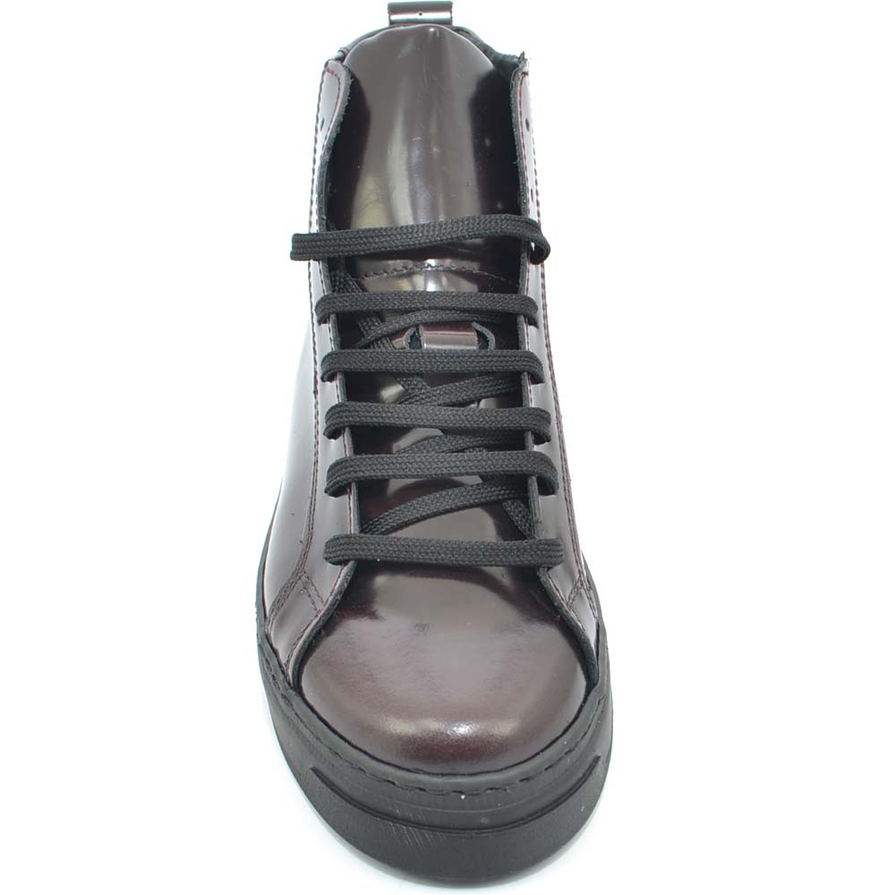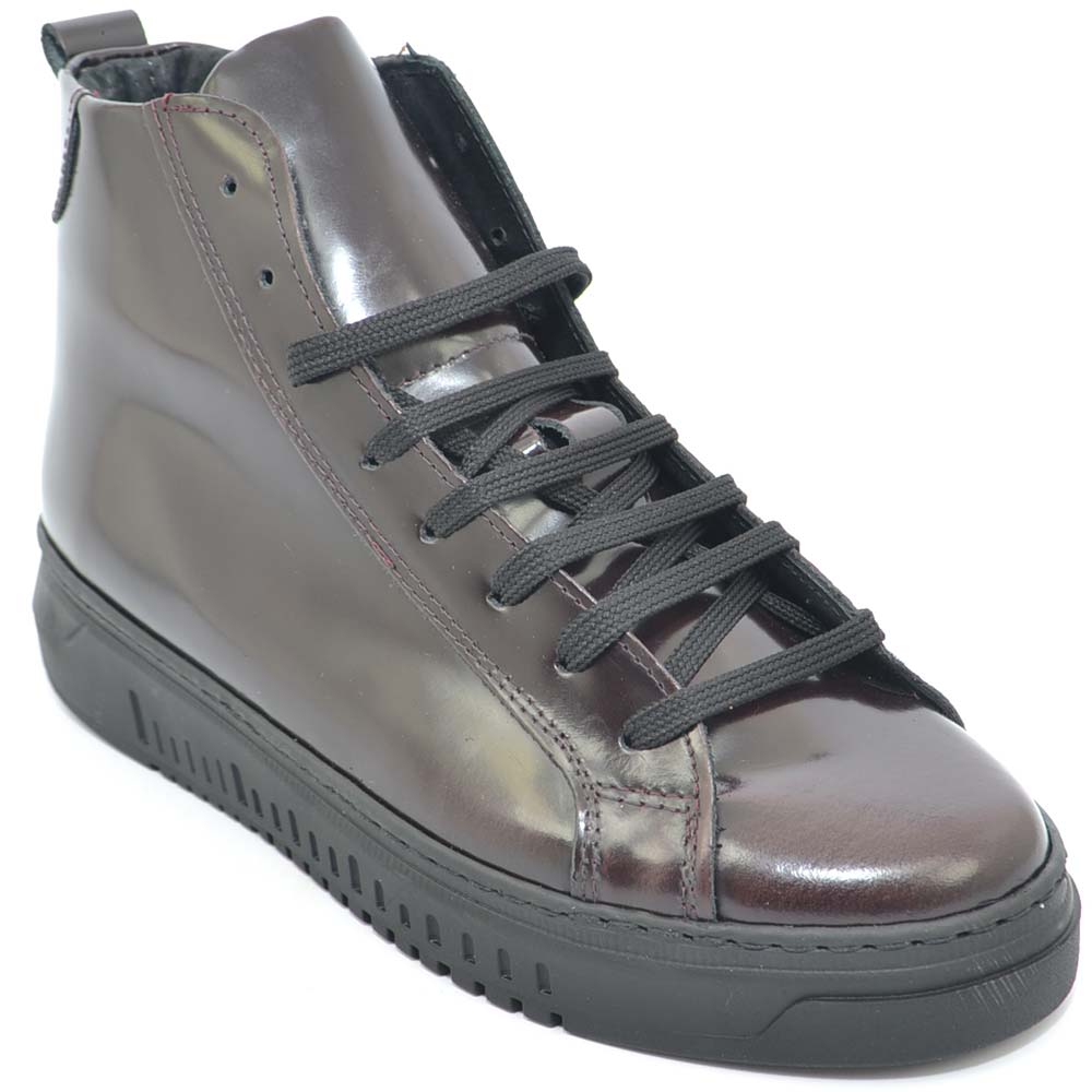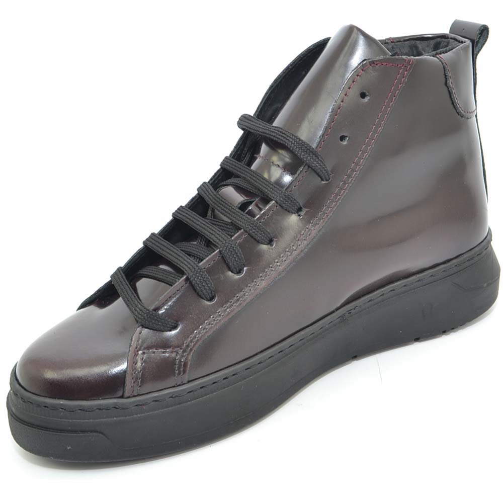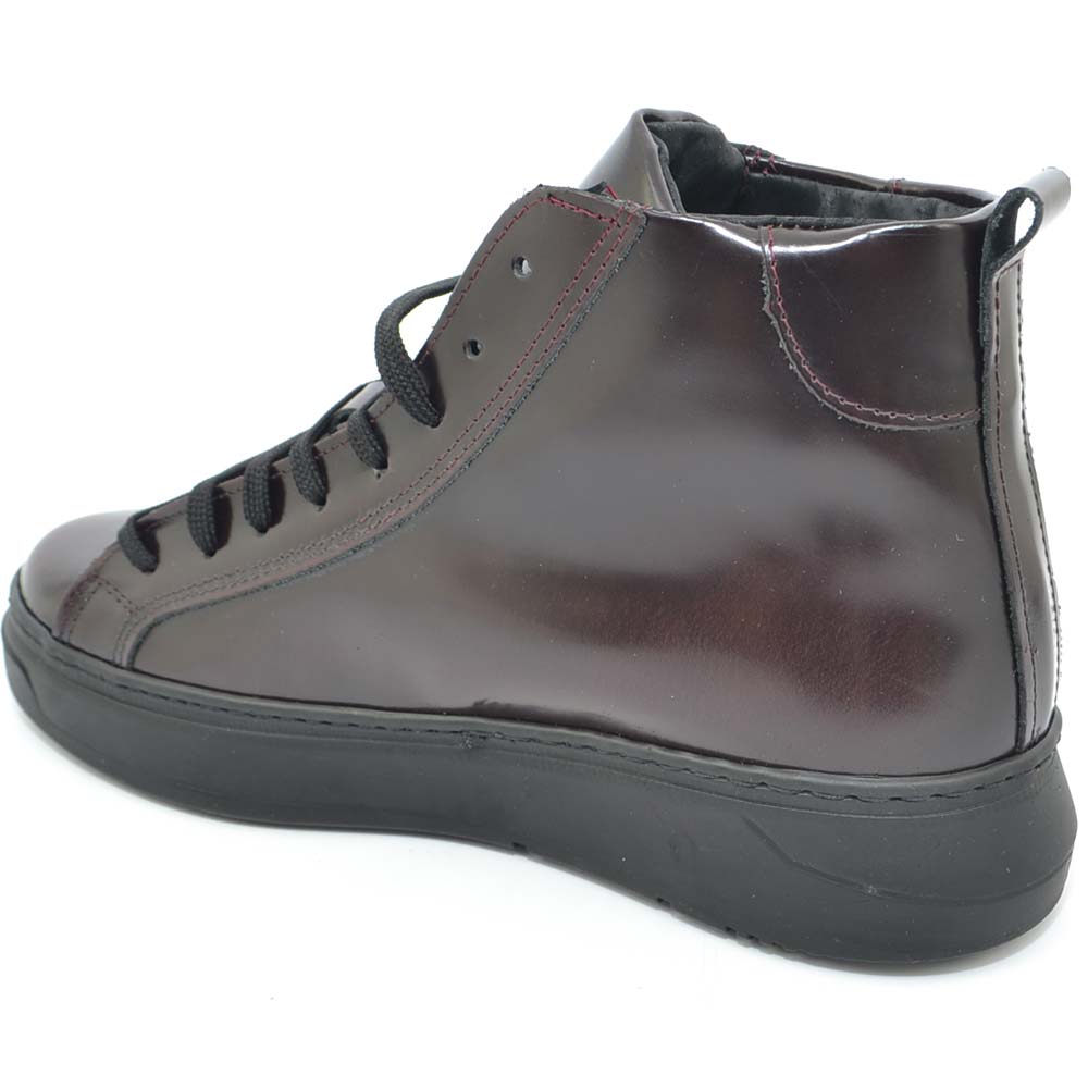 Sneakers alta in vera pelle gommata bordeaux stringata con ganci linguetta in adilprene fondo basic nero moda street .