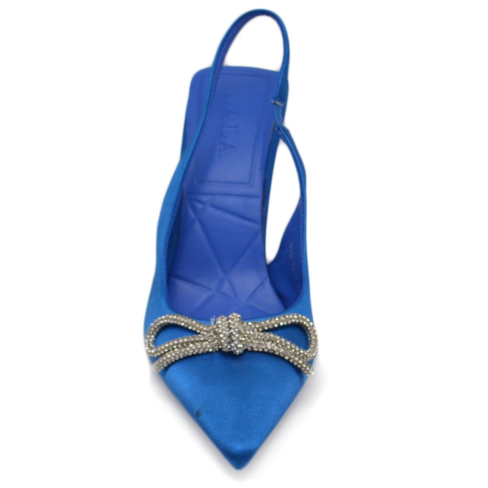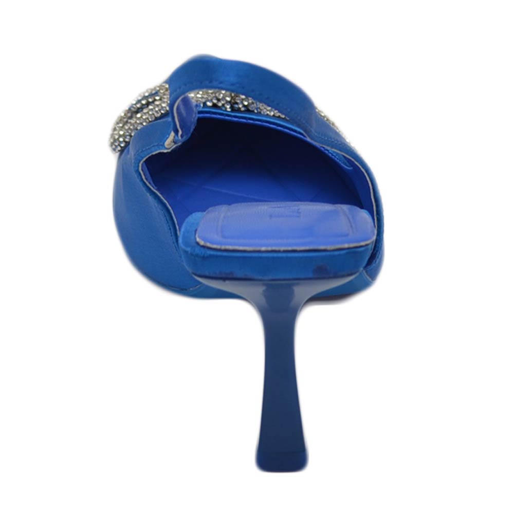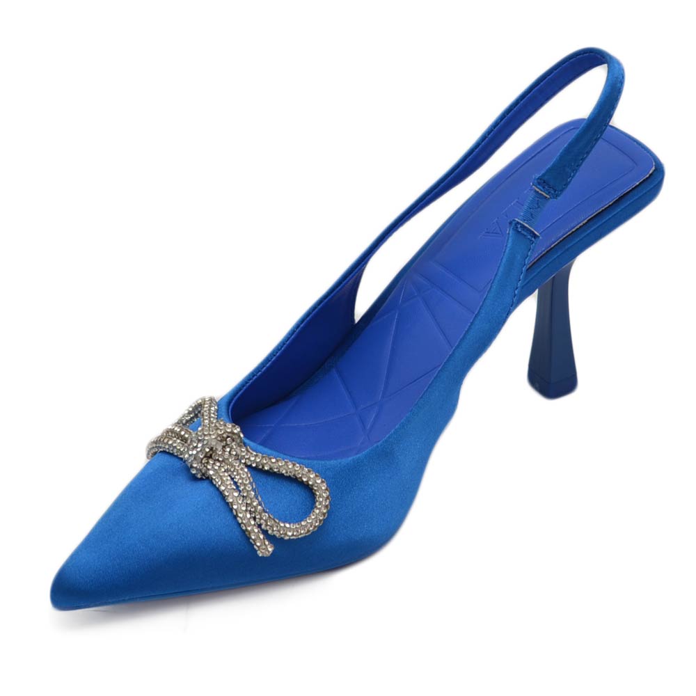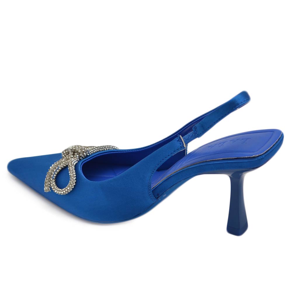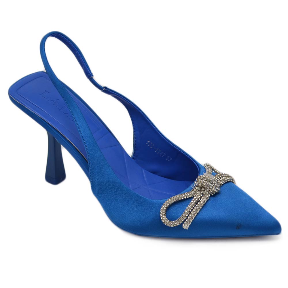 Decollete' donna gioiello elegante fiocco strass in raso blu royal tacco a spillo 80 slingback fisso moda