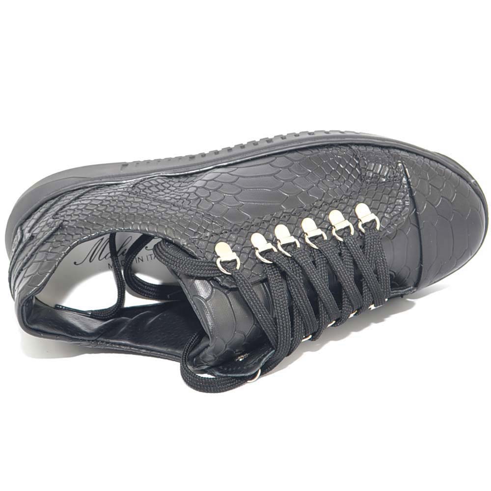 Sneakers uomo bassa in vera pelle vitello liscia nera con fondo alto in gomma eva lacci casual made in Italy.