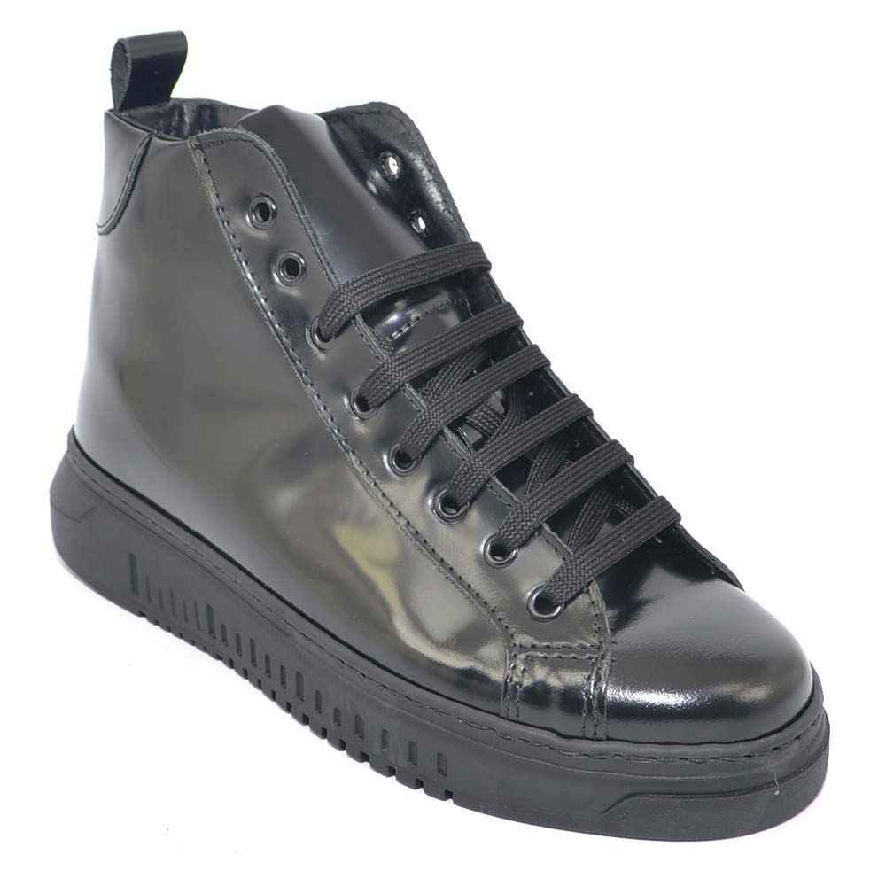 SNEAKERS UOMO ALTA IN VERA PELLE VITELLO NERO IMPERMEABILE FONDO ARMY BIANCO MADE IN ITALY.