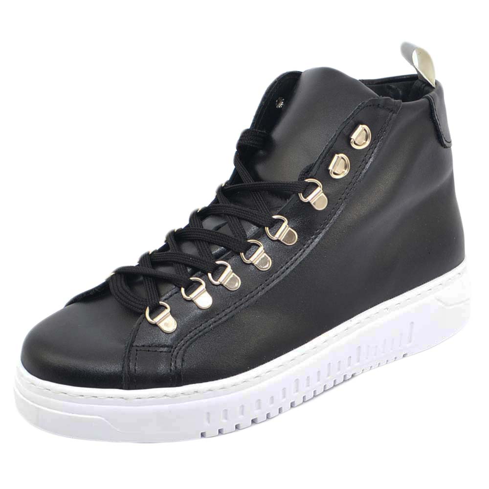 Sneakers uomo alta nera in vera pelle abrasivata nera con ganci in acciaio clip estivo fondo army bianco made in italy
