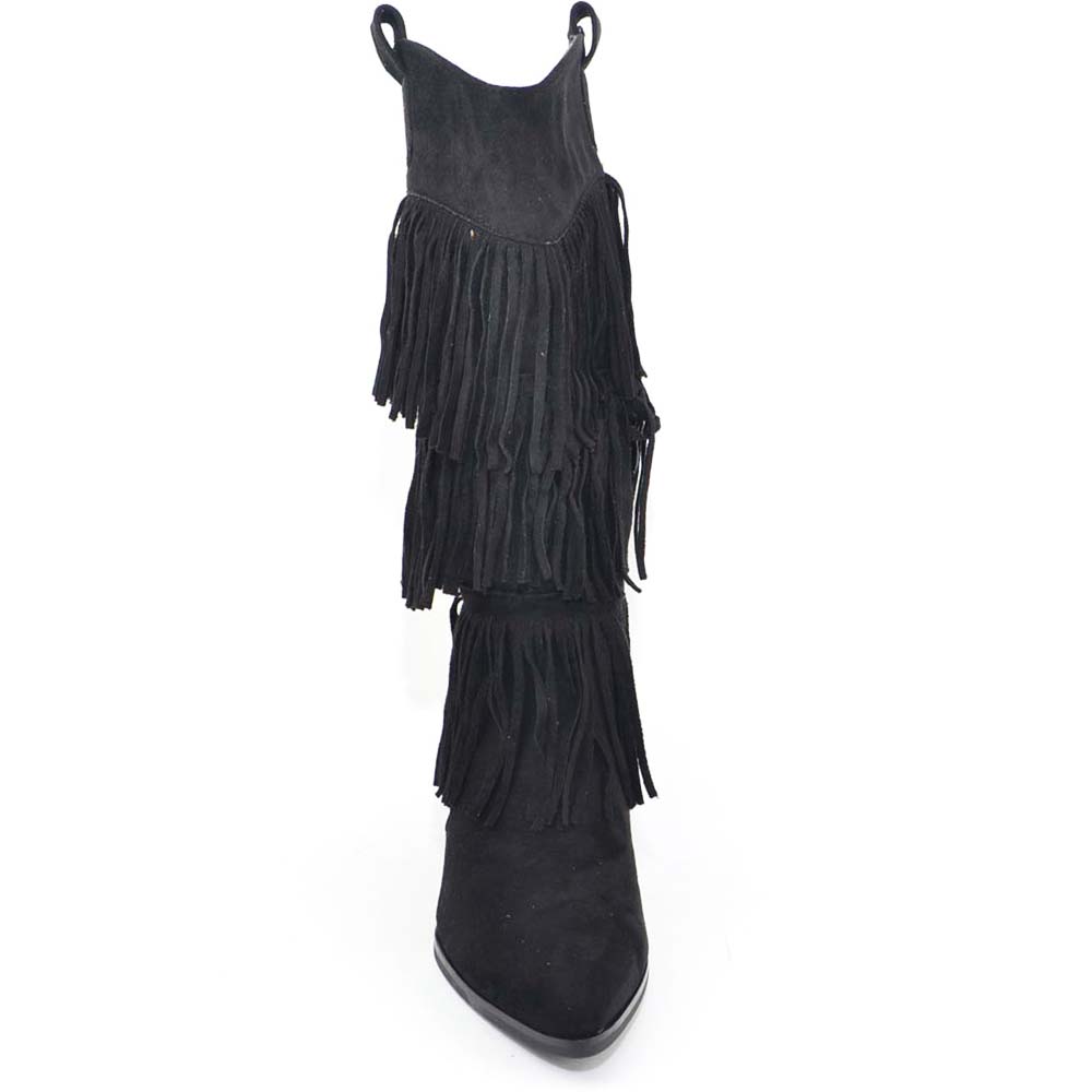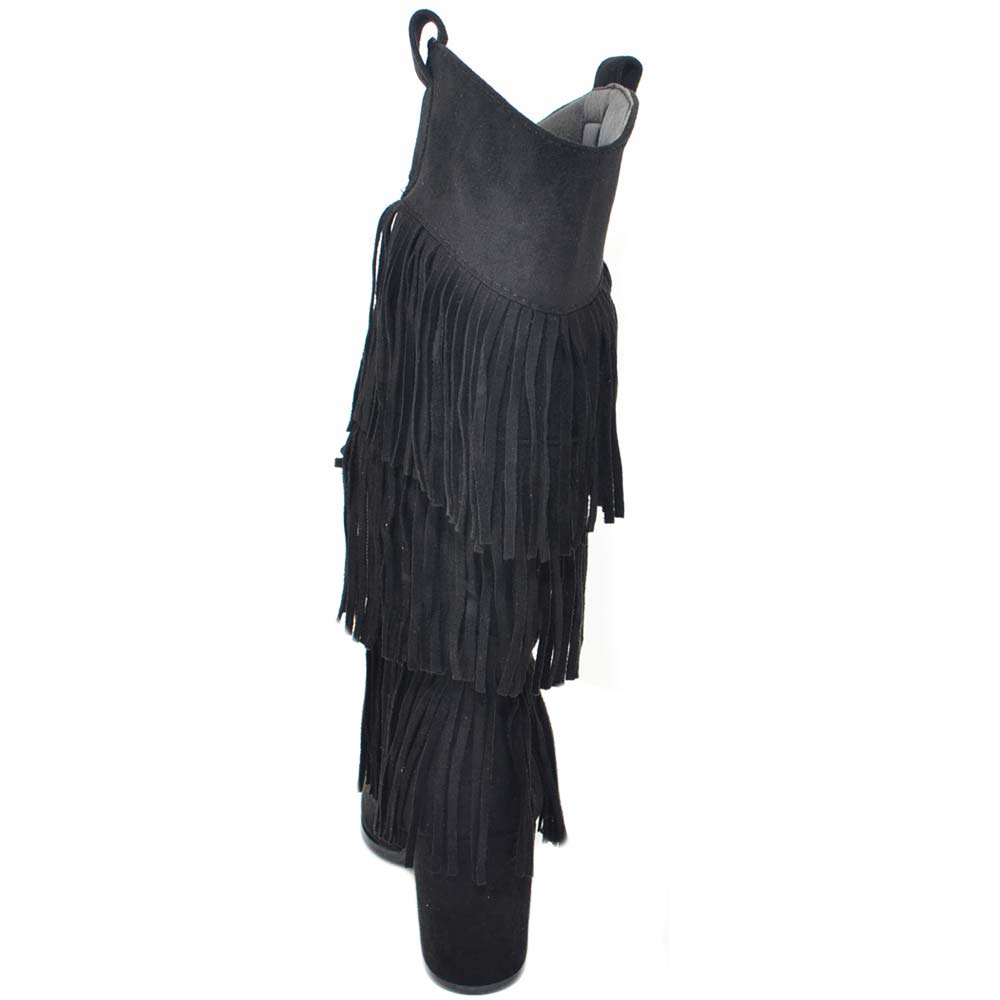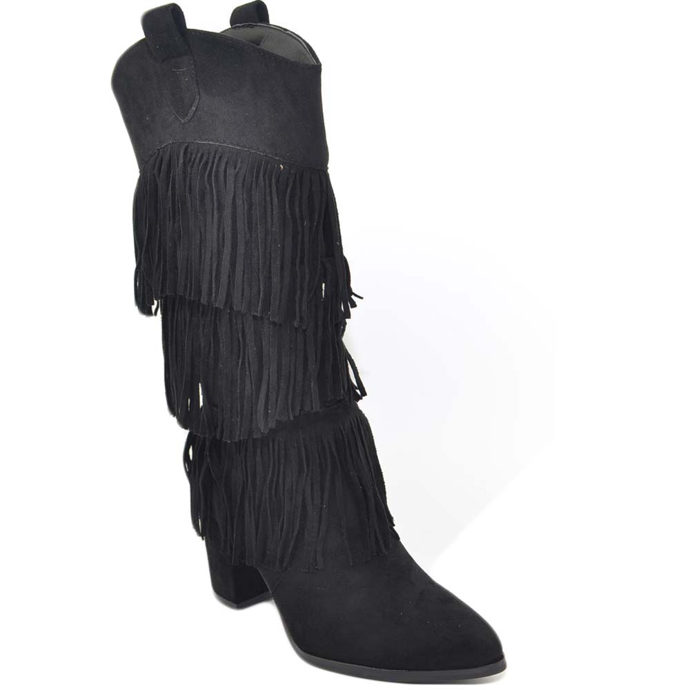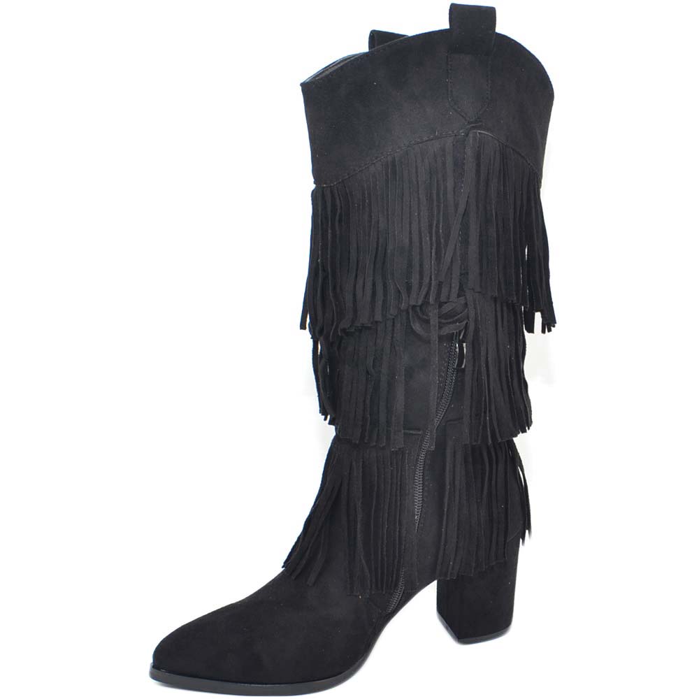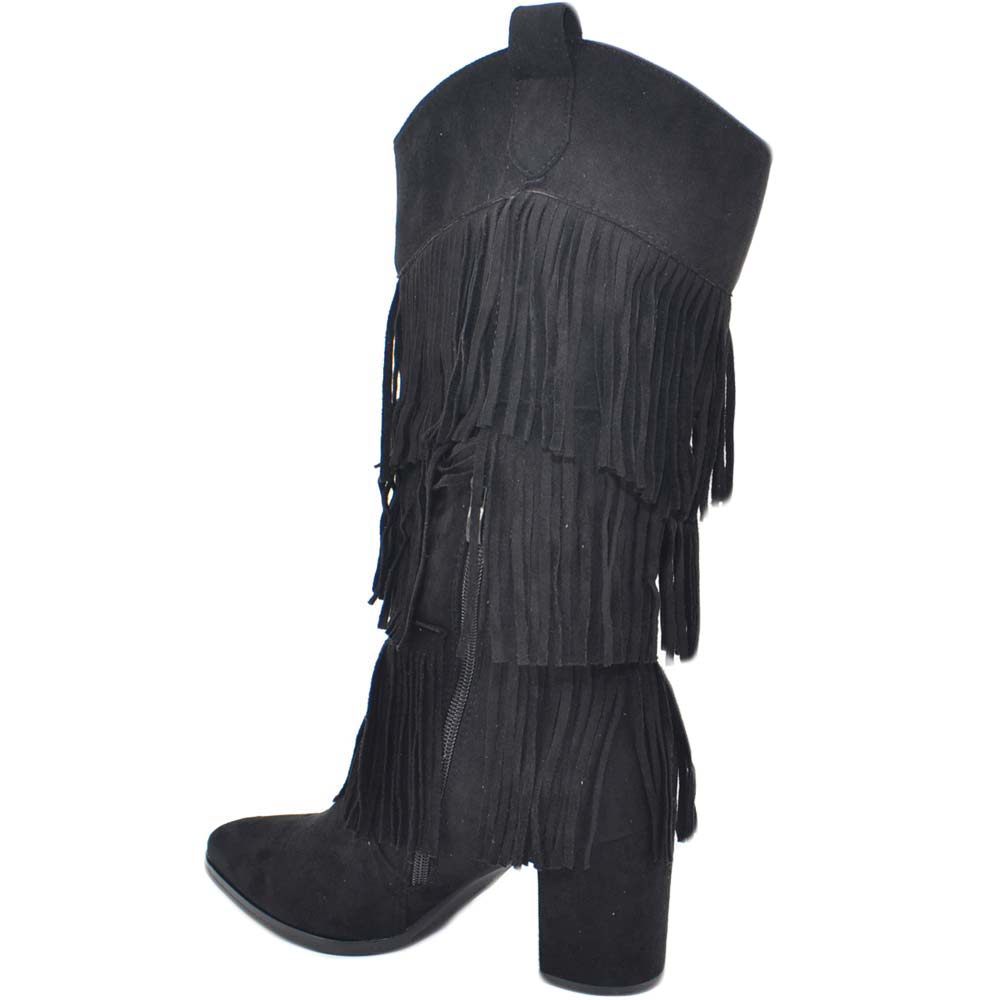 Stivali donna scamosciati neri con tacco basso e frange lunghe moda western texani camperos con zip