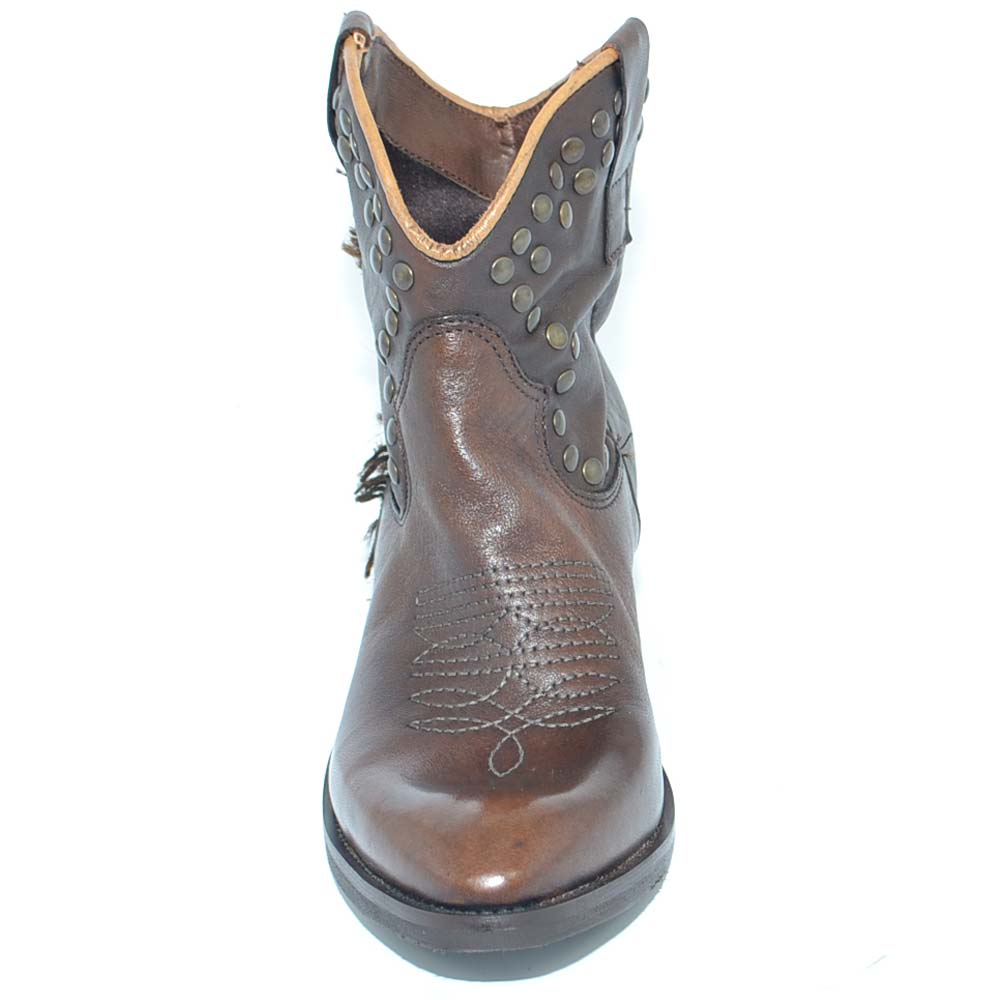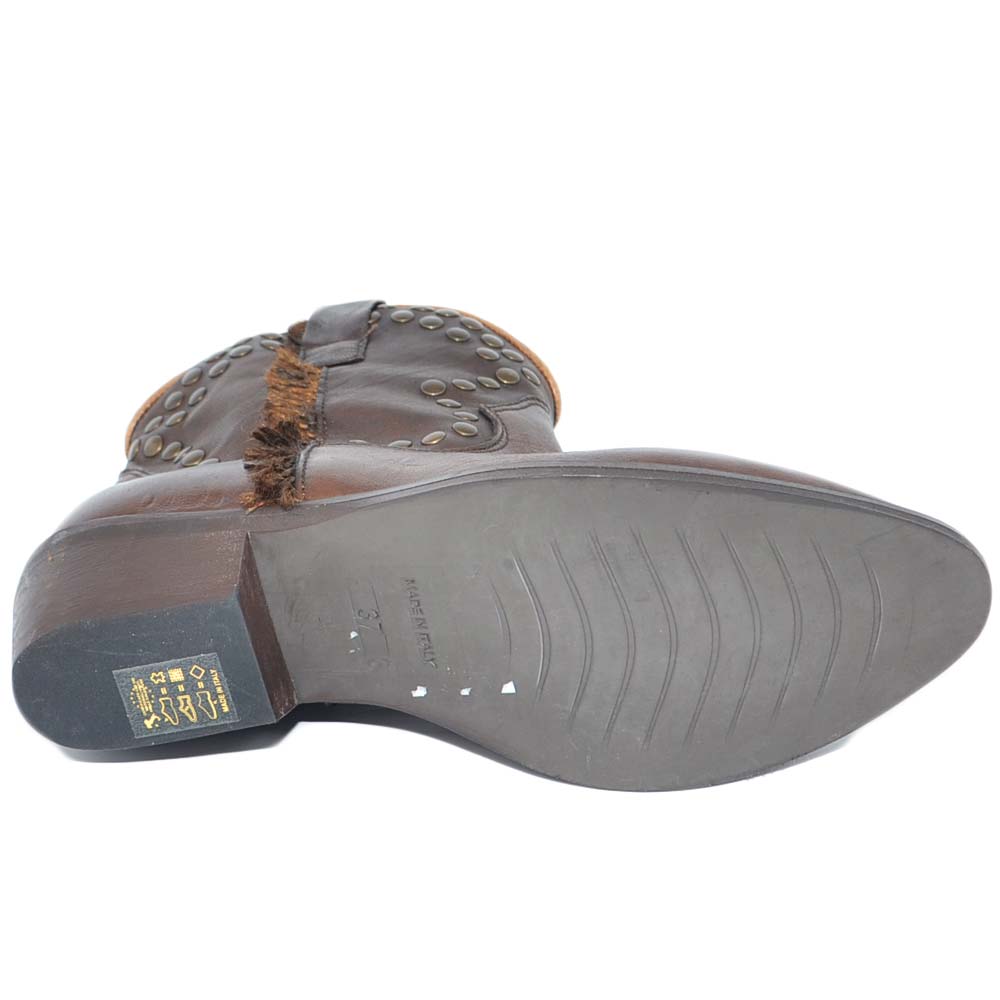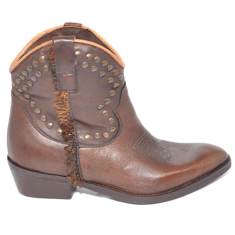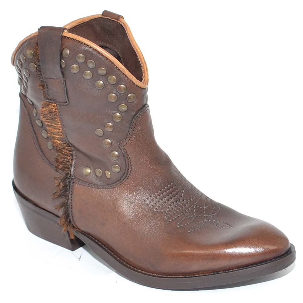 Camperos donna stivaletti texani marroni interamente in vera pelle rifiniti con borchie e frange a mano fondo gomma