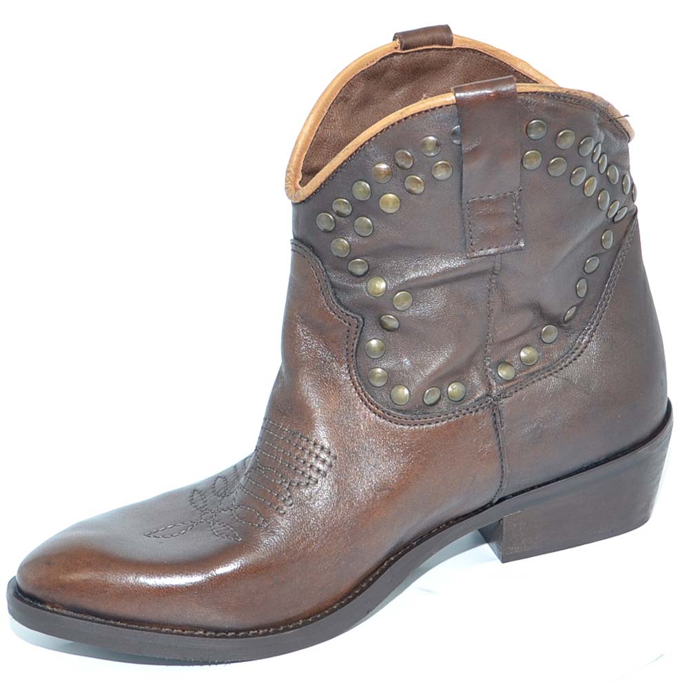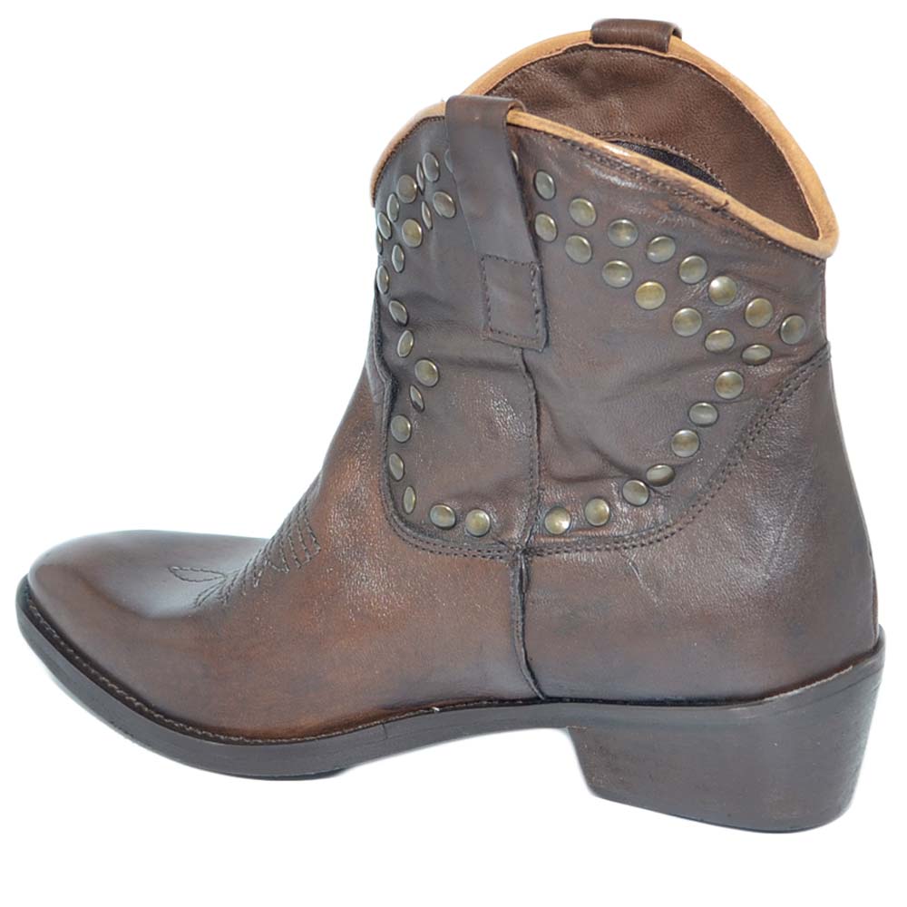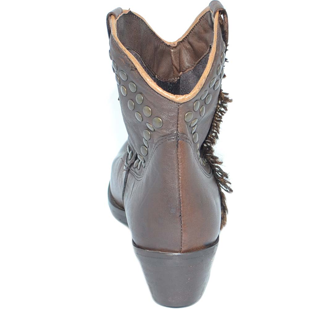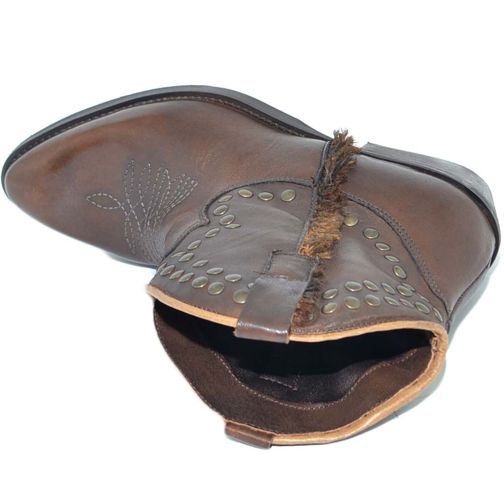 Camperos donna stivaletti texani marroni interamente in vera pelle rifiniti con borchie e frange a mano fondo gomma