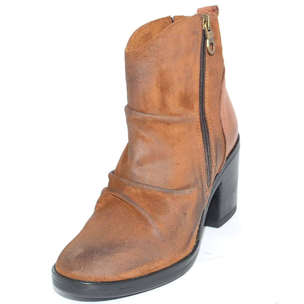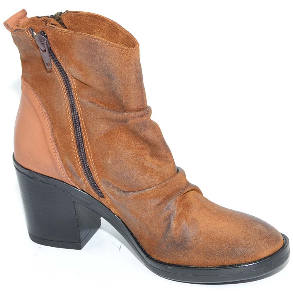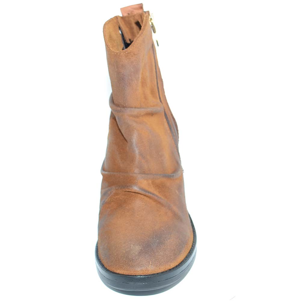 Tronchetto donna cuoio vera pelle nubuk spazzolata morbida arricciata zip trasversale tacco comodo basso made in italy