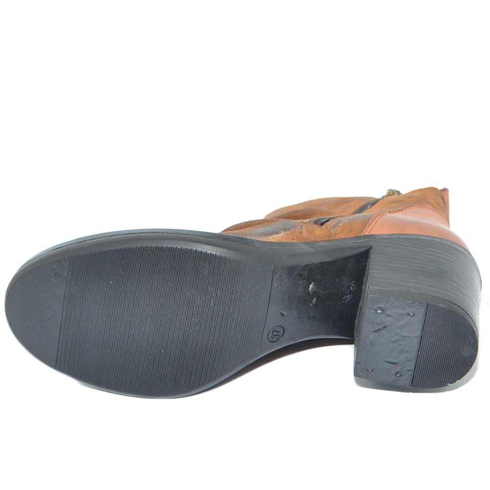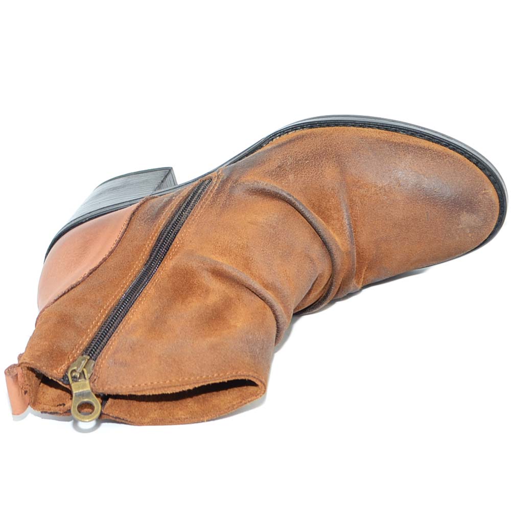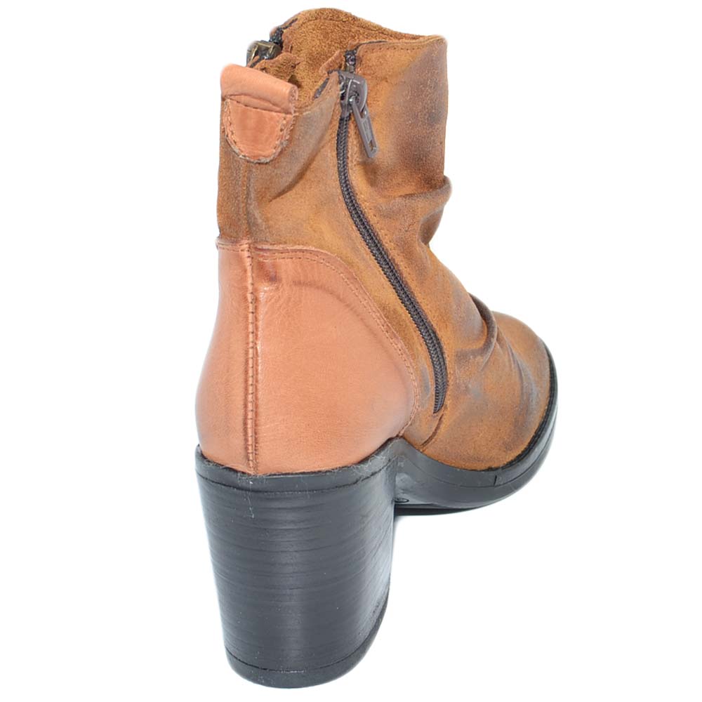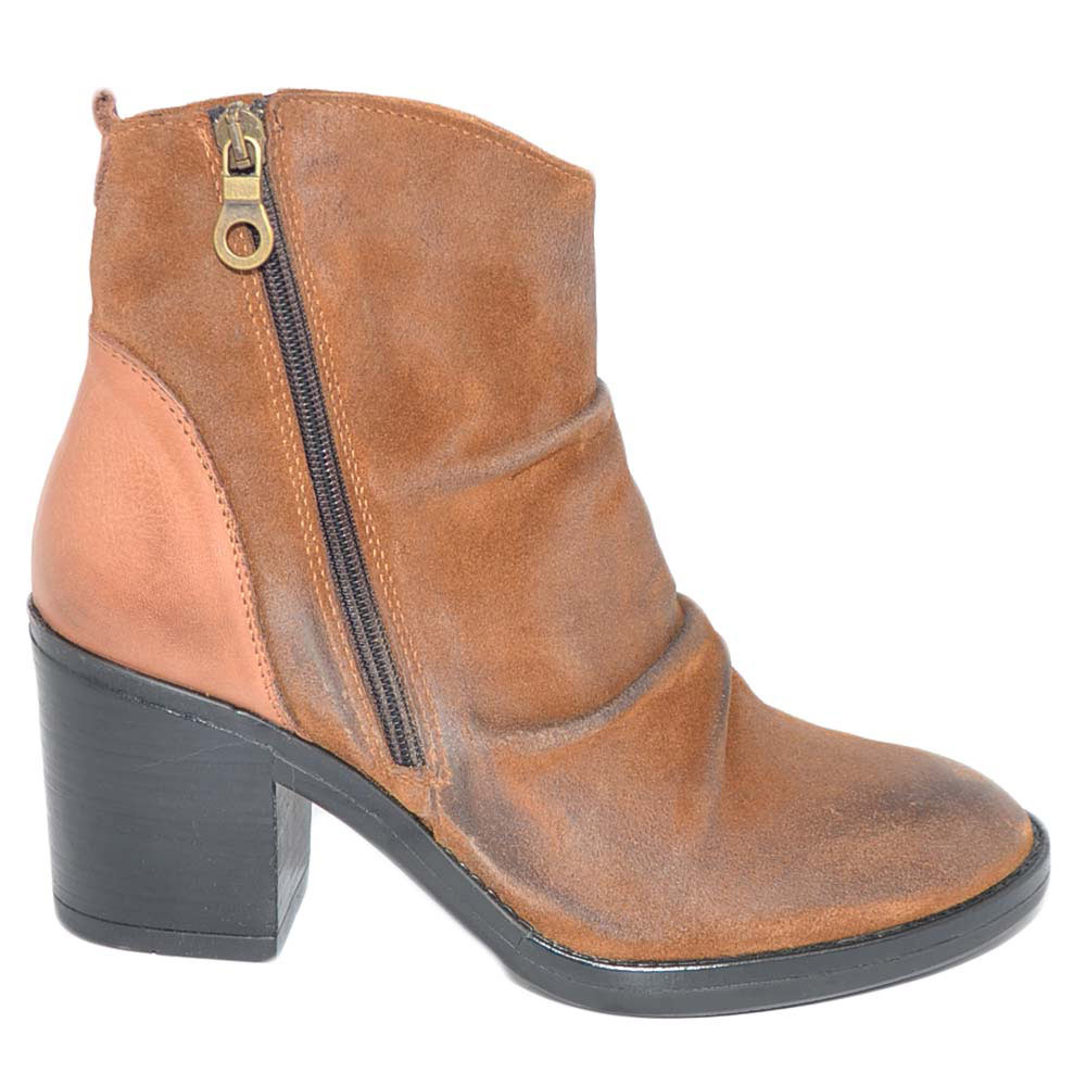 Tronchetto donna cuoio vera pelle nubuk spazzolata morbida arricciata zip trasversale tacco comodo basso made in italy
