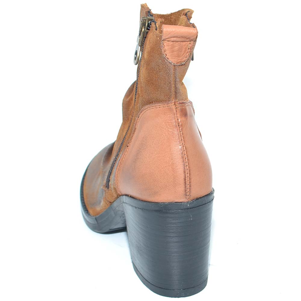 Tronchetto donna camperos con tacco in legno cono 7cm a punta in camoscio cuoio zip laterale attillato sopra la caviglia.
