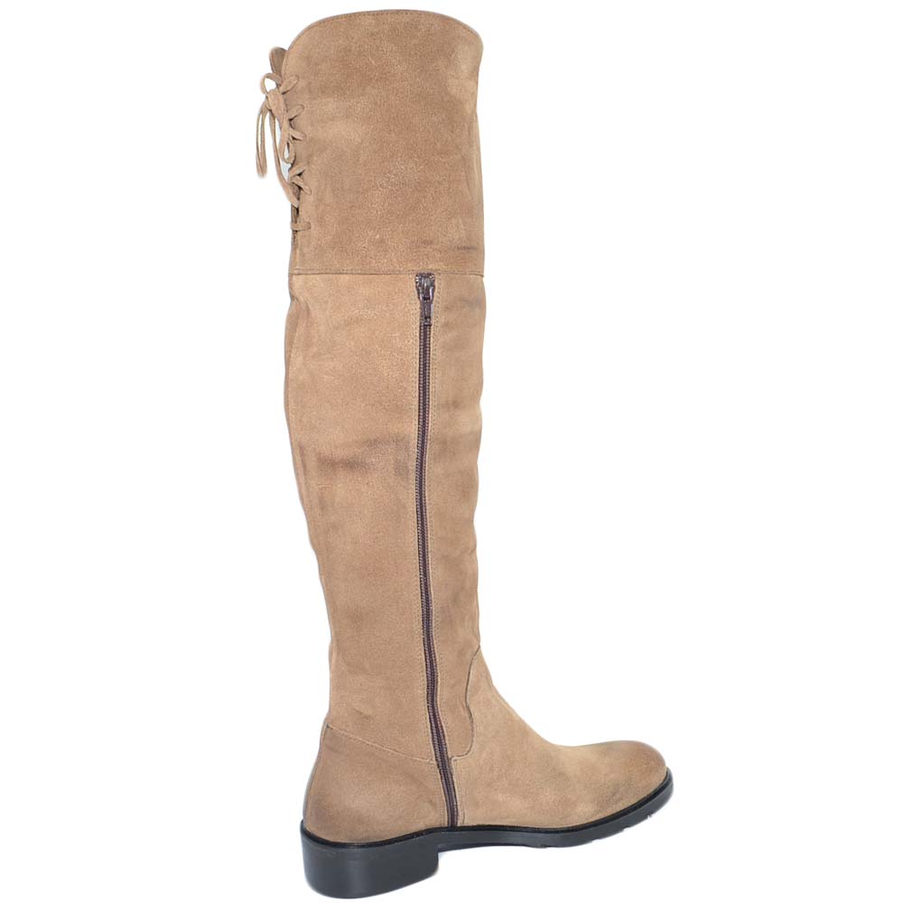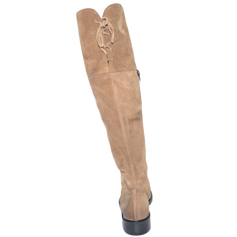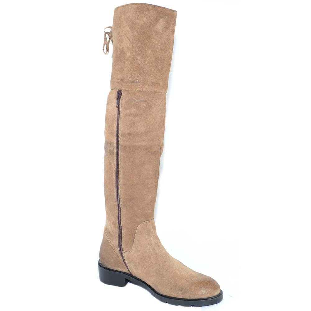 Stivale alto sopra il ginocchio donna taupe vera pelle scamosciata laccetti regolabili tacco basso comodi made in Italy