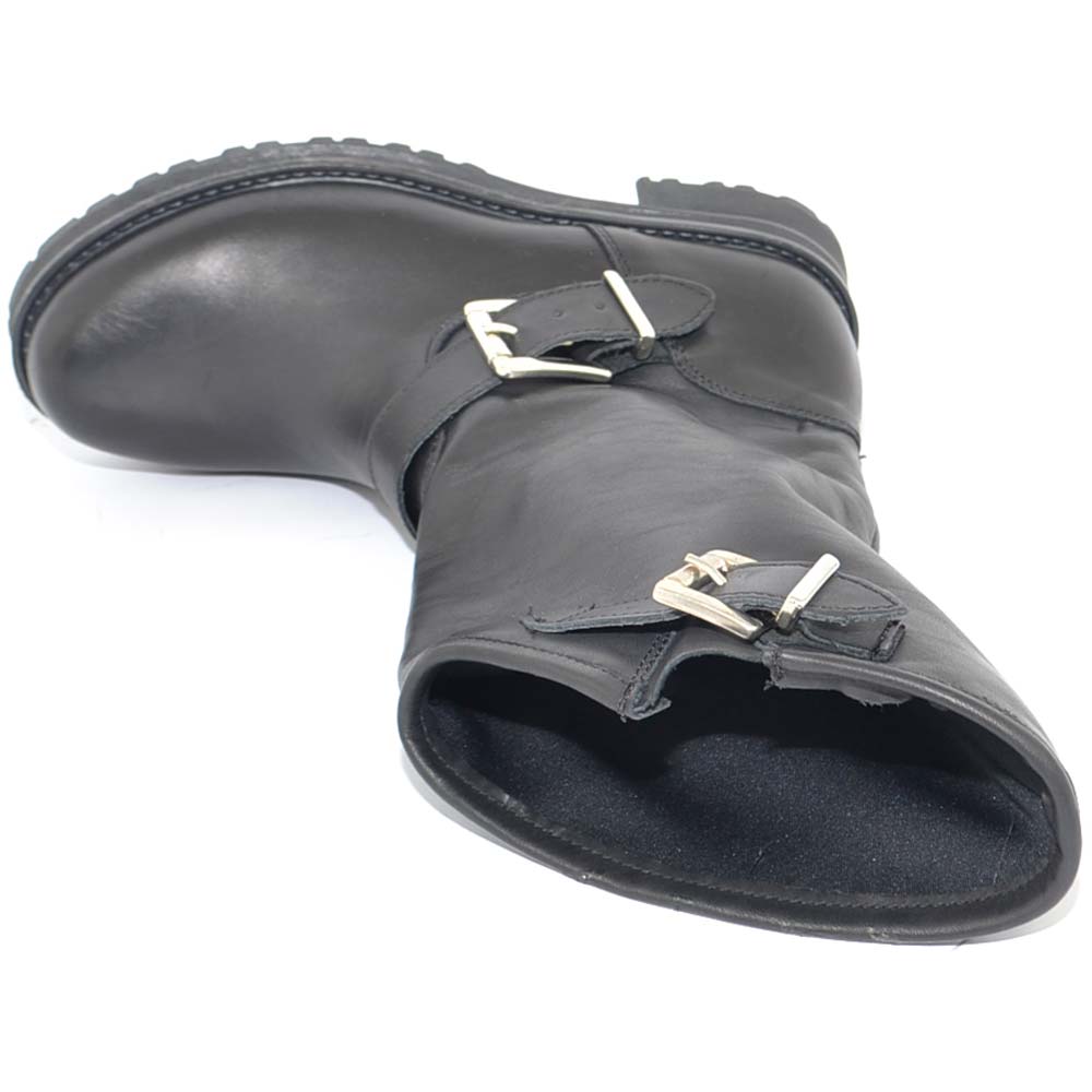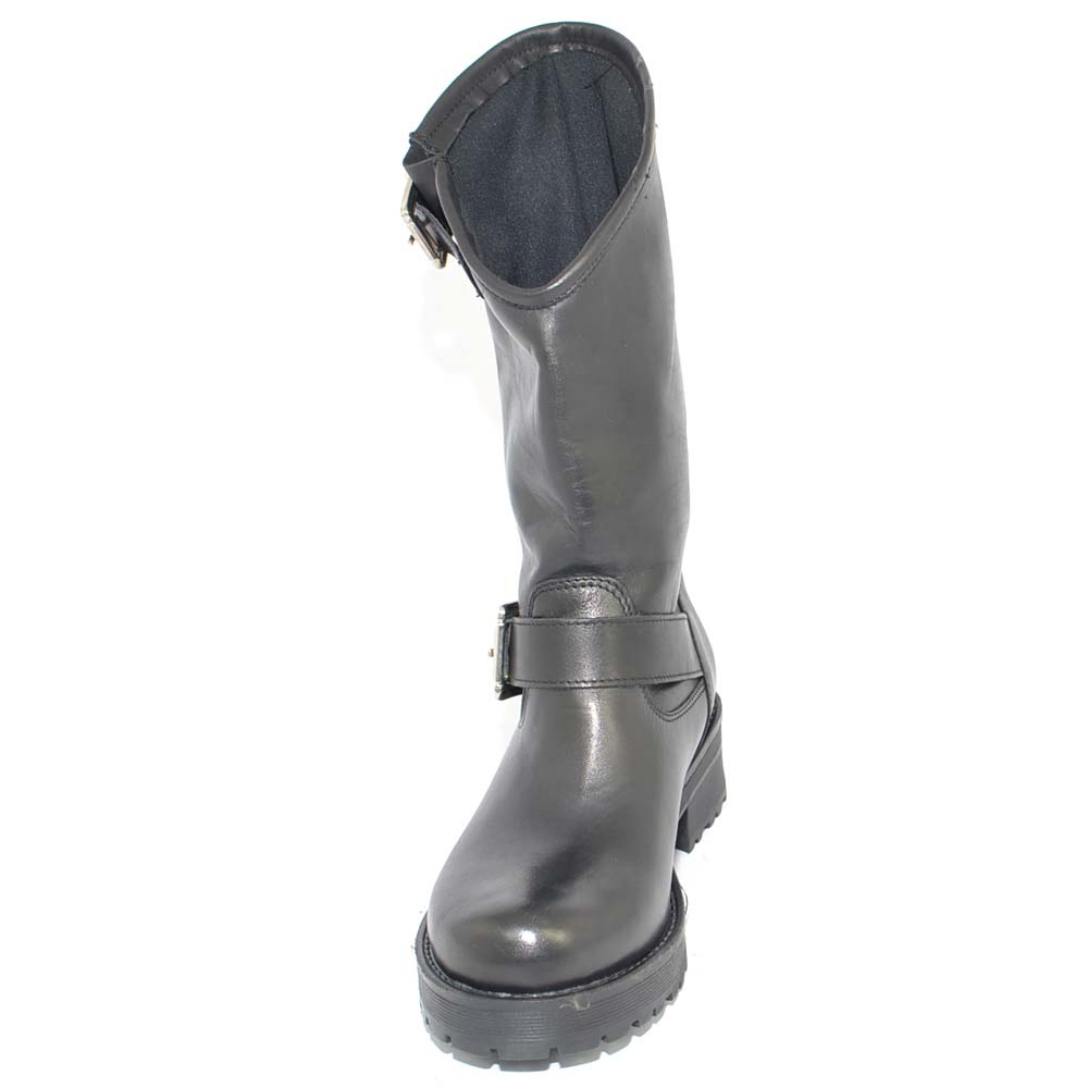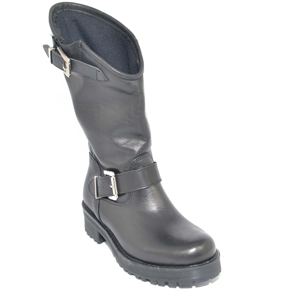 Stivale donna vera pelle biker morbido collo asimmetrico polpaccio con fibbie fondo gomma zigrinato roccia linea basic