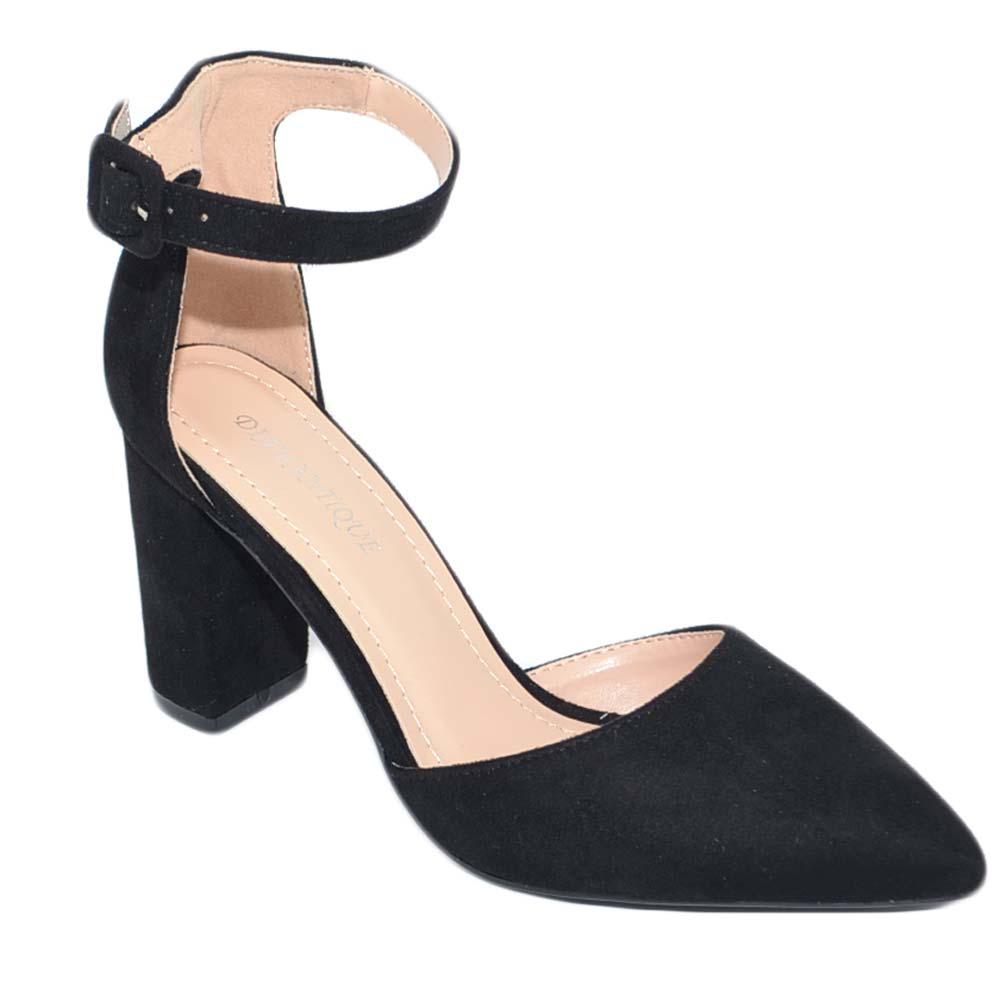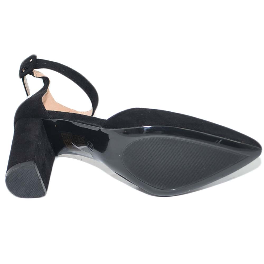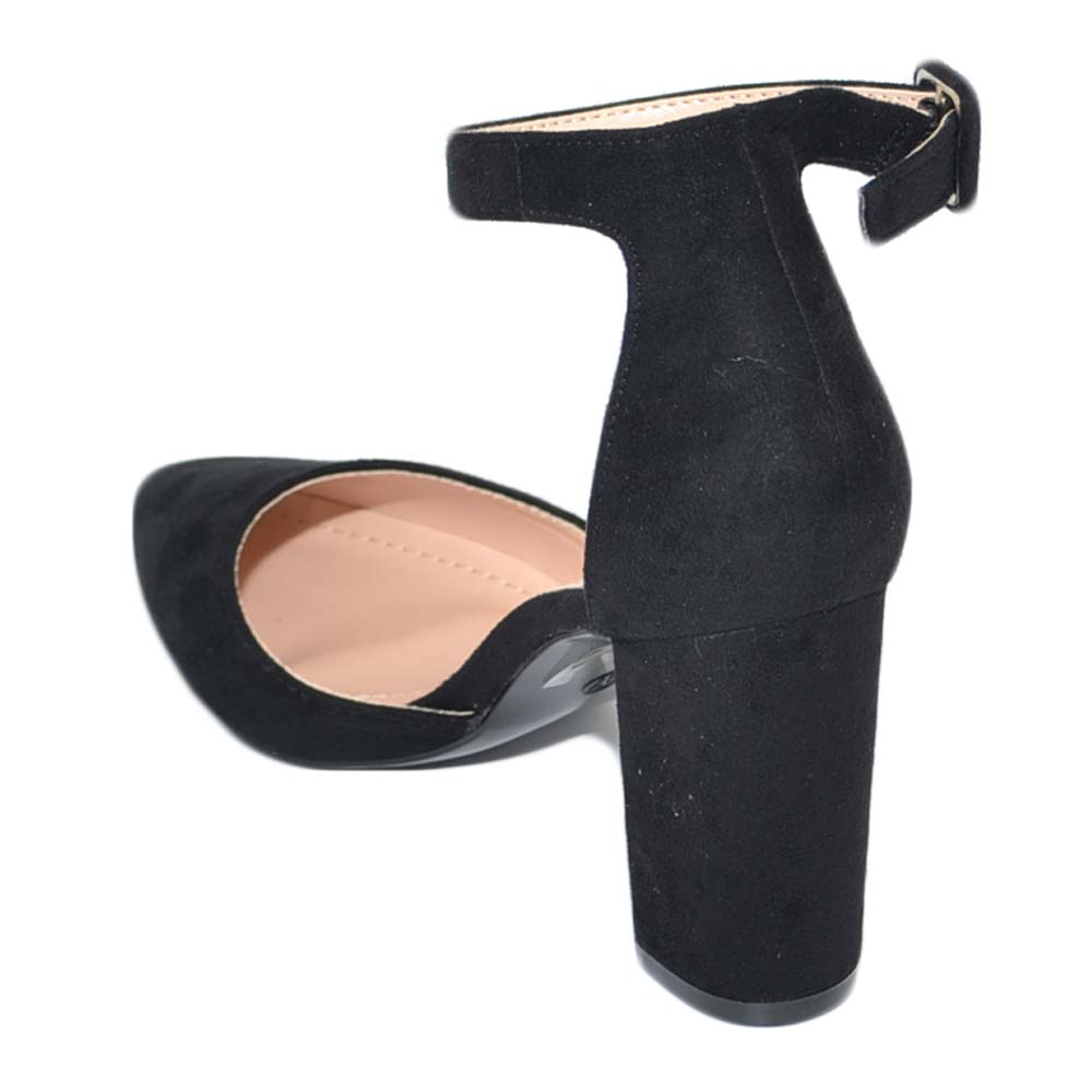 Decollete' donna scamosciato nero a punta tacco largo comodo 7 cm e cinturino alla caviglia linea basic glamour