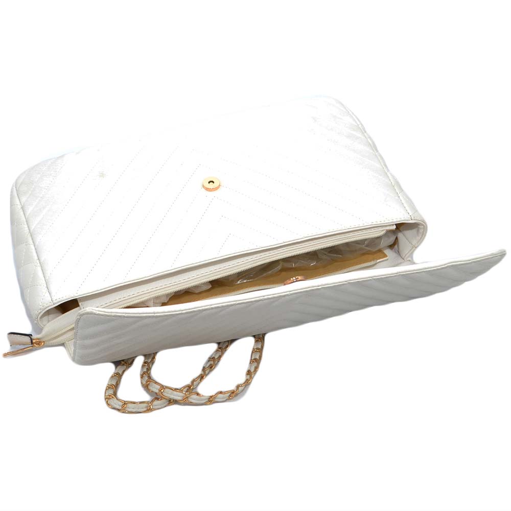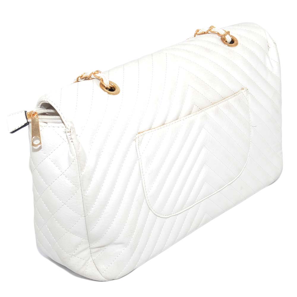 La borsa forma rettangolareo donna è realizzata in ecopelle di colore bianco sintetico, linea basic. Elegante, è idonea per cerimonie o eventi mondani. Molto comoda grazie alla ribalta a bottone e catenina in acciaio argentato. Pratica e capiente, è l' ideale per le donne che amano avere tutto ben organizzato con semplicità.