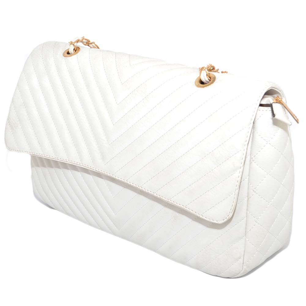 Borsa donna bianca rettangolare striata con scopartimenti chiusura clip zip interna catena oro capiente moda glam