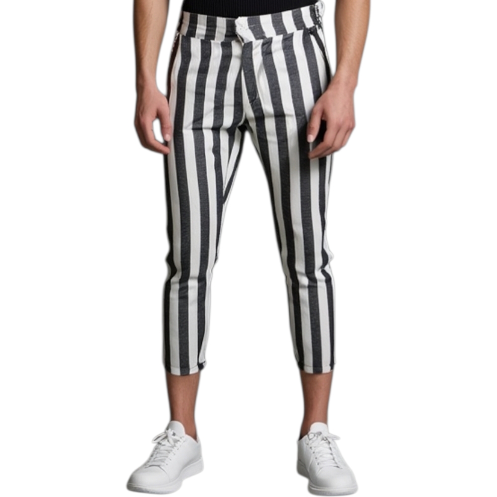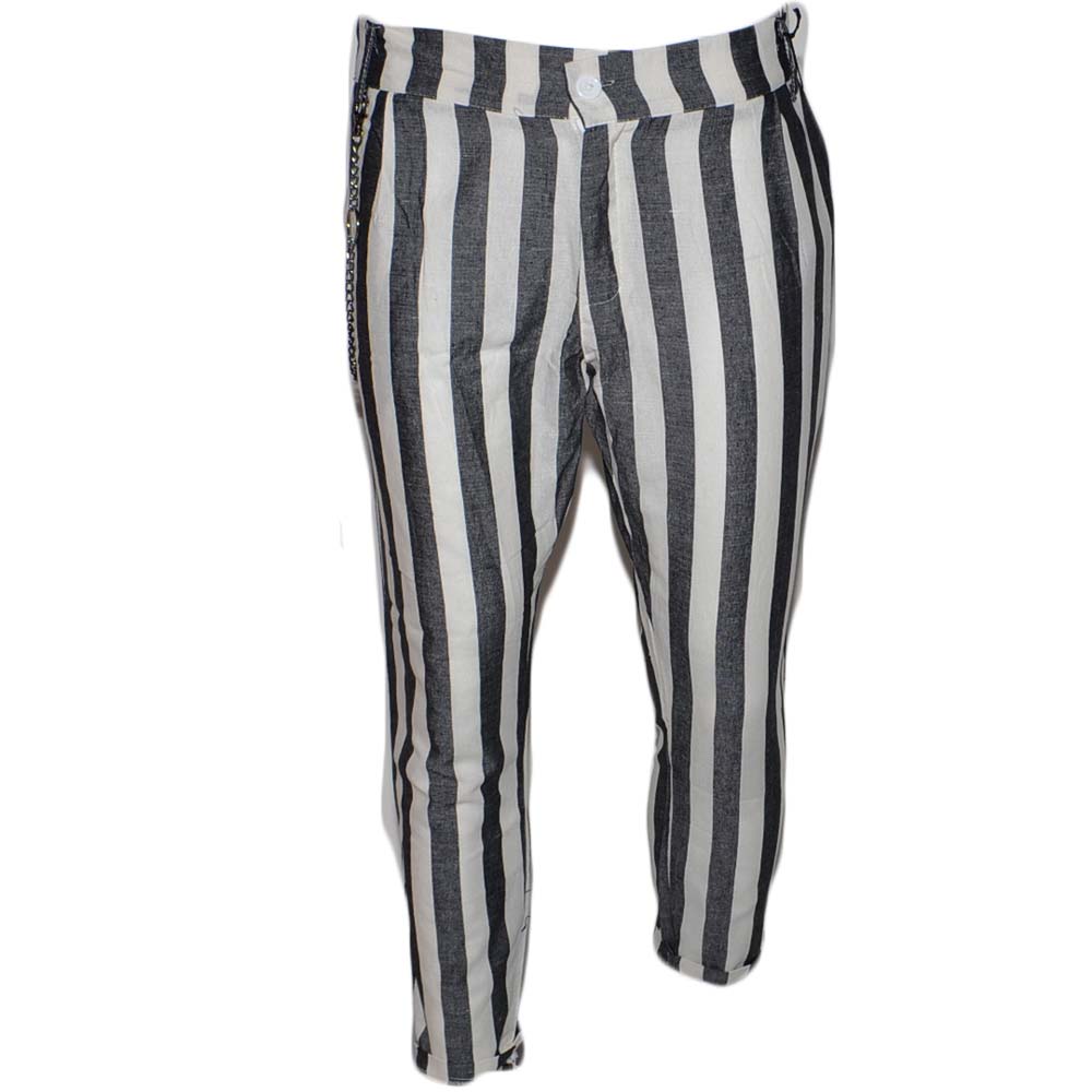 Pantaloni chino uomo di puro lino bianchi e grigi a striscia con catena bottone e tasche americane moda dandy
