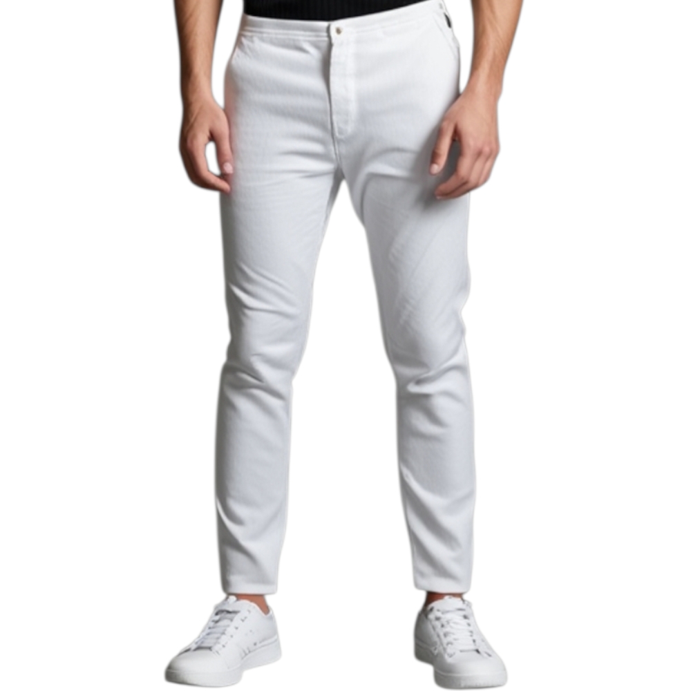 Pantaloni chino uomo di puro cotone bianco con bottone e tasche americane catena di corda in vita moda dandy.