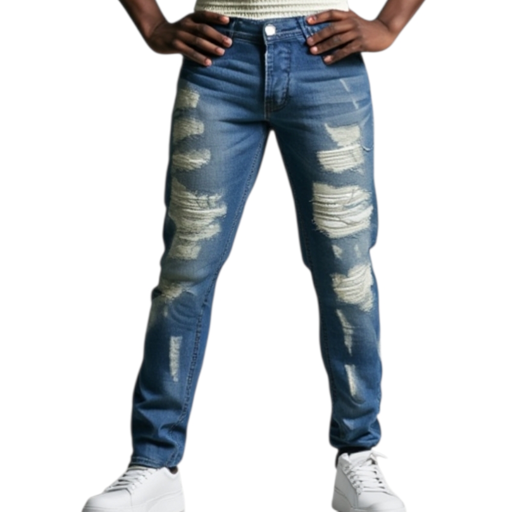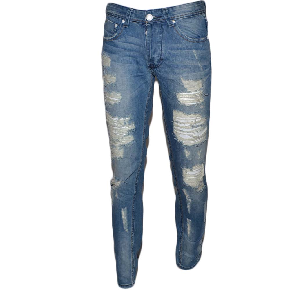 Jeans denim uomo jogger fit cavallo basso lavaggio chiaro Cinque tasche cerniera e bottone con strappi made in Italy.