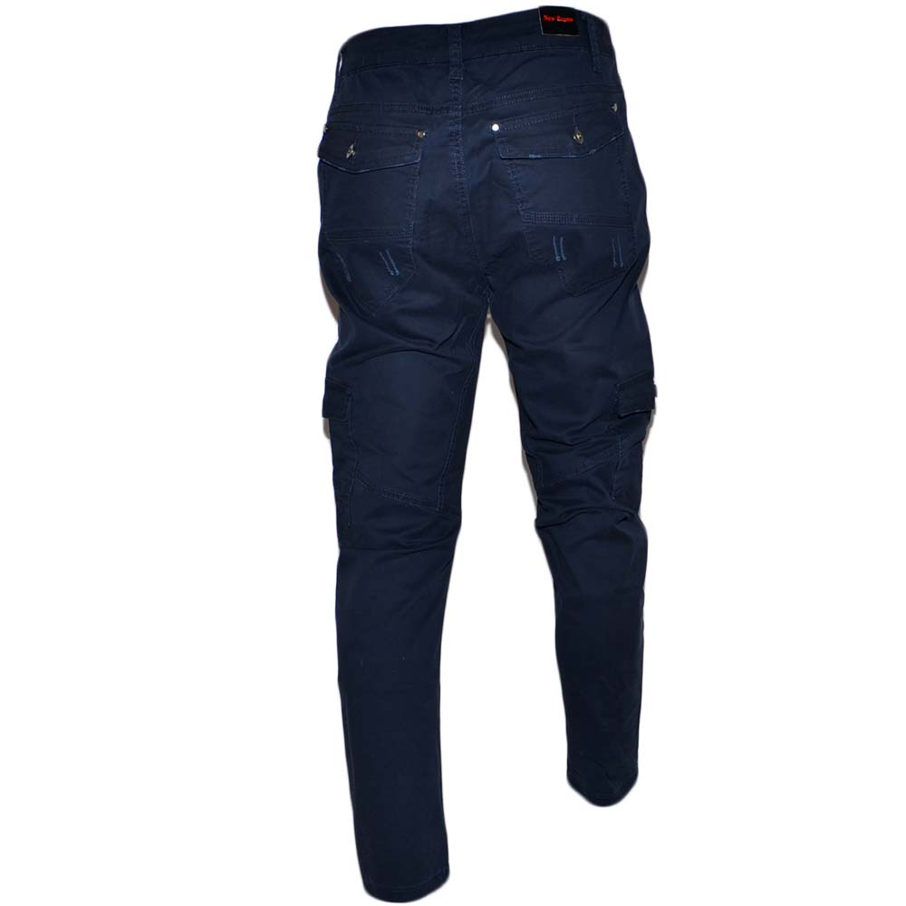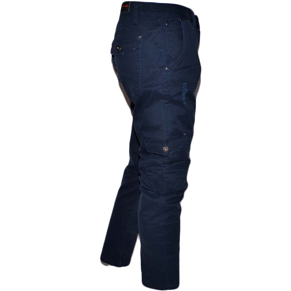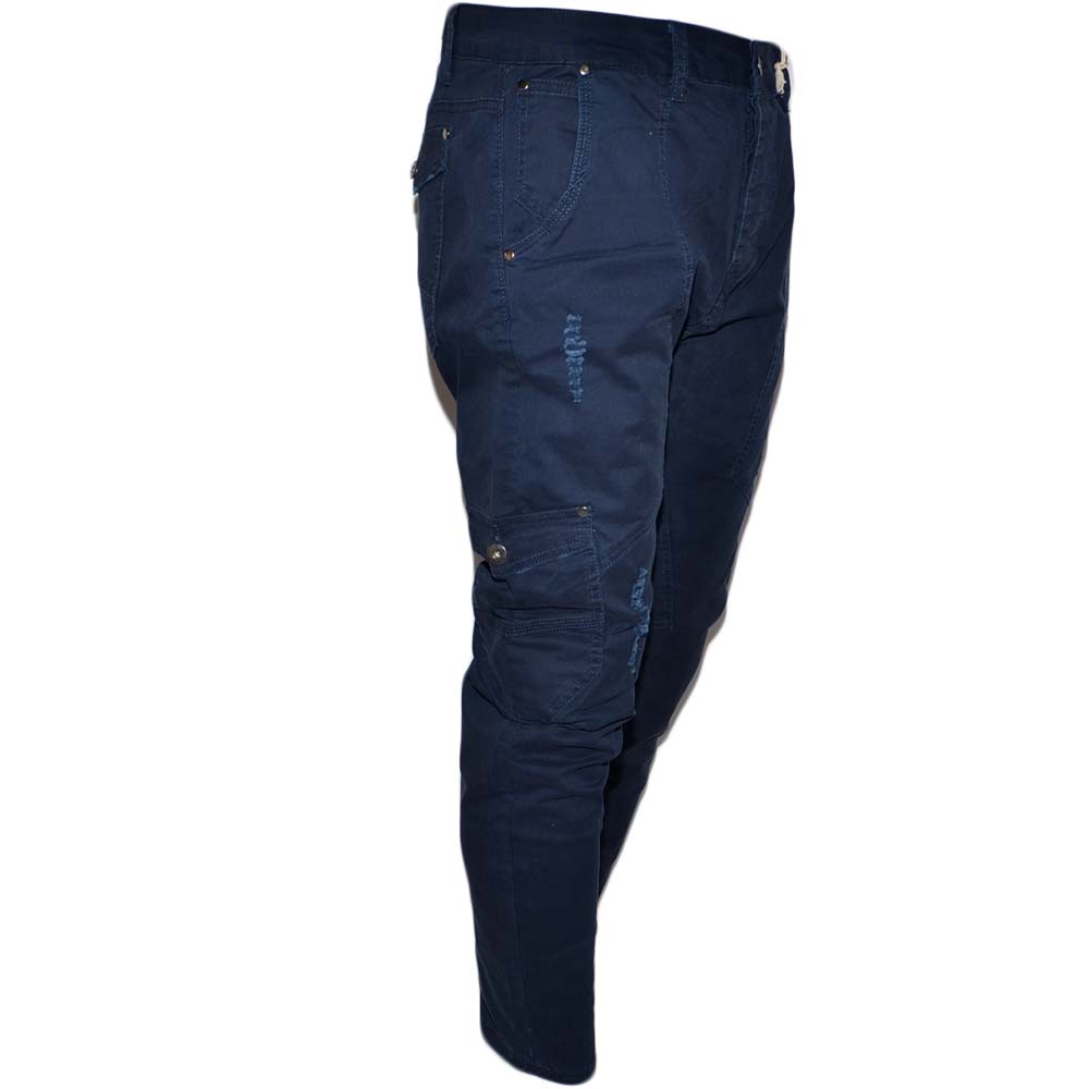 Pantaloni cargo uomo blue jeansato con tasconi laterali strappi bottone in vita con laccio comodo casual moda militare