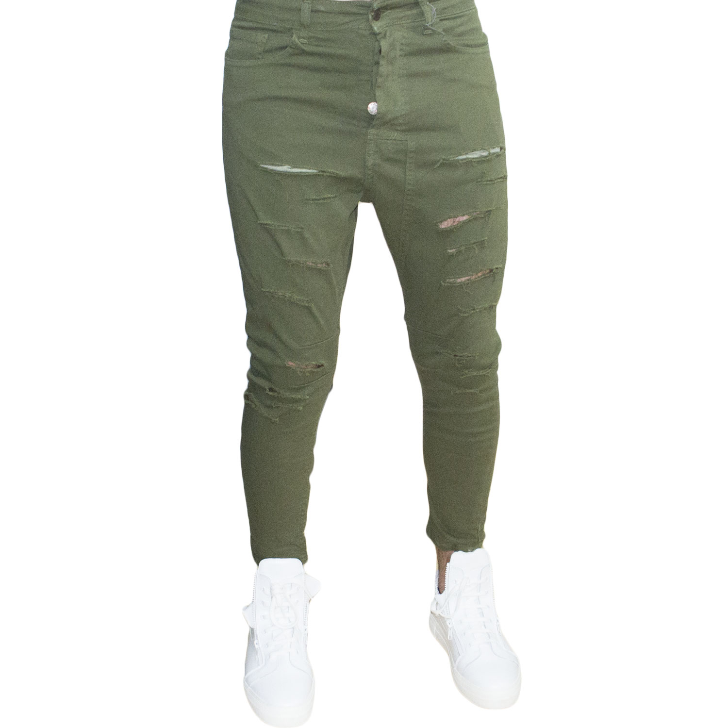 Jeans uomo verdi denim lavaggio graduale slim fit a cavallo basso 4 tasche con strappi elasticizzato tendenza.