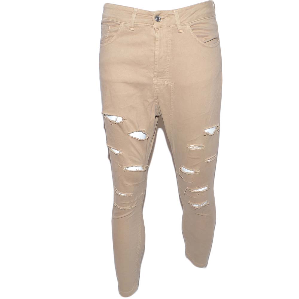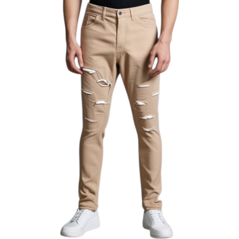 Pantaloni uomo beige camel chino con strappi slim fit in cotone tinta unita linea giovane elasticizzato