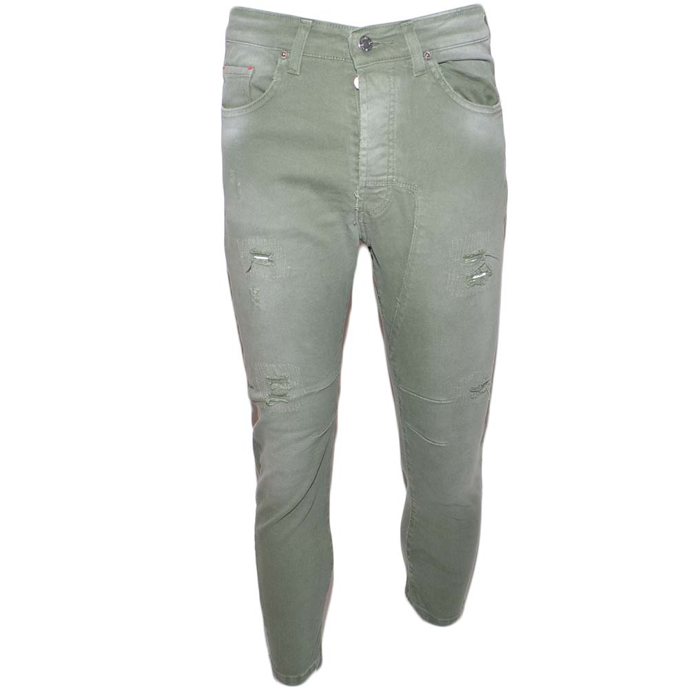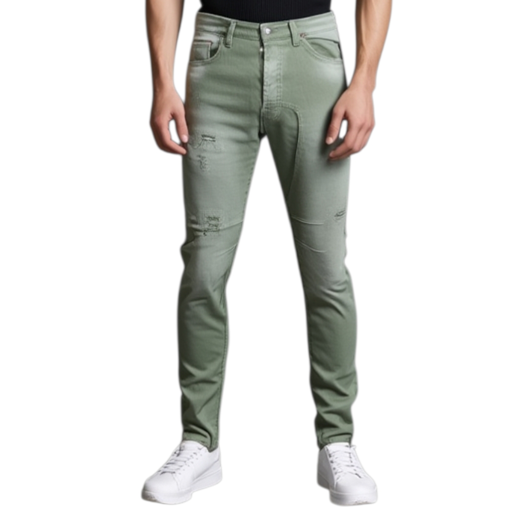 Jeans uomo verdi denim lavaggio graduale slim fit a cavallo basso 4 tasche con strappi elasticizzato tendenza