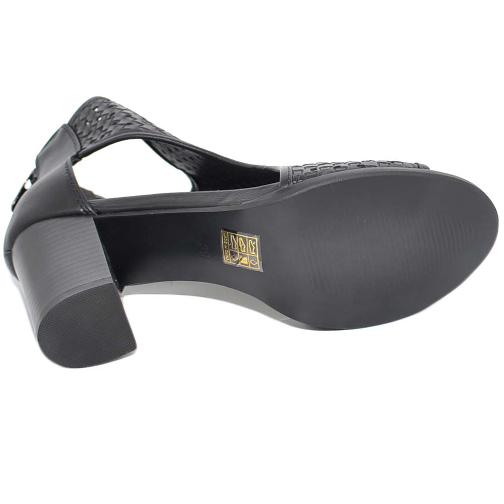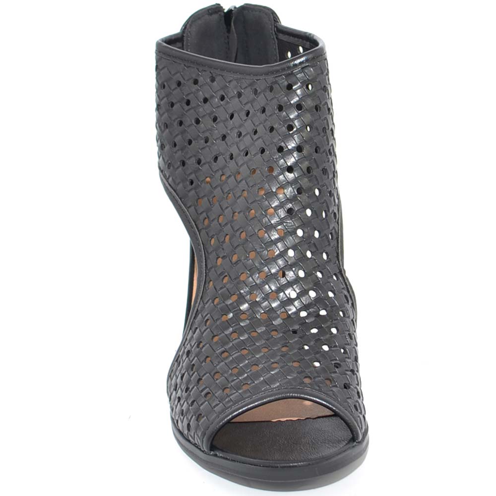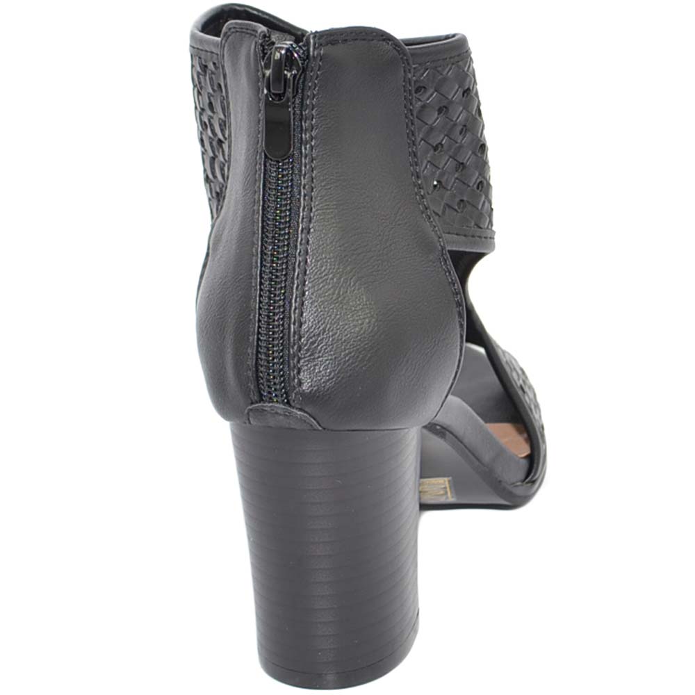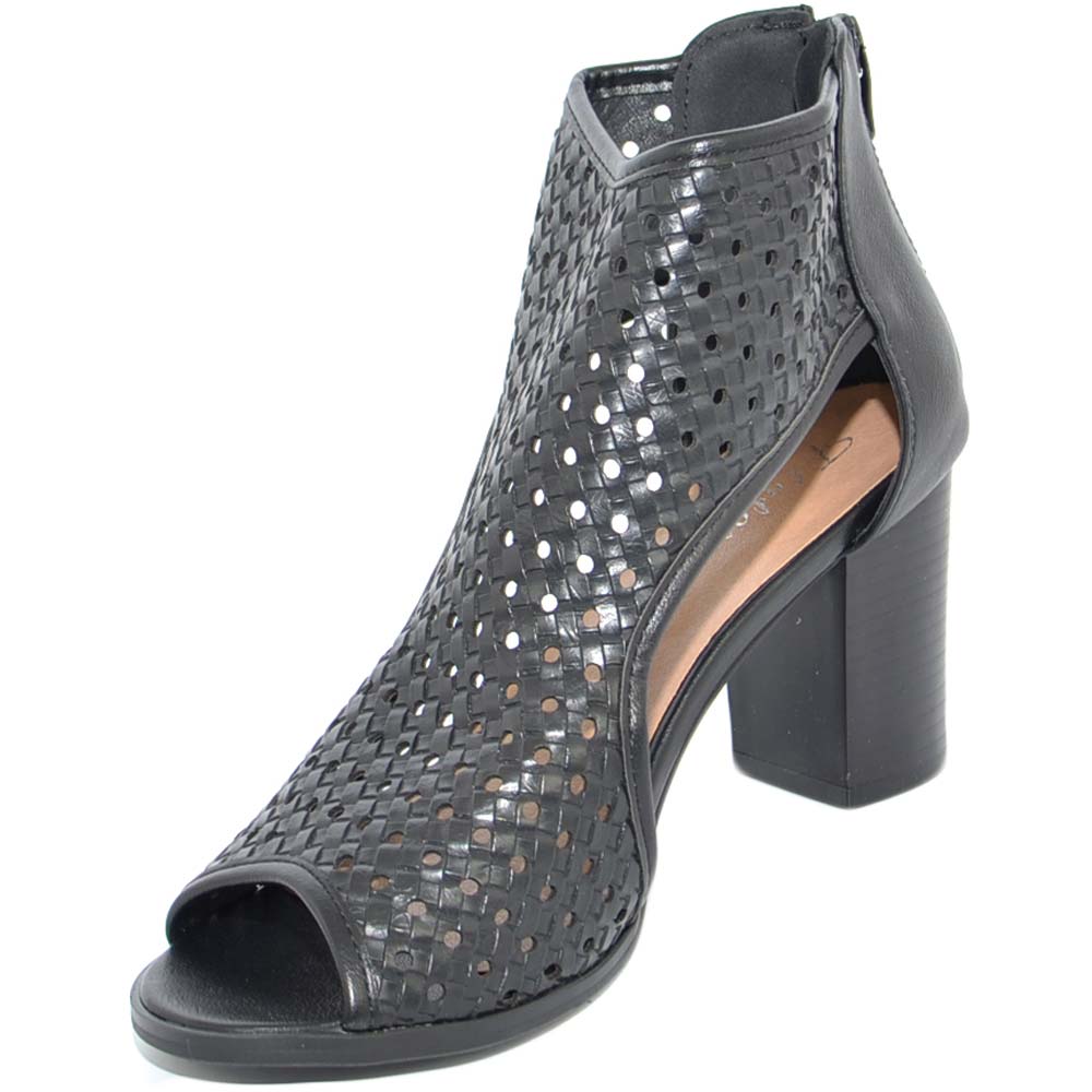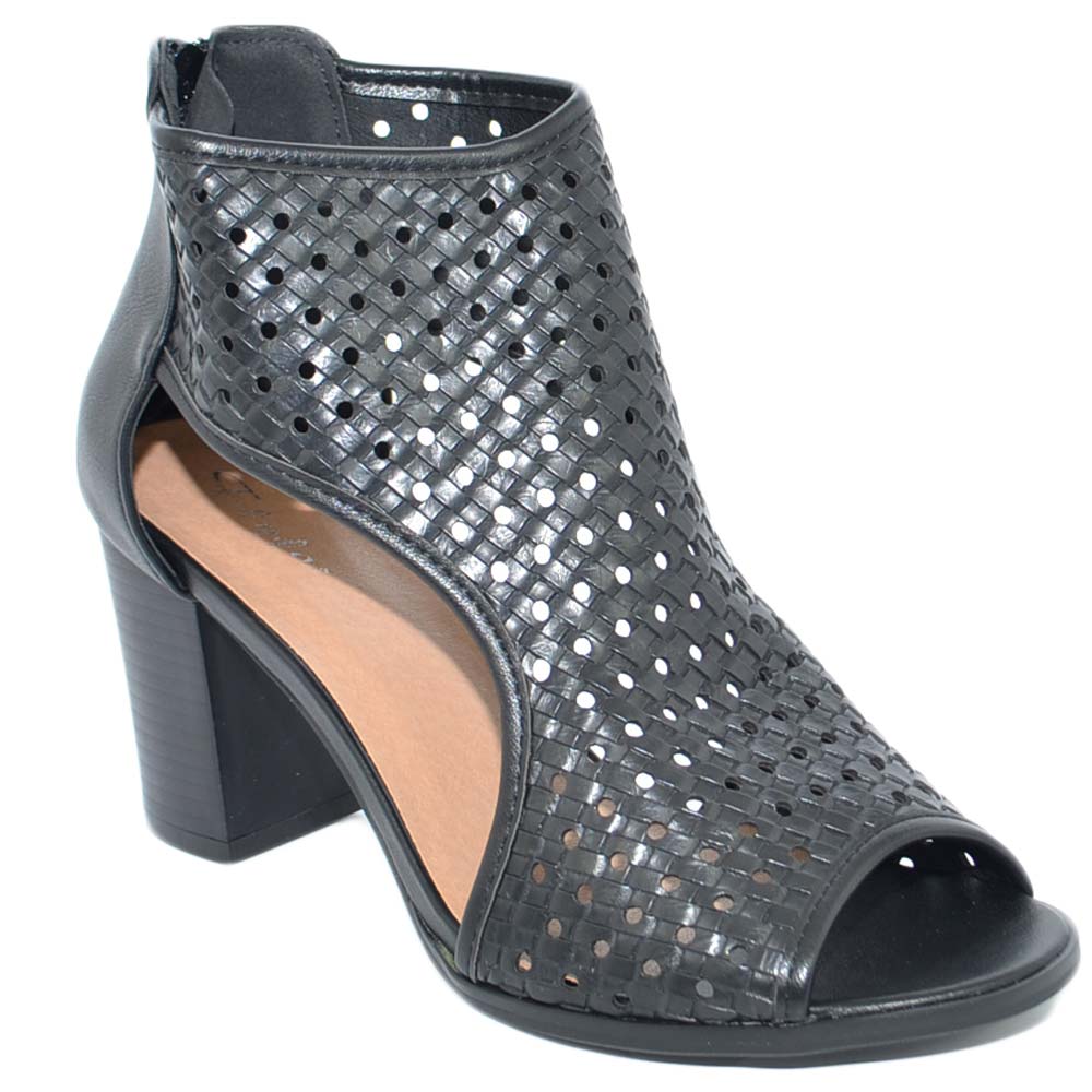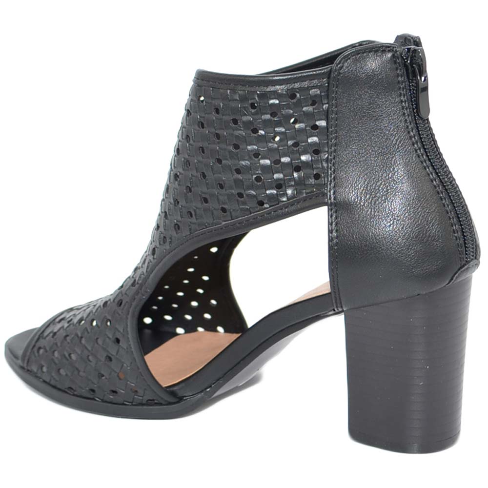 Tronchetto donna estivo nero con tacco largo comodo aperto ai lati traforato open toe spuntato con zip