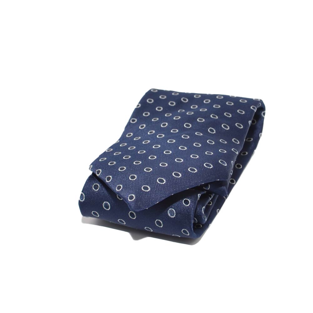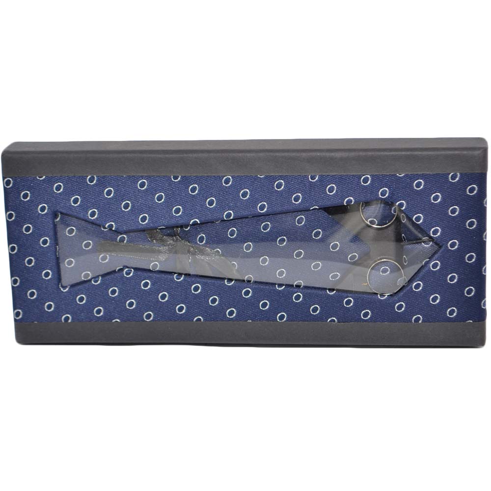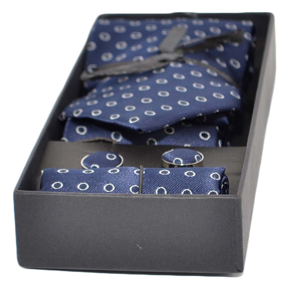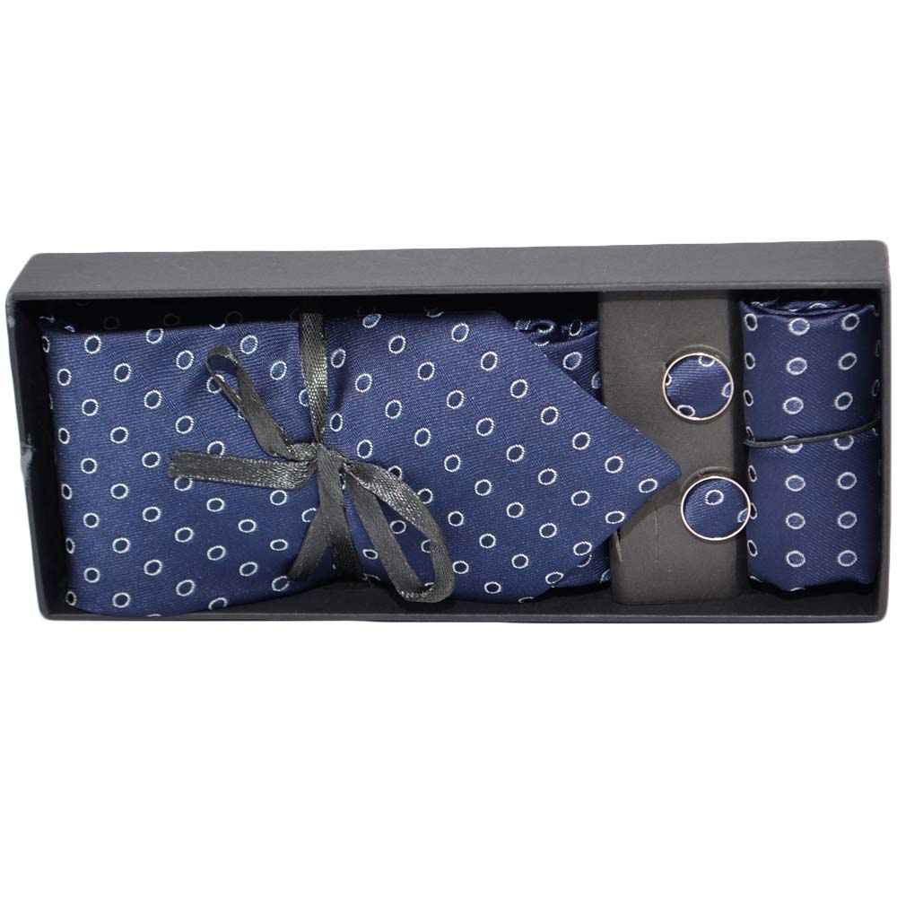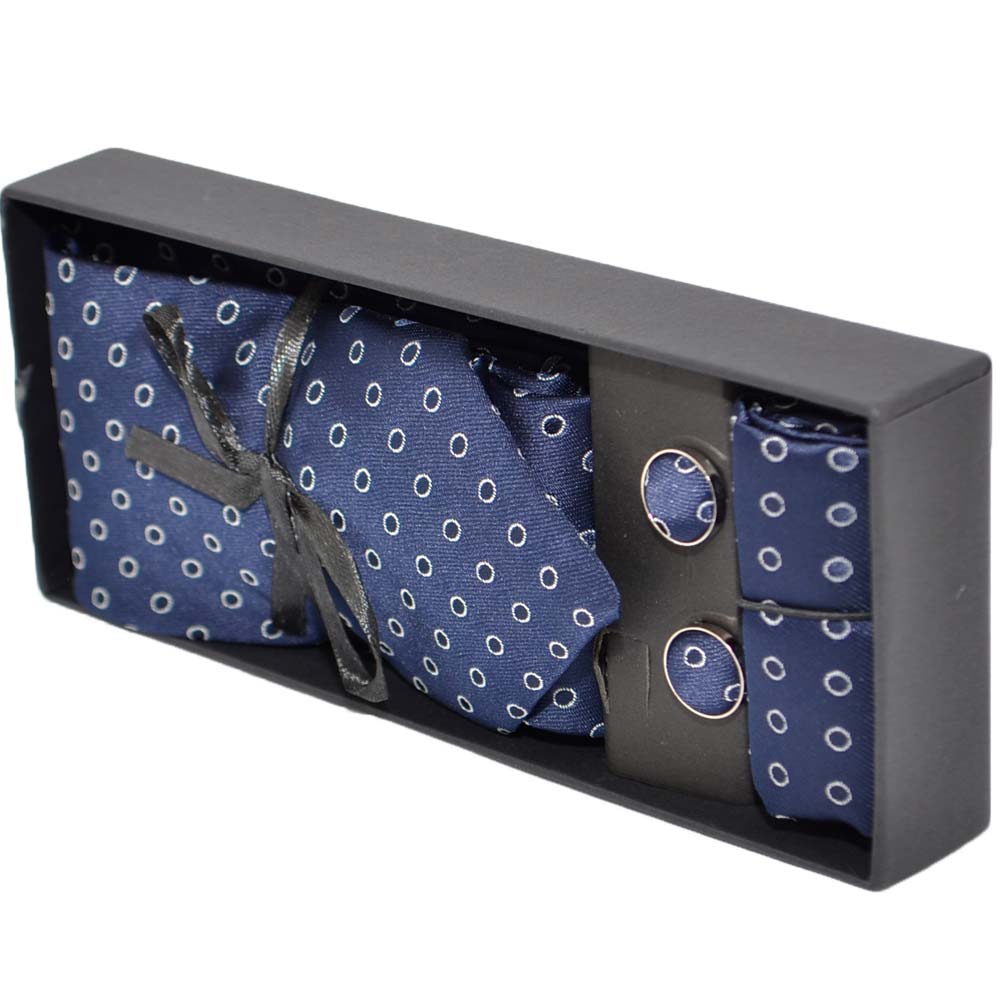 Set cravatta pochette e gemelli in raso blu a pois confezione regalo per professionisti e collezionisti.