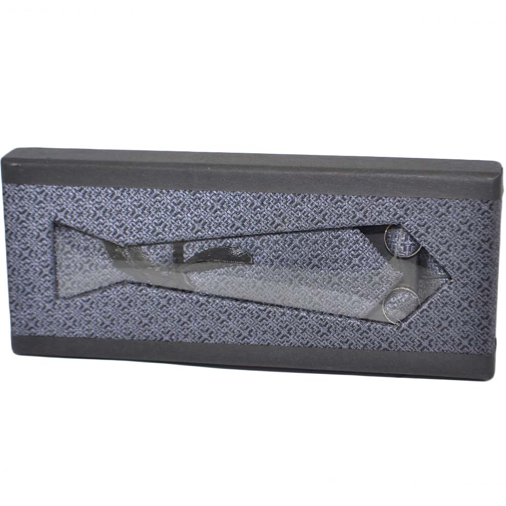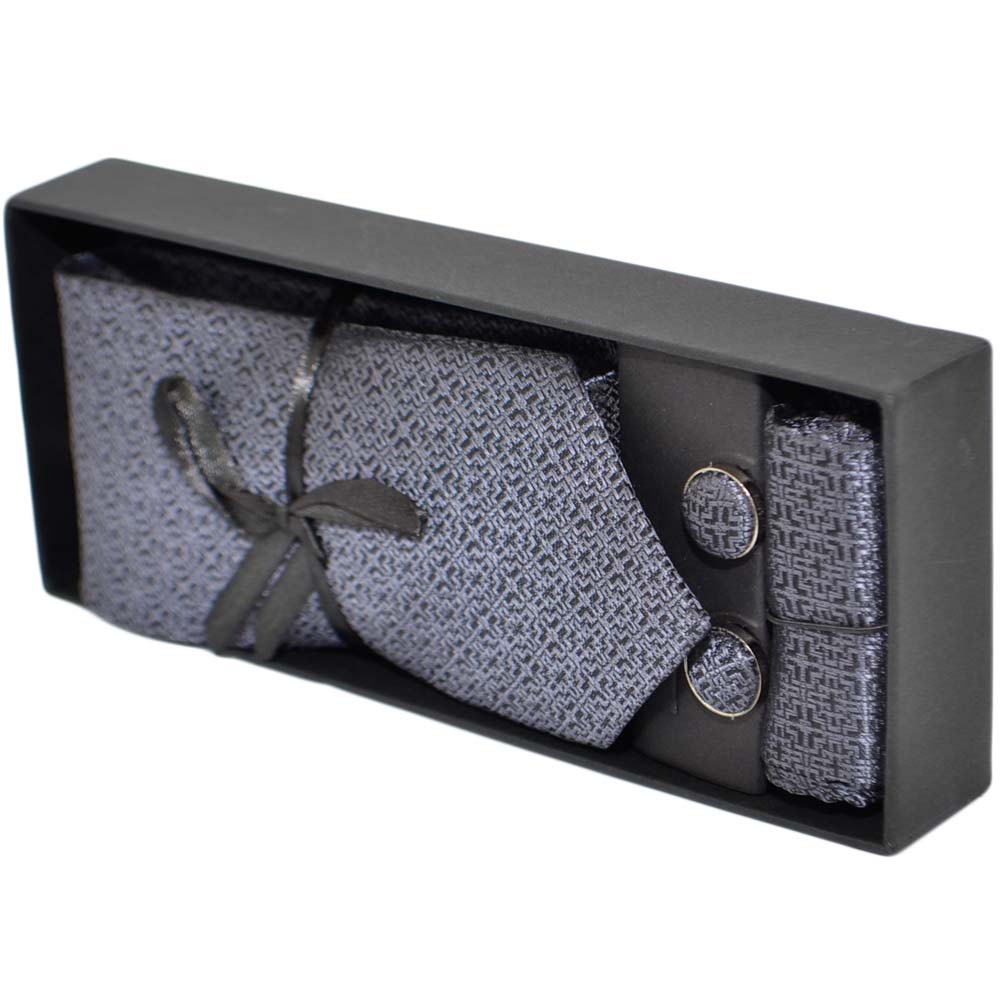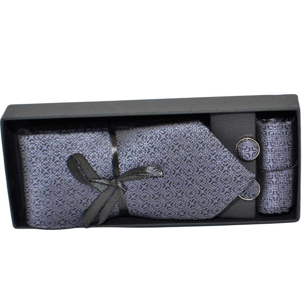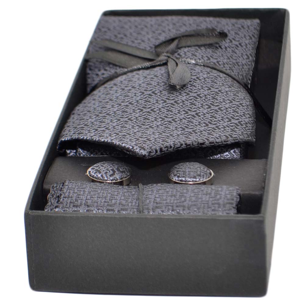 Set cravatta pochette e gemelli in cotone grigio con dettagli neri confezione regalo per professionisti e collezionisti