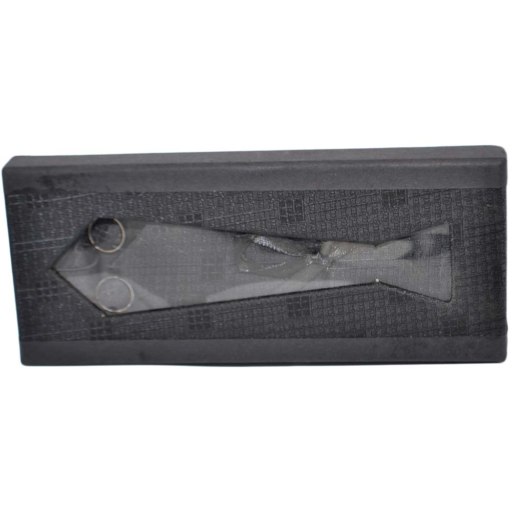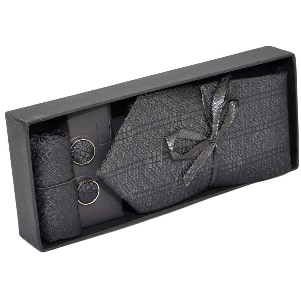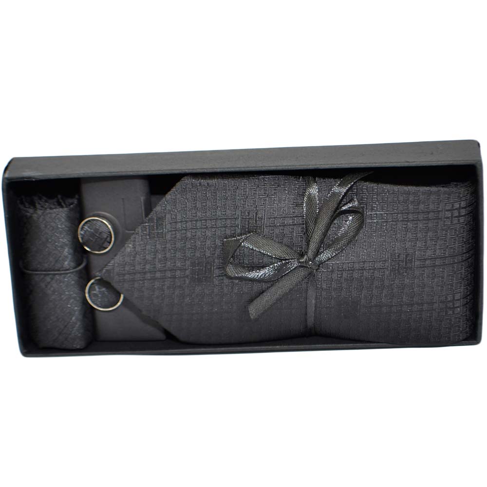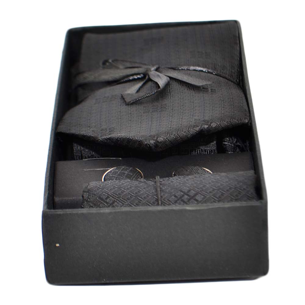 Set cravatta pochette e gemelli in cotone nero con dettagli tono su tono confezione regalo per professionisti