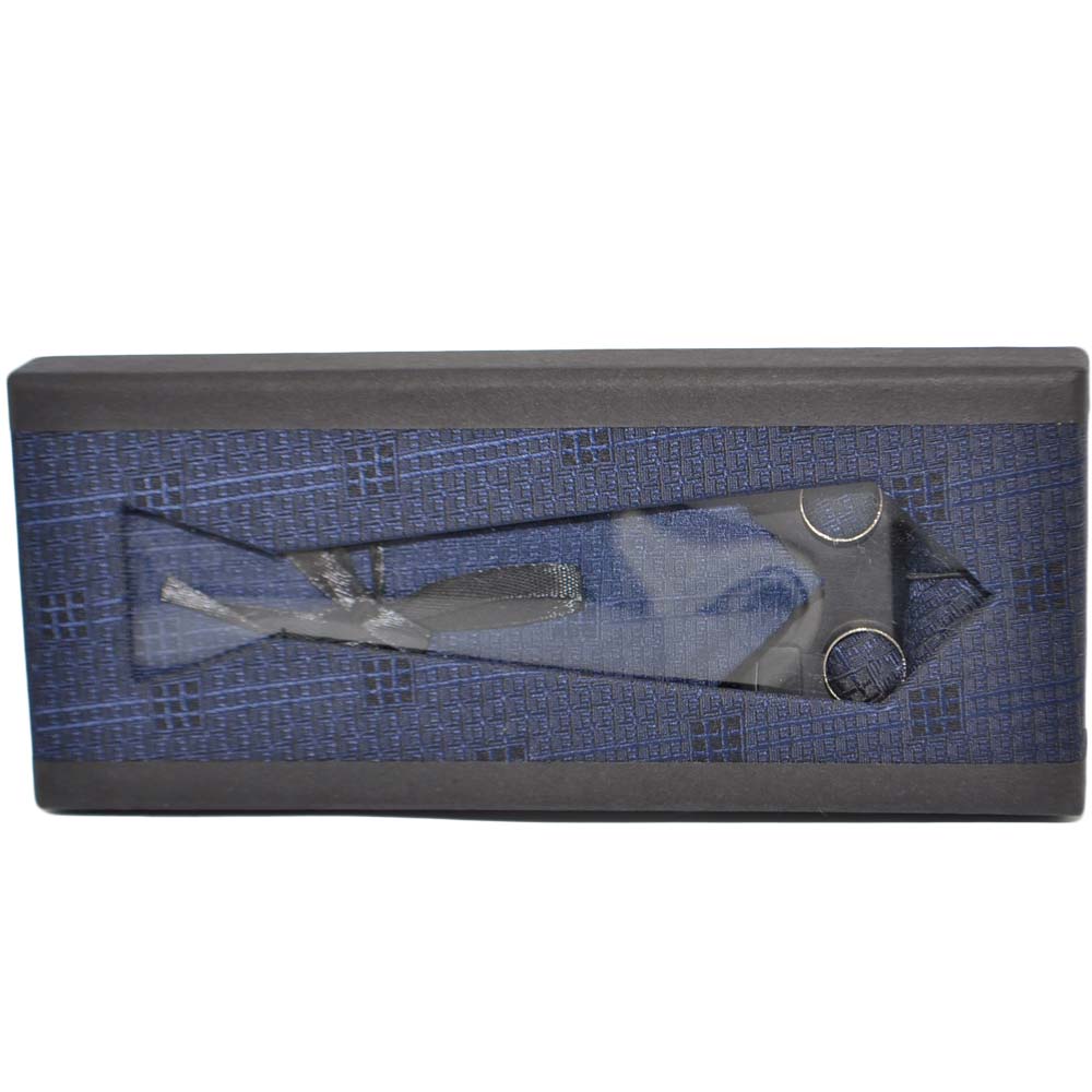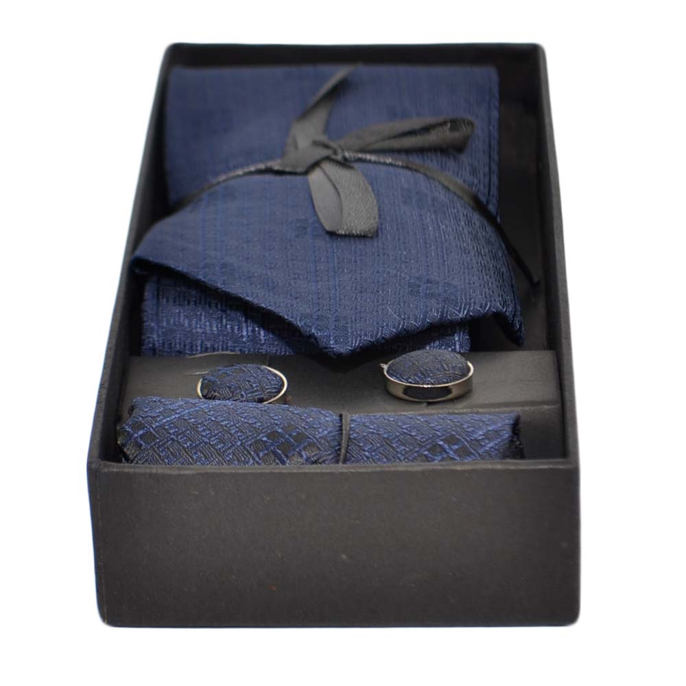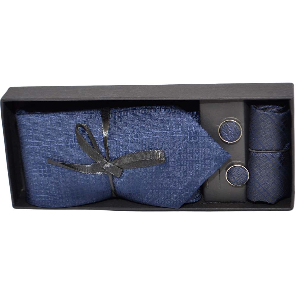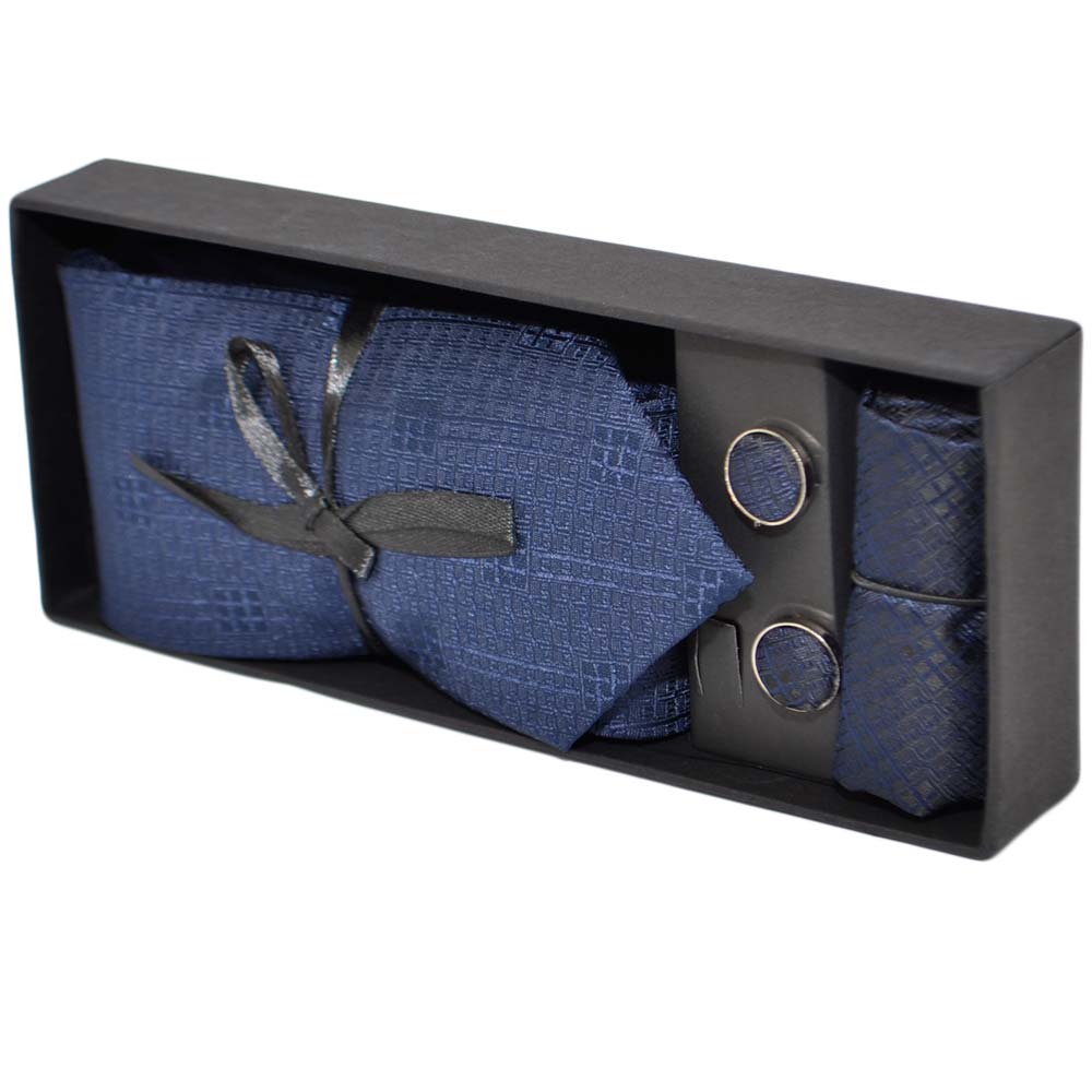 Set cravatta pochette e gemelli in cotone blu con dettagli tono su tono confezione regalo per professionisti