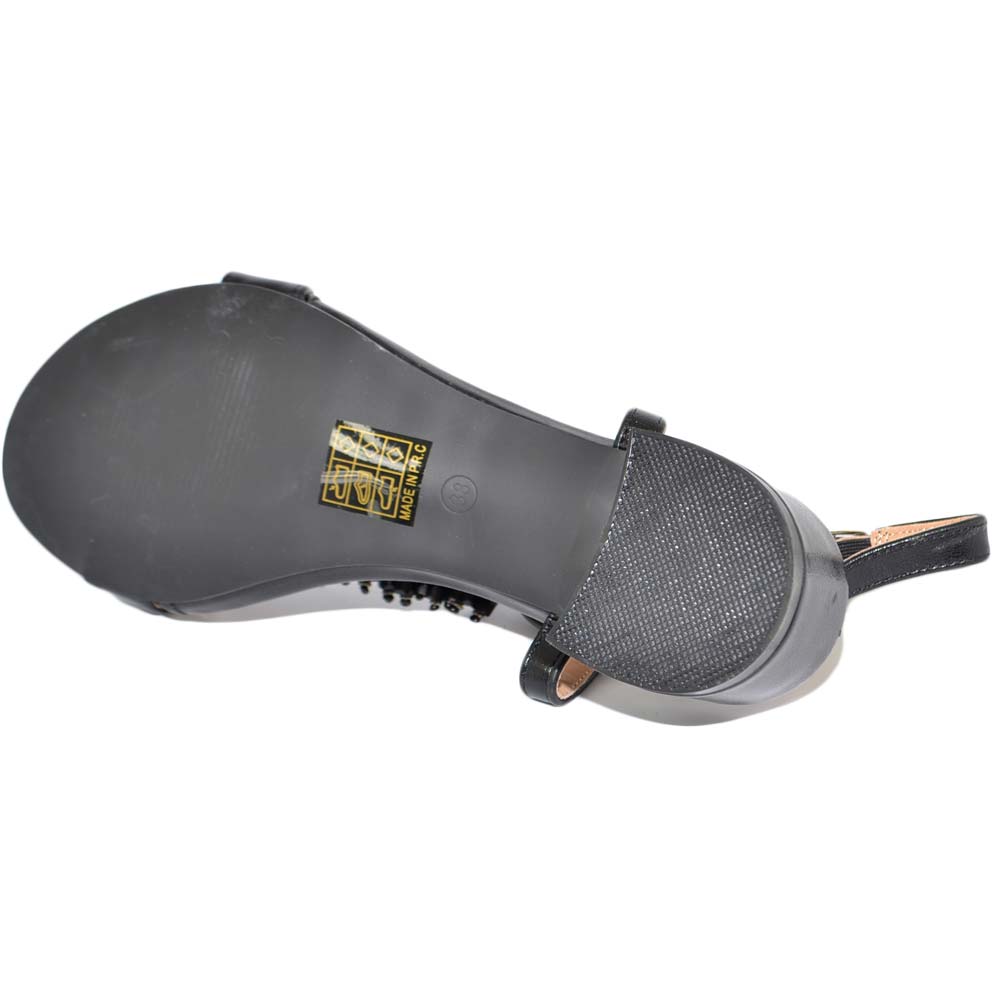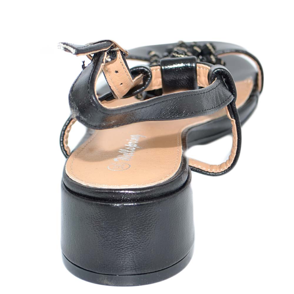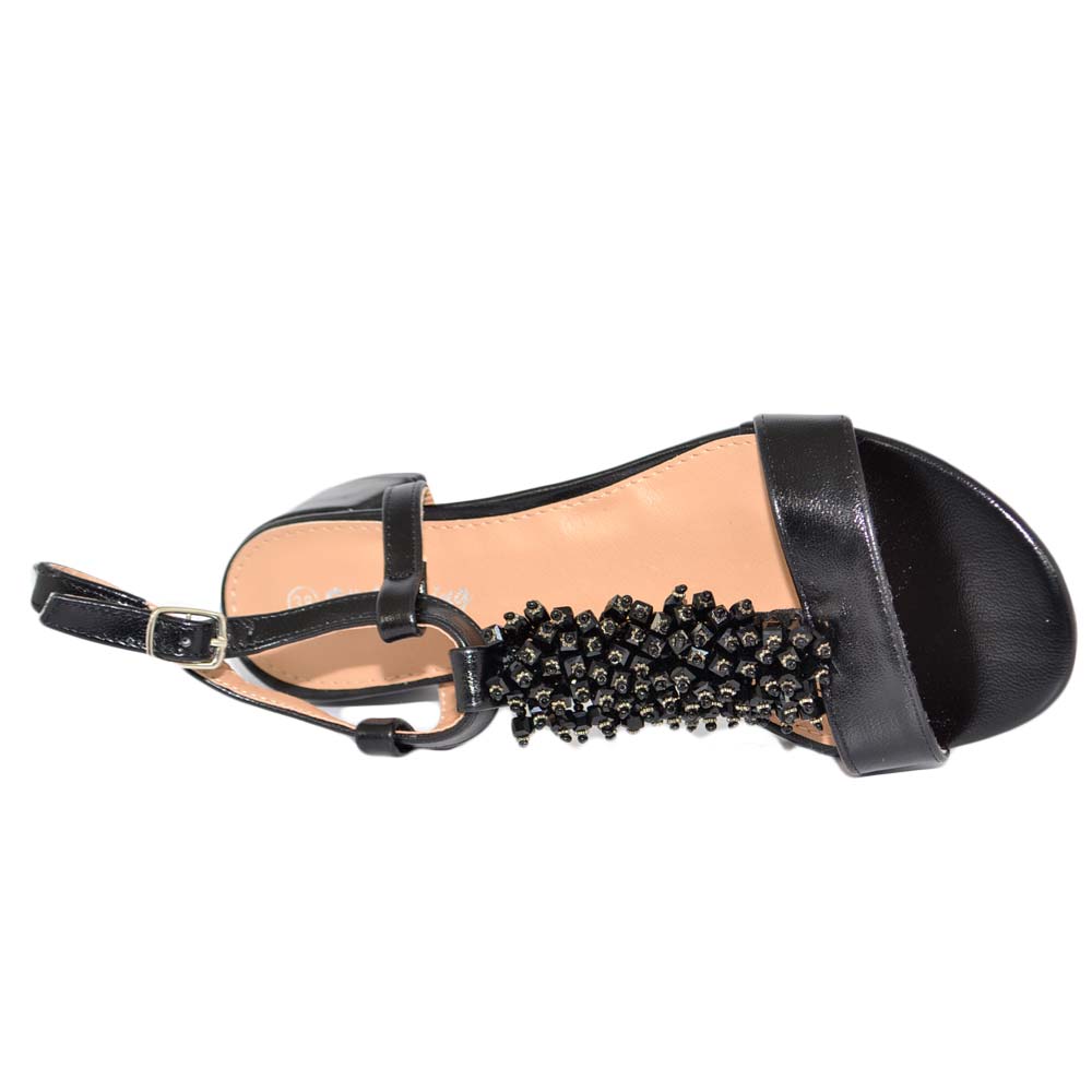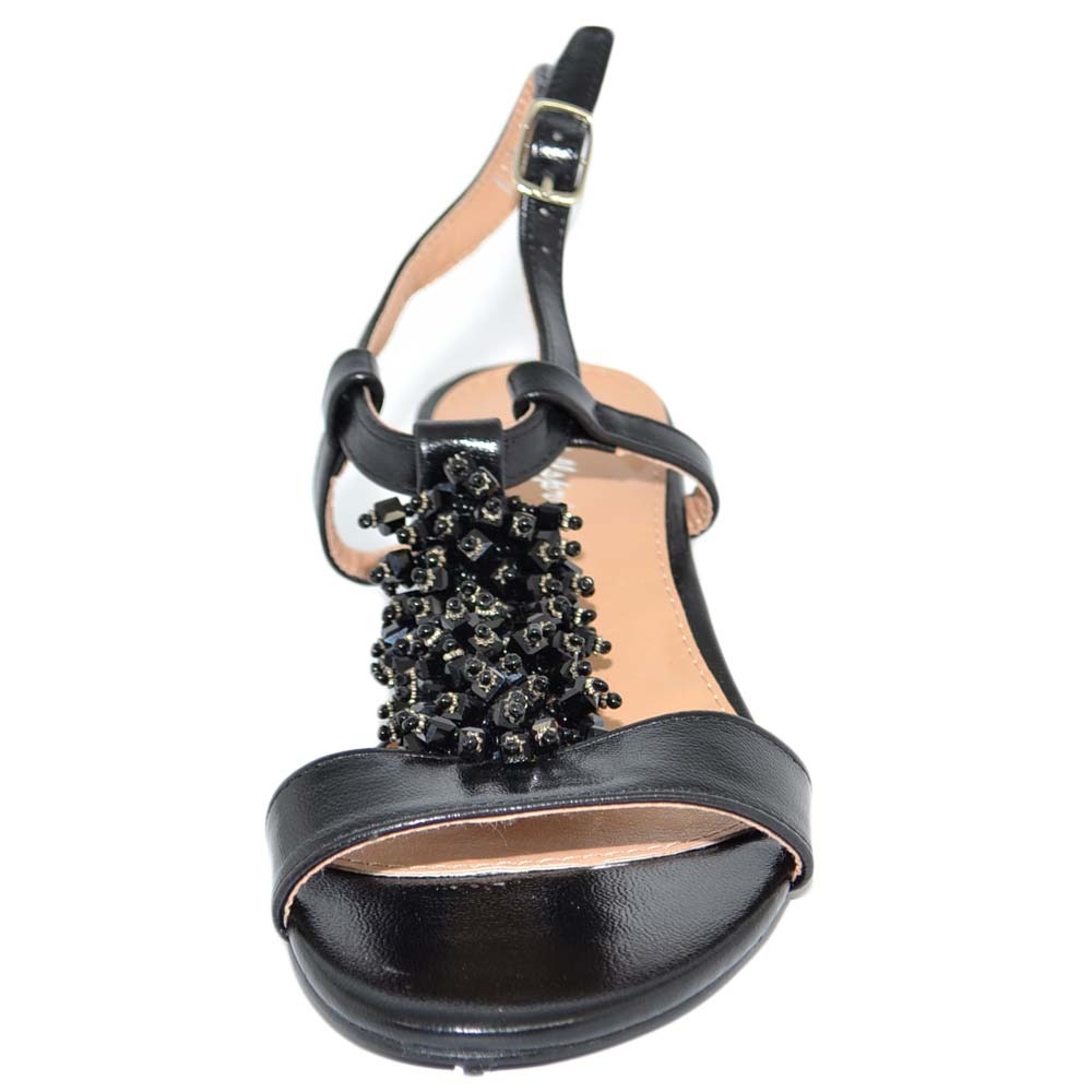 Sandalo basso donna nero con tacco basso fascette incrociate con applicazioni perline anni 30 comodo elegante