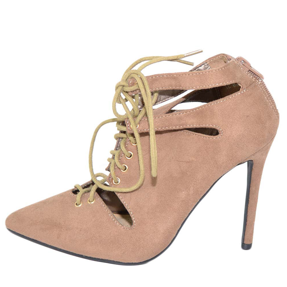 Decollete a punta taupe con tacco a spillo stringata fasciata con cinturino alla caviglia piede fermo moda glam