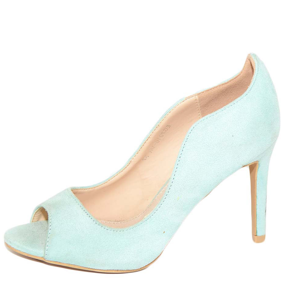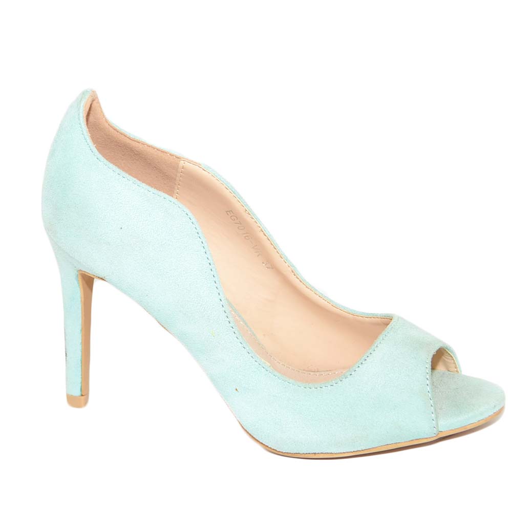 Sandalo donna spuntatIna polvere camoscio tacco a spillo 10 ondulata ai lati azzurra open toe moda donna