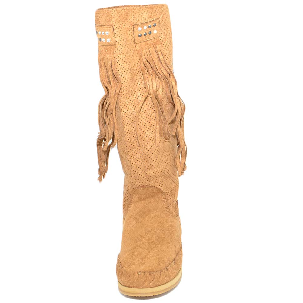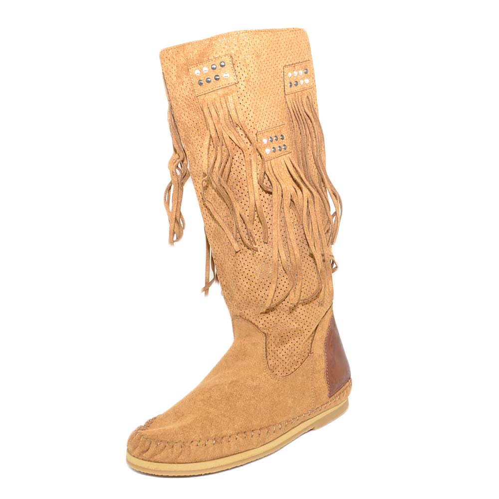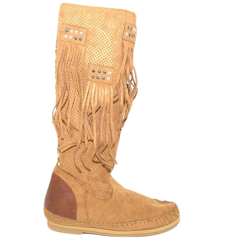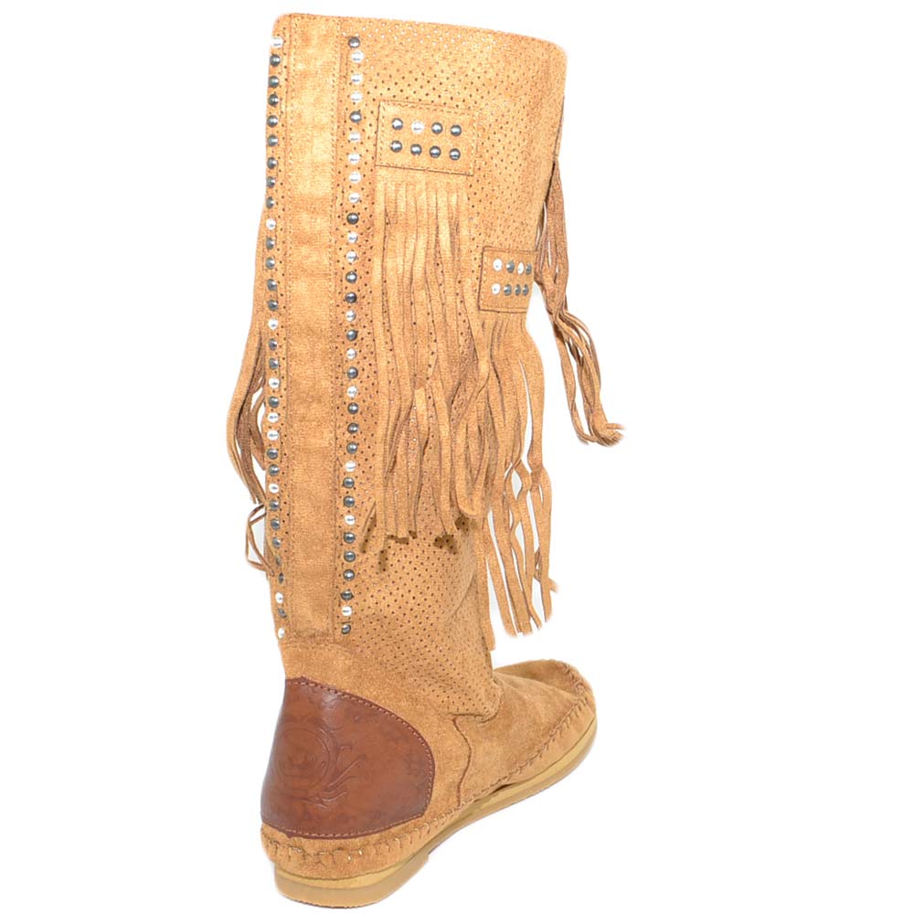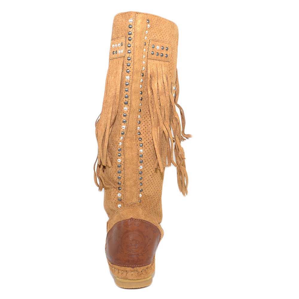 Stivali donna estivi indianini cuoio marroni forati freschi con frange e borchiette fondo in gomma e paglia moda