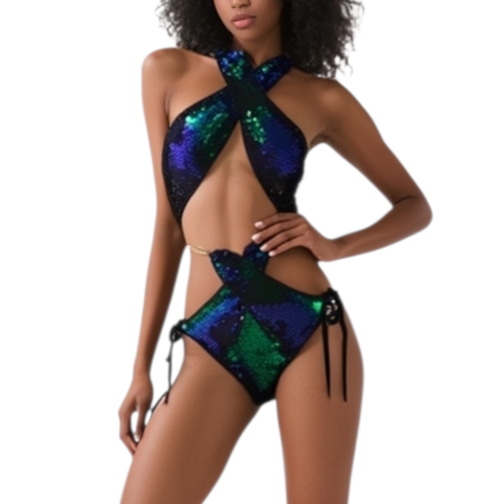 Costume bagno donna bikini swimwear fascia incrociata con joker nero verde sirena slip brasiliana coordinato regolabile