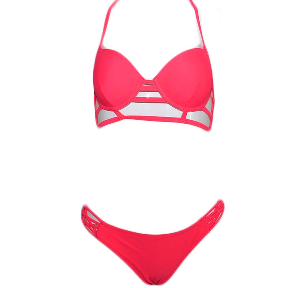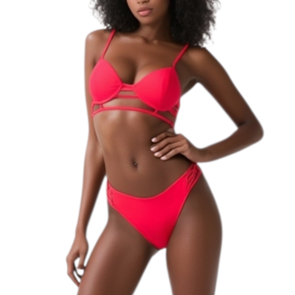 Costume da bagno donna bikini corallo swimwear con slip coordinato e top bralette lungo effetto corsetto push up