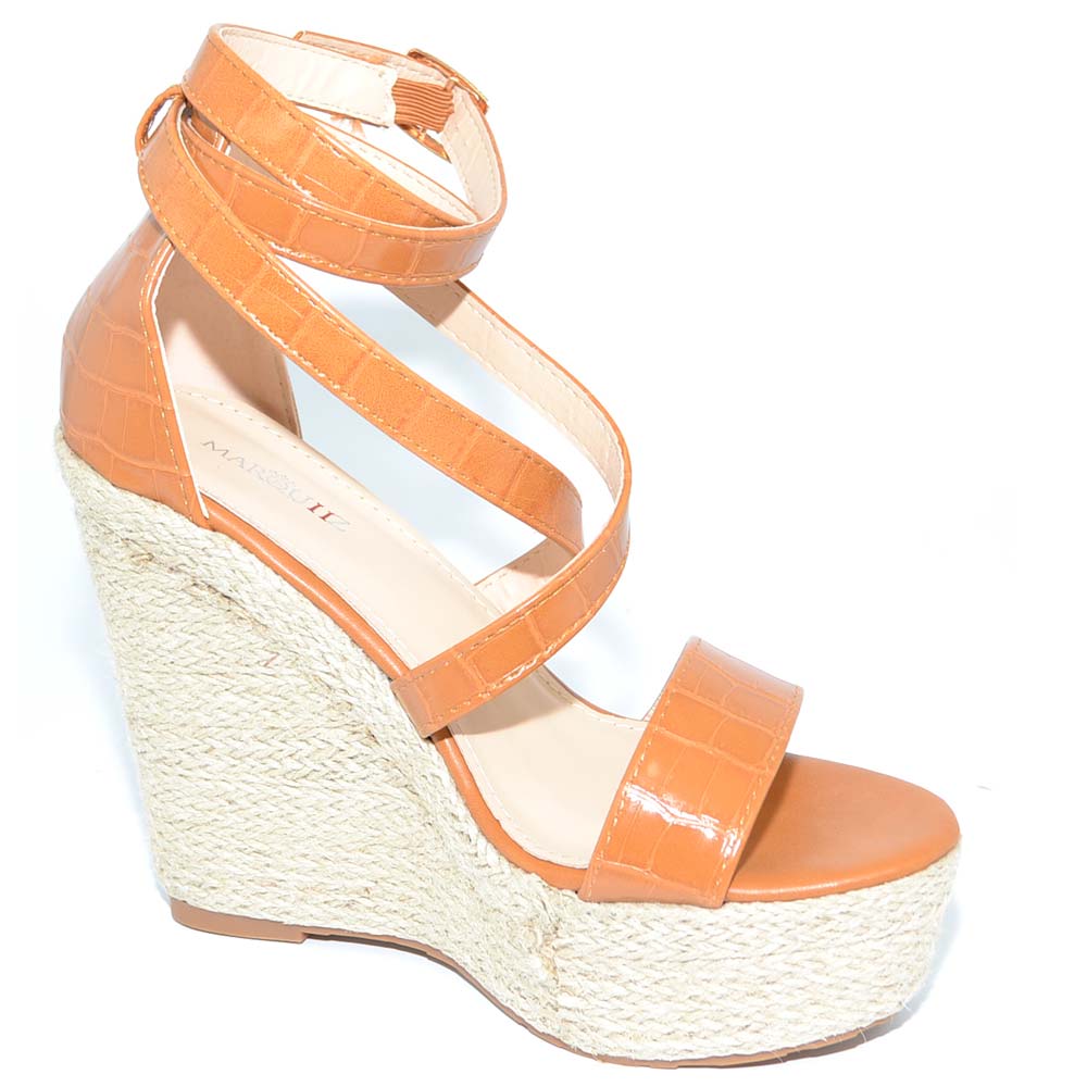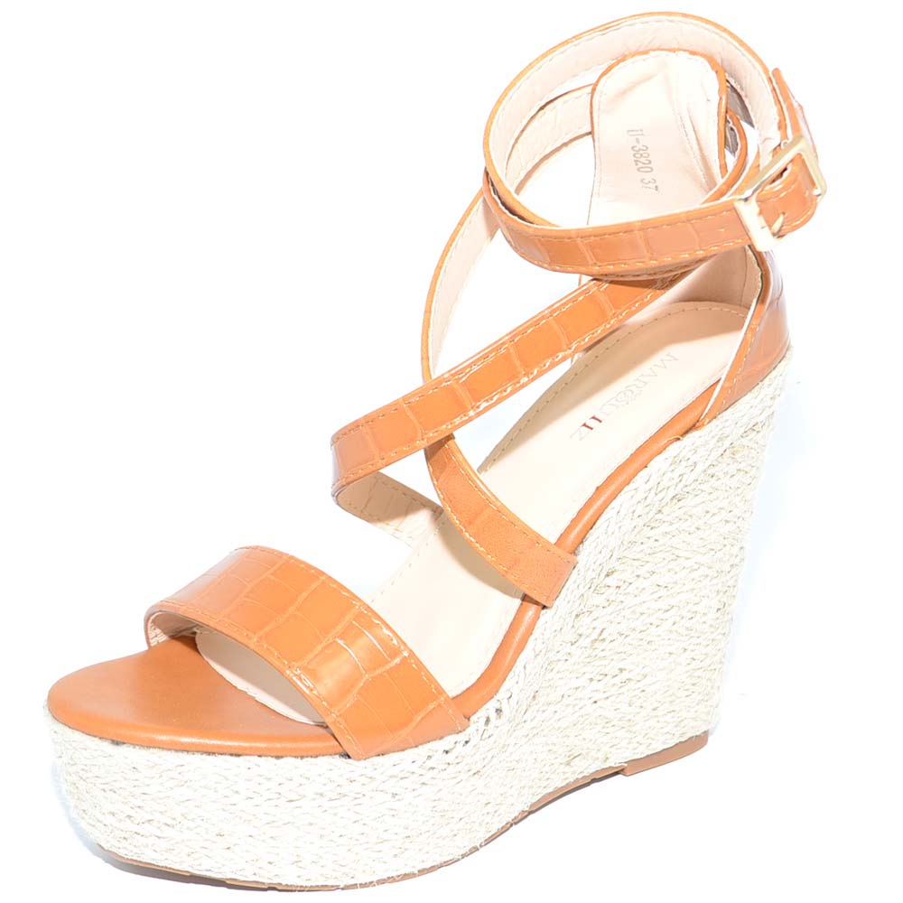 Il sandalo zeppa da donna è un modello realizzato in tessuto con fasce incrociate avvolgenti all'avampiede. L'interno e il sottopiede sono in comodo tessuto, la suola è in gomma con zeppa in corda alta 8 cm, la chiusura con cinturino regolabile al tallone rende pratica la calzata. Un sandalo alla moda e confortevole, bello per le estati della donna trendy e femminile.